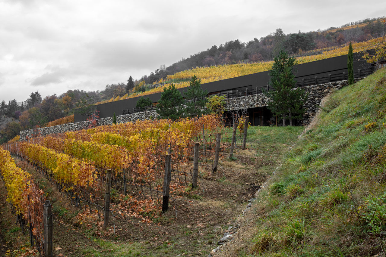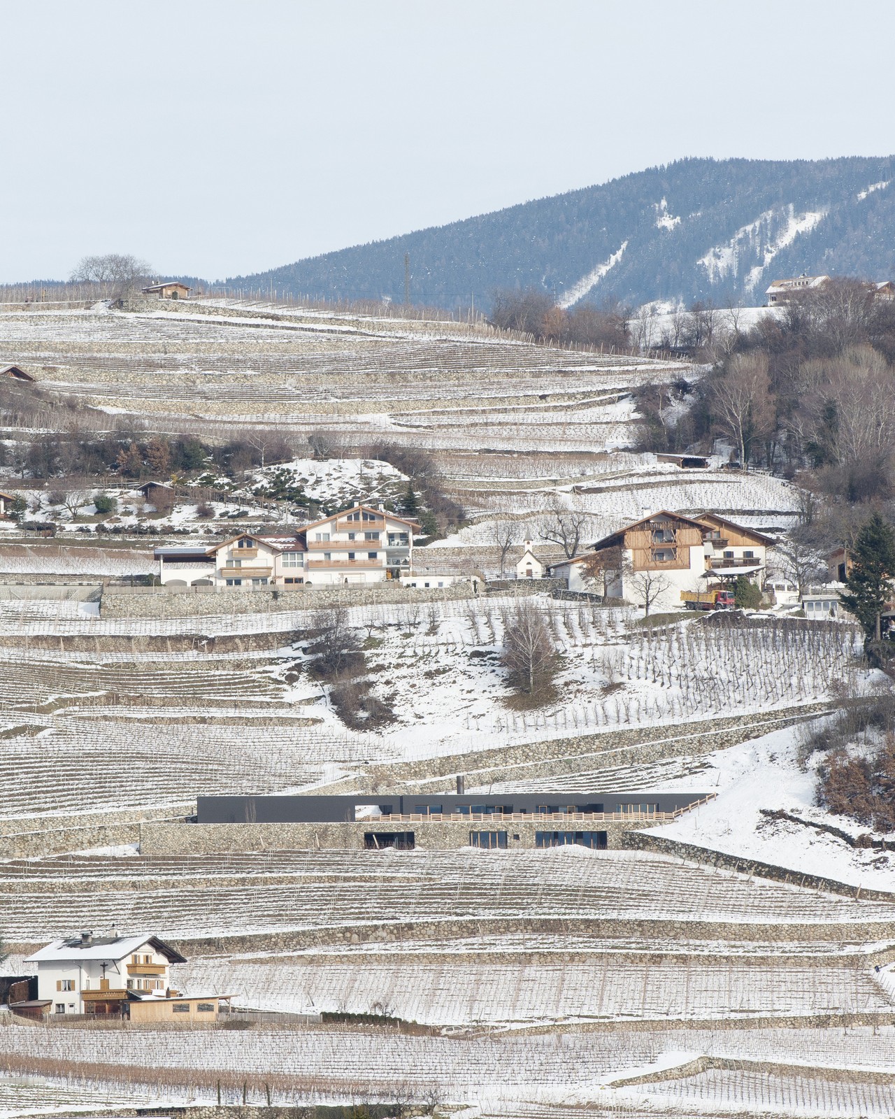 The villa was built in keeping with the surrounding landscape in Italy that included natural stone and slanted fields. Italian firm Bergmeister Wolf Architekten designed the building to be the place of work and residence of a winemaker. The house, which is located within the slope, is composed of two floors. The lower level is a working space with three large openings, viewing the vineyard, while the upper level includes the bedrooms which are designed in a minimalist style using wood, stone, glass, and concrete.