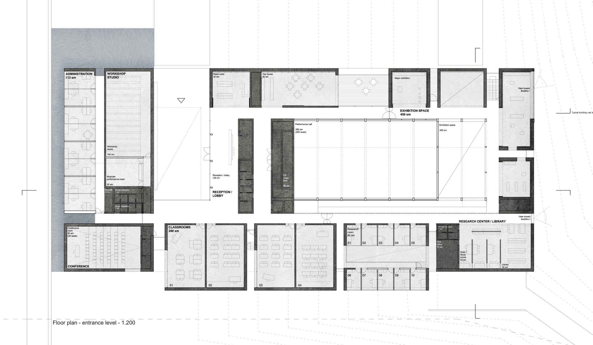 Its program was left “flexible”which is a term architects use to make it look like the user will come up with the programme as they use the sapce, however they deem appropriate. In all honesty, these open spaces will either be empty and cold or used socially inappropriately.