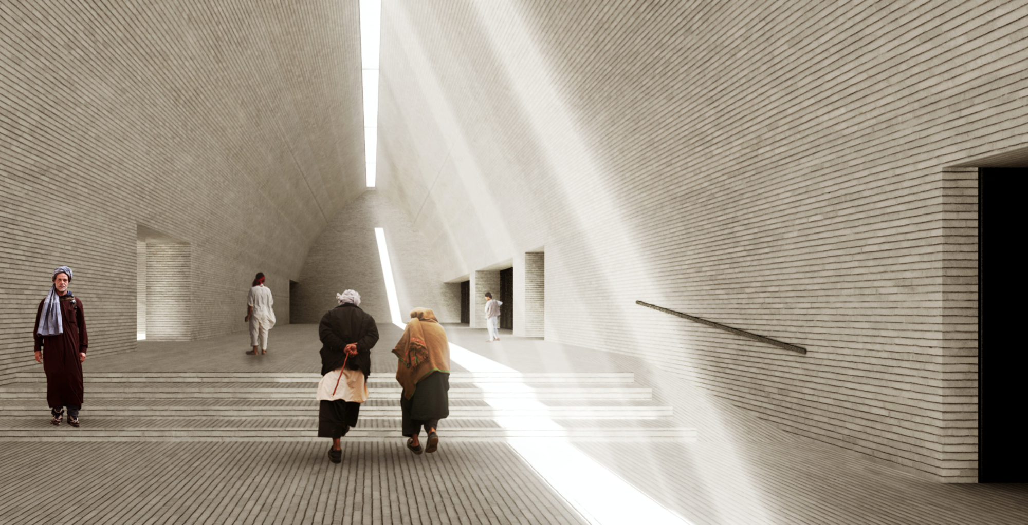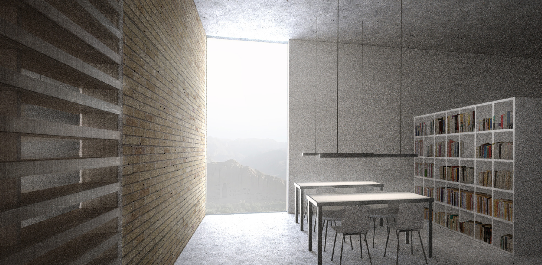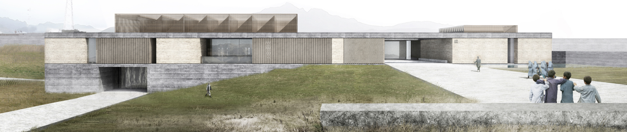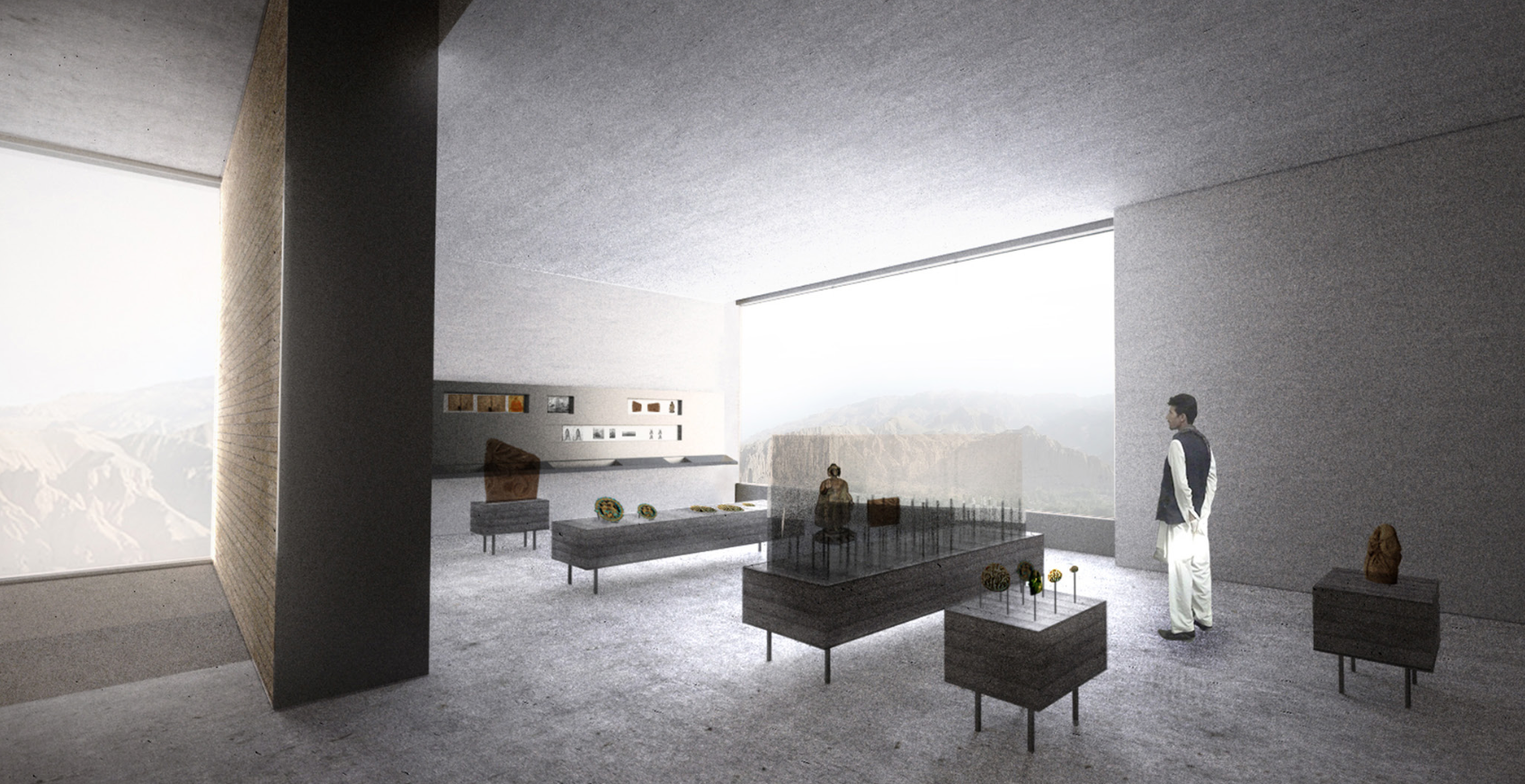 The cultural centre, being a succession of exhibition spaces that lead nowhere in particular, is clad with what appears to be concrete panels framing outward vistas of the Bamiyan Valley and Buddah Hills. users are encouraged to access the roof of the structure for them to enjoy an uniterrupted view of the landscape, even MORE open space for the user to feel uncomfortably minute in.
