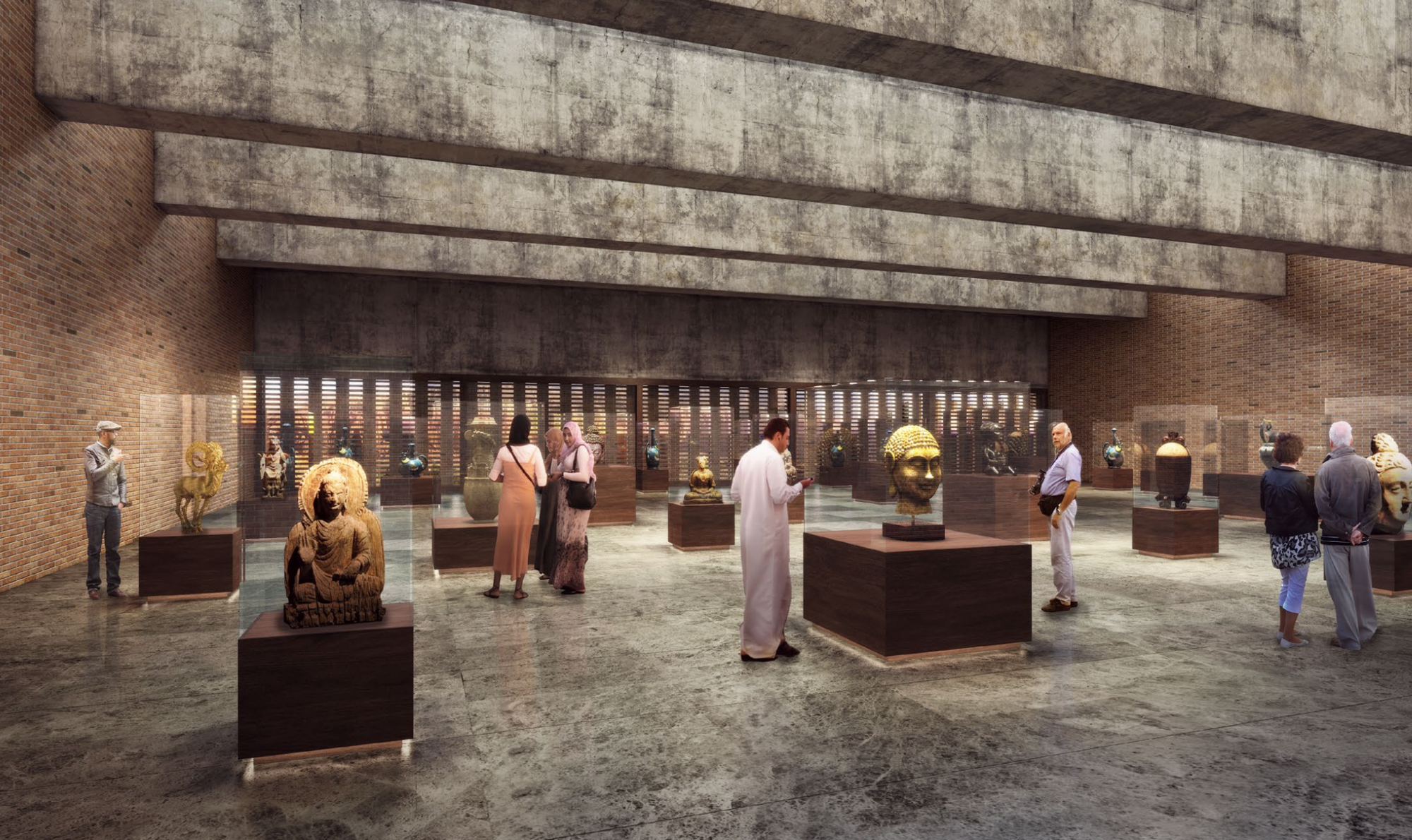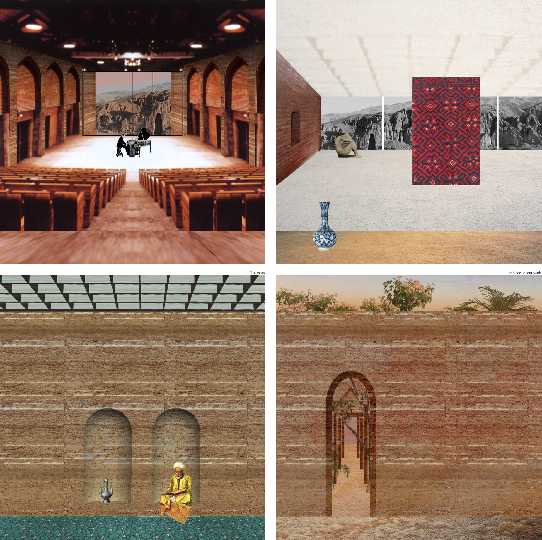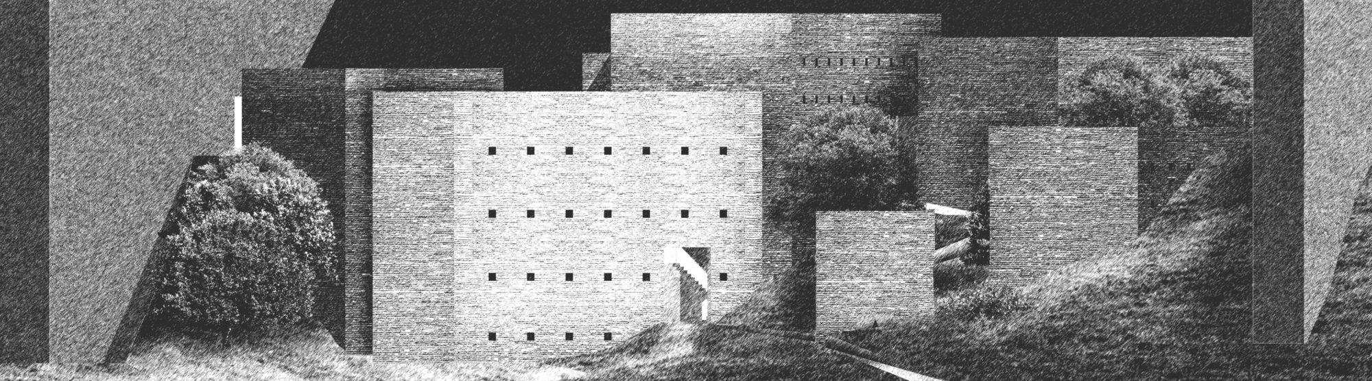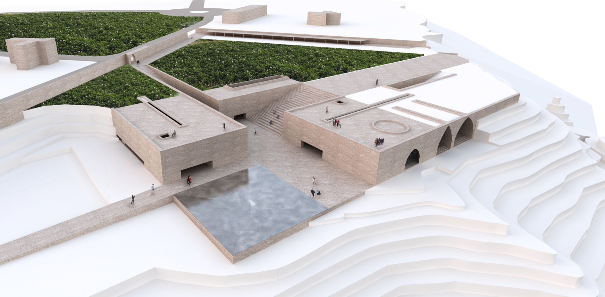The cultural centre, being a succession of exhibition spaces that lead nowhere in particular, is clad with what appears to be concrete panels framing outward vistas of the Bamiyan Valley and Buddah Hills. users are encouraged to access the roof of the structure for them to enjoy an uniterrupted view of the landscape, even MORE open space for the user to feel uncomfortably minute in.