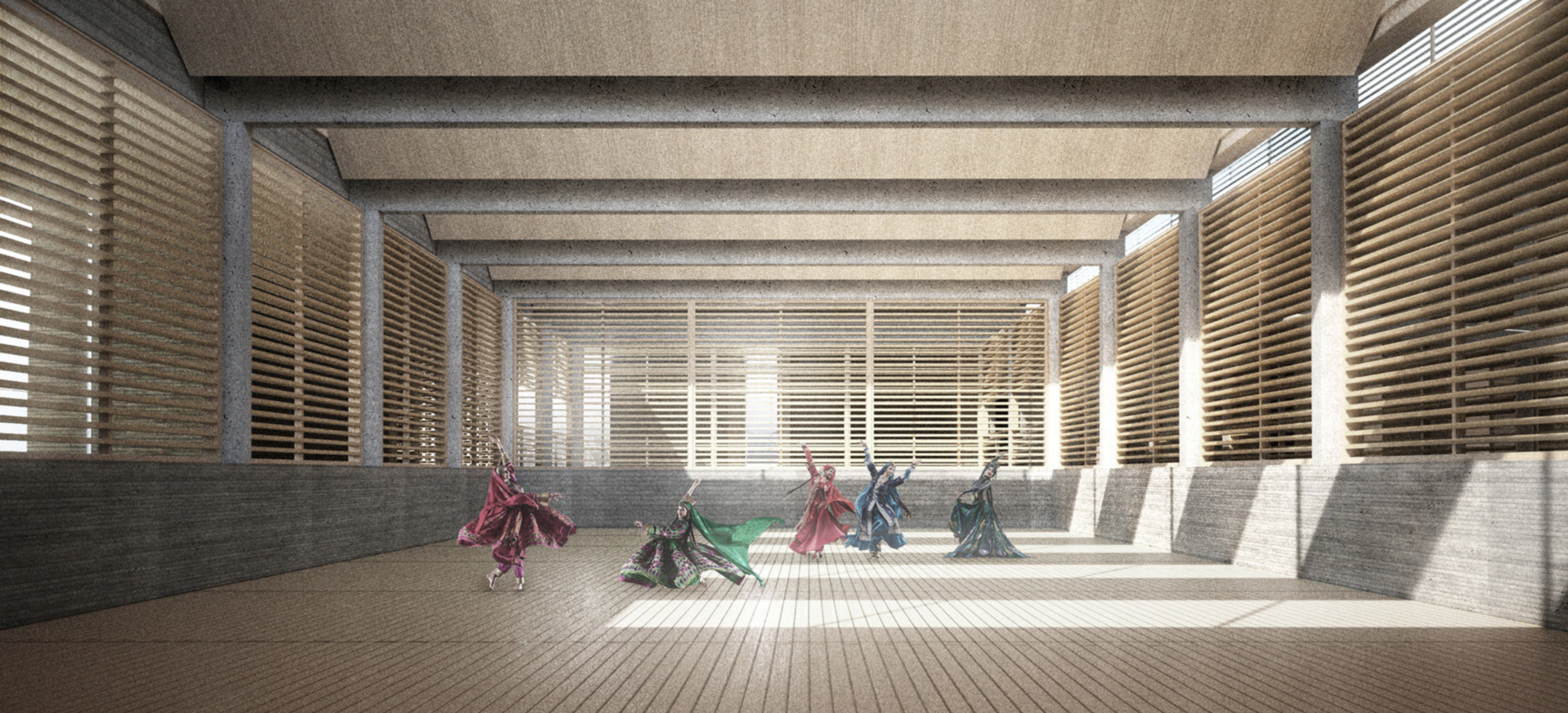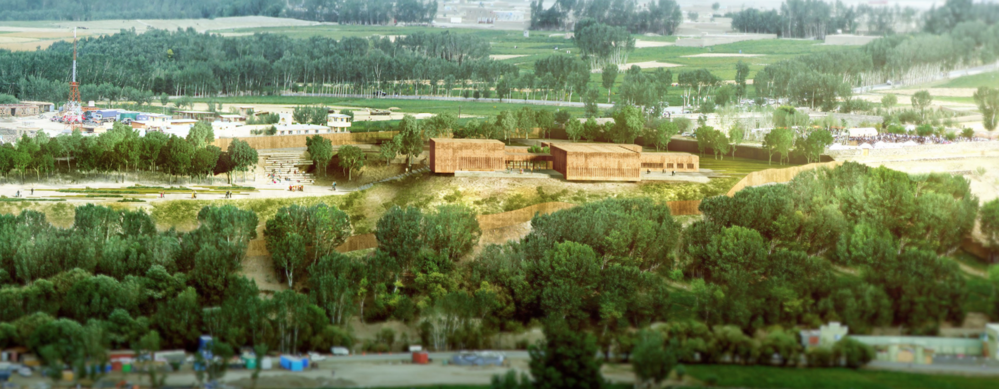 Set out like a piece of string lain upn a rocky steppe on arid land, this fluid concrete structure houses the cultural centre for Afghanistan. This rope-like structure encloses a re-imagined amphitheatre, its stage the lowest level of the natural landscape and the seating arranged on the naturally rising steppes.