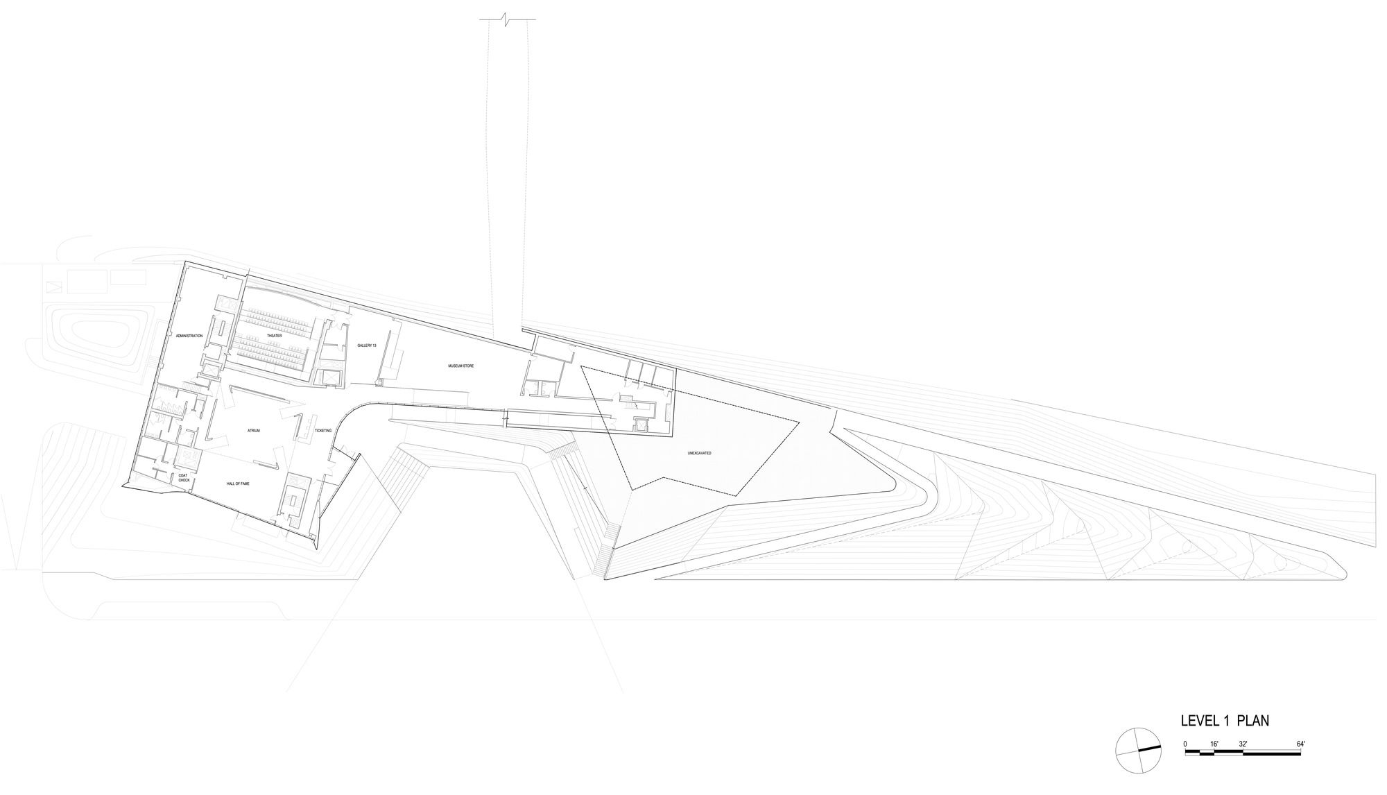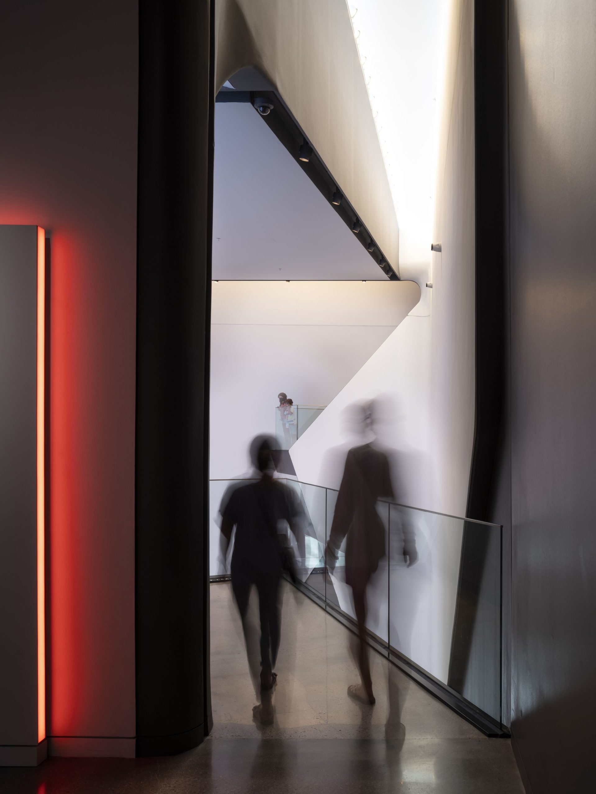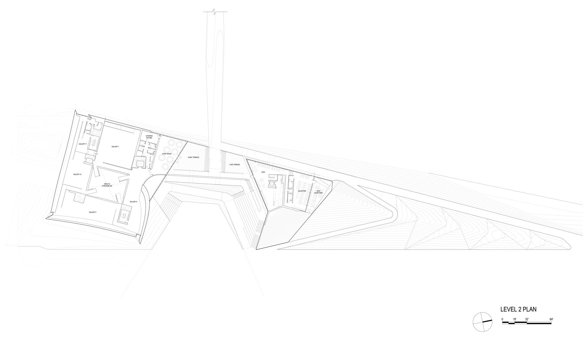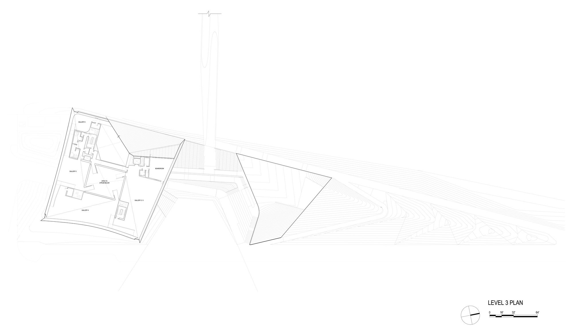 Level 1, 2, 3 Galleries: DS+R designed 20,000 sf of gallery space as overlapping petals that wrap around the central atrium. Clerestory lighting at the seams between these petals provides soft daylight emanating from the central atrium space, terminating at vertical windows at the building’s perimeter. This lighting strategy doubles as wayfinding, orienting visitors back to the atrium, and situating them along a trajectory that moves through the galleries, which feature immersive interactive exhibitions designed by Gallagher Associates.