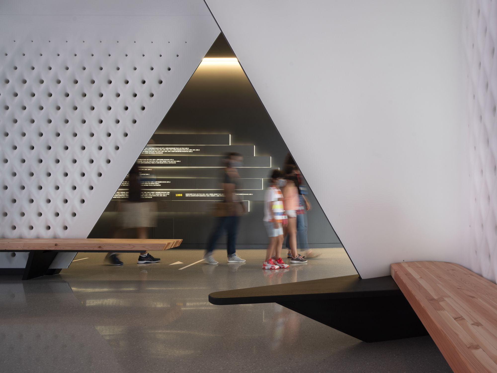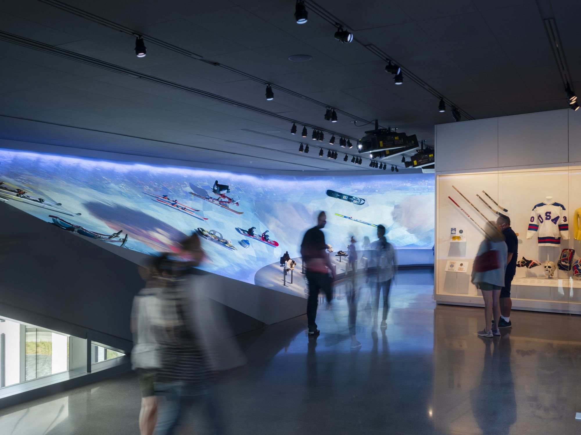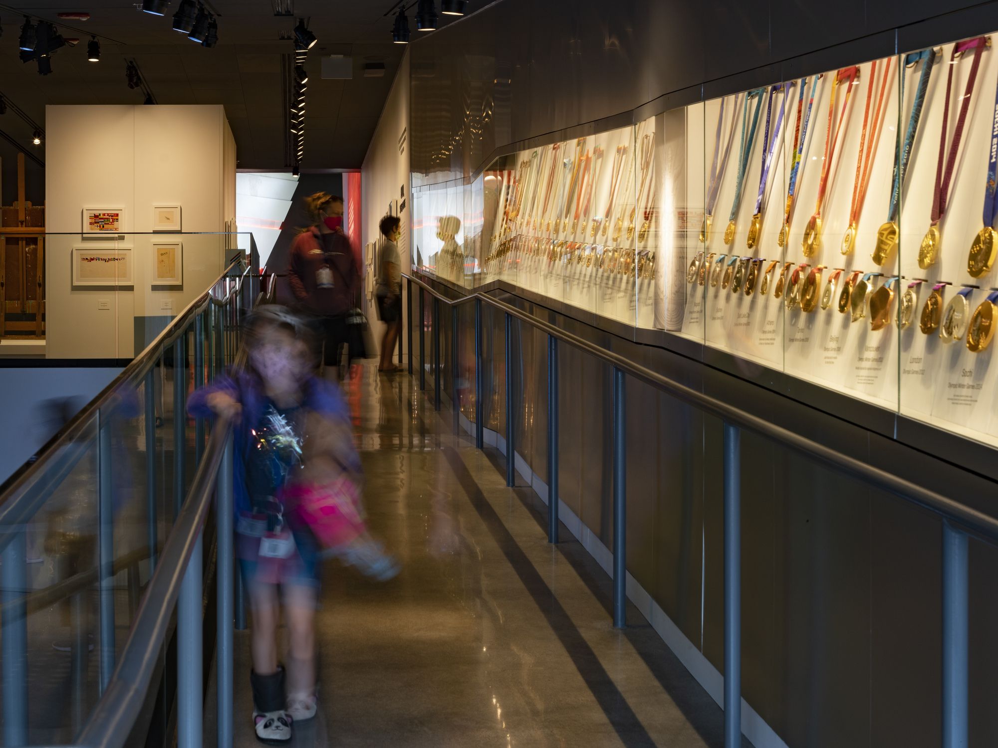 Accessibility: From the earliest stages of design, the team consulted a committee of Paralympic athletes and persons with disabilities to ensure that, from the entrance to exit, all visitors with or without disabilities could tour the USOPM facility together and share a common path. After they have been oriented, all visitors ascend to the top floor by elevator. Ramps guide visitors down a gentle-grade downhill circulation path that enables easier movement. Ramps have been widened to 6 feet to accommodate the side-by-side movement of two visitors including a wheelchair. Beyond ensuring all code and ADA requirements were rigorously met, material details including glass guardrails in the atrium for low-height visibility, cane guards integrated into benches, smooth floors for easier wheelchair movement, and lose seating in the café optimize the shared experience.