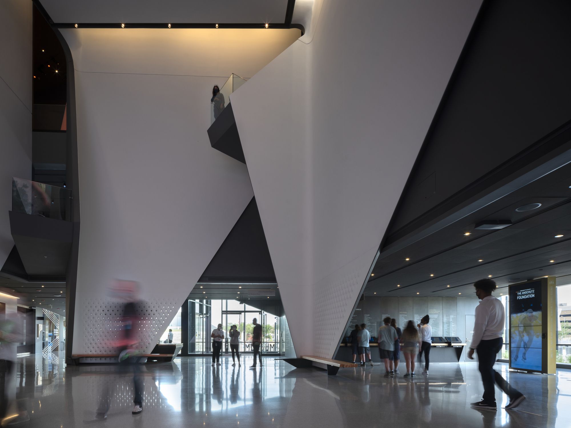 Level 1 Lobby Atrium: A skylight illuminates the 40 –foot tall atrium, while perforated GFRG (Glass Fiber Reinforced Gypsum) screens provide views from the lobby. Four balconies at varying heights overlooking the atrium re-orient visitors to this central space as they move through the galleries.