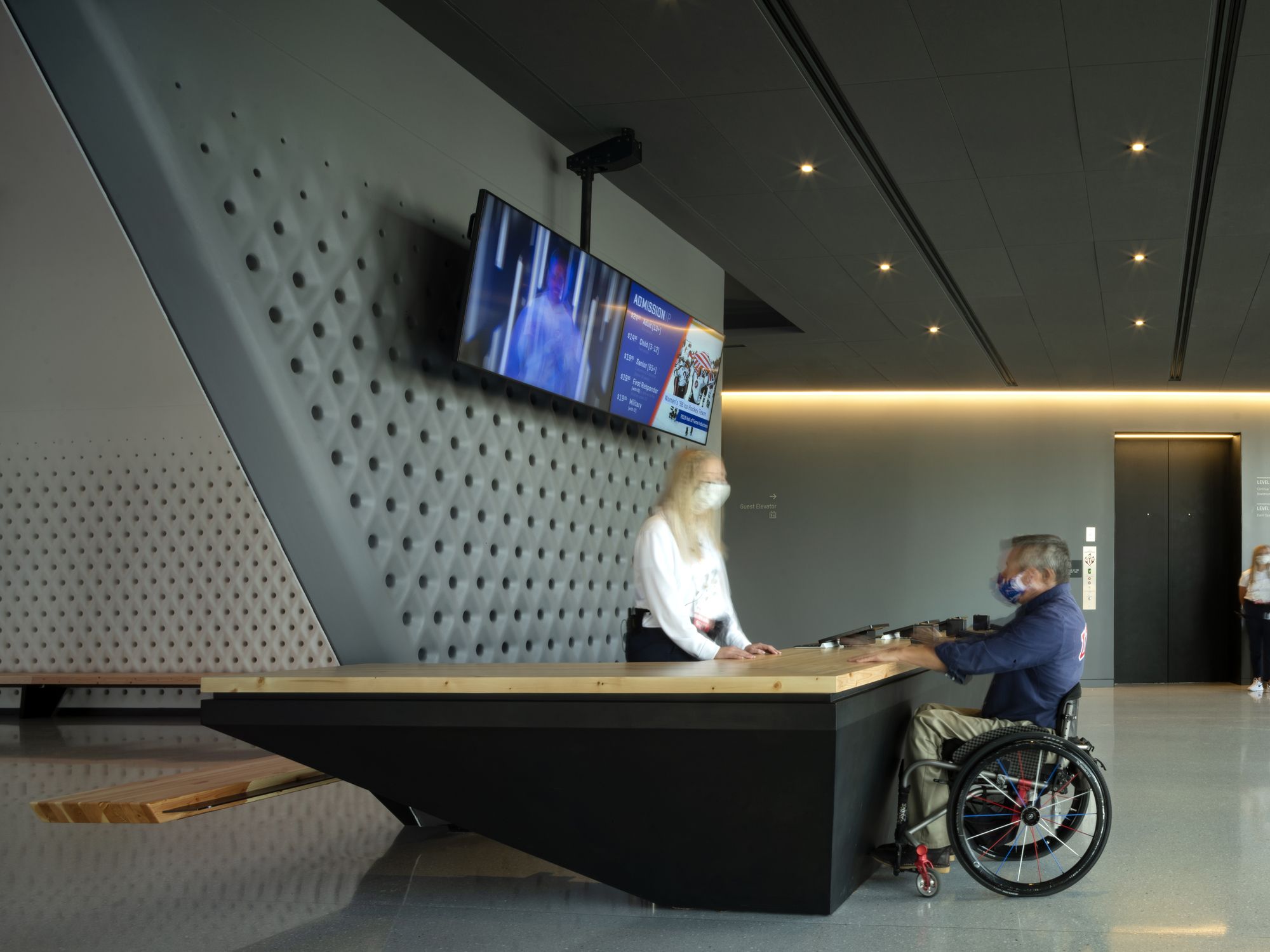 Level 1 Theater: The 2,000 sf theater can host a 130-person audience. Two rows of seats are removable to accommodate a max of 26 wheelchairs, enabling the potential for a full Paralympic hockey team to sit together.