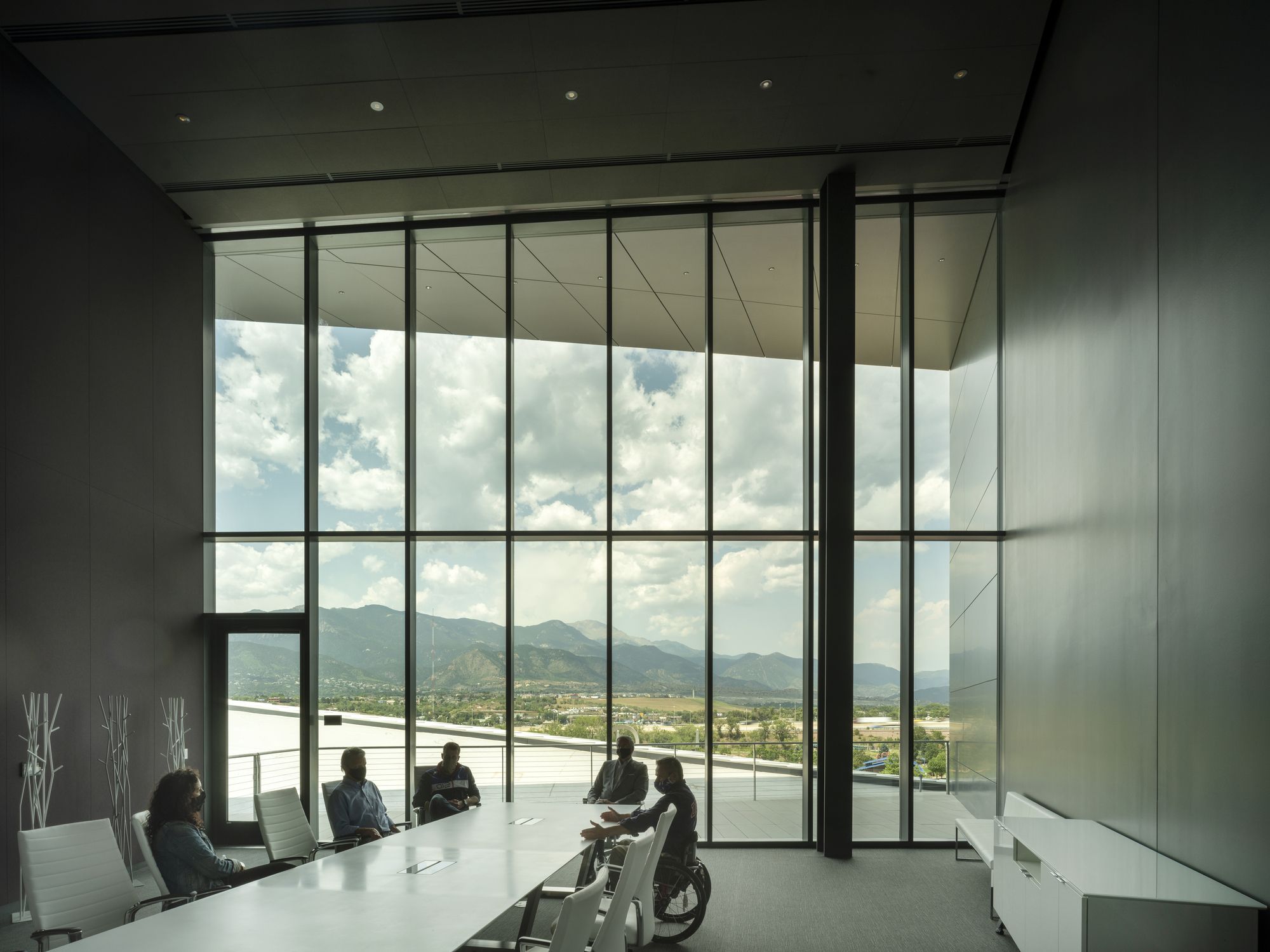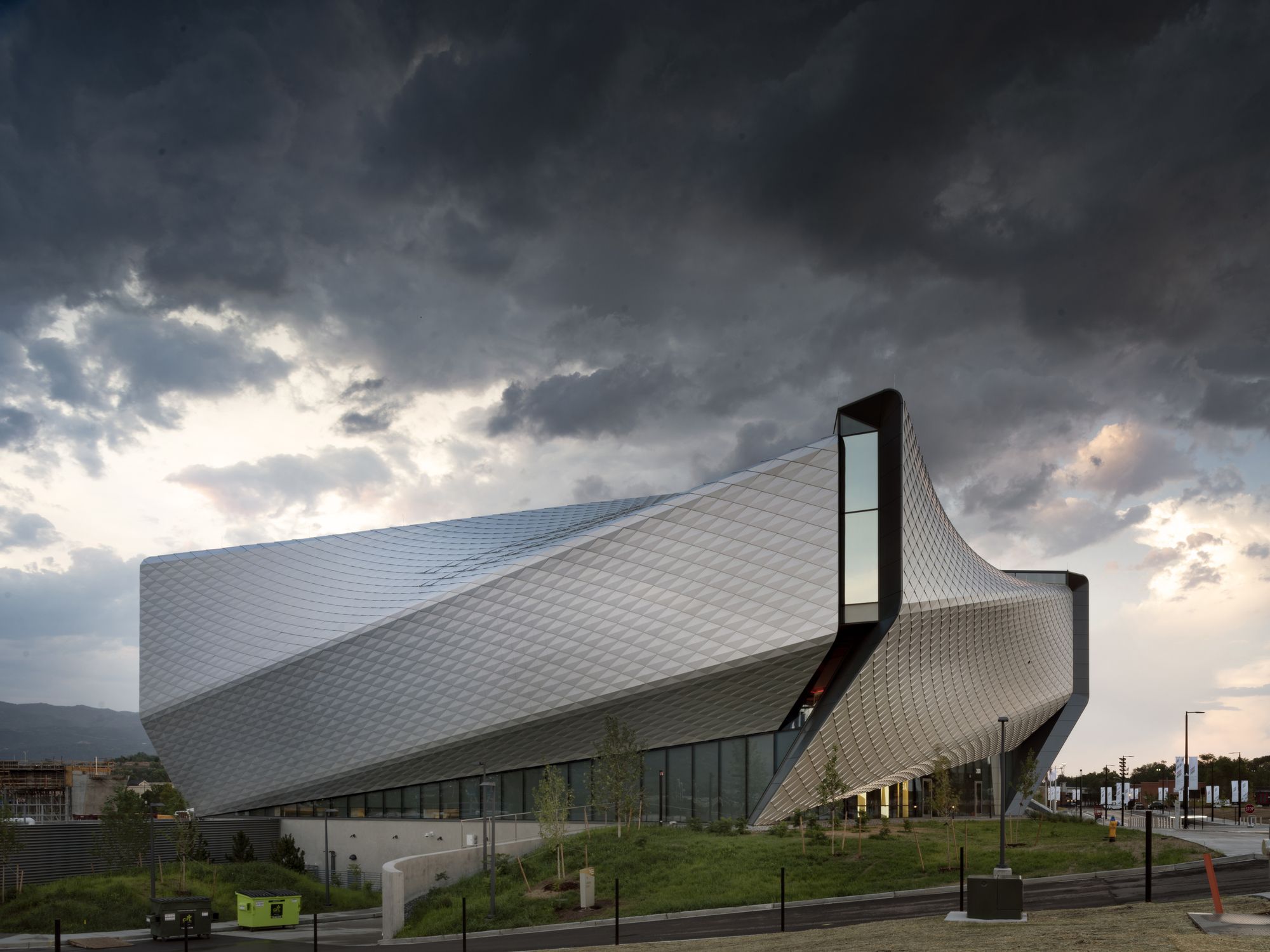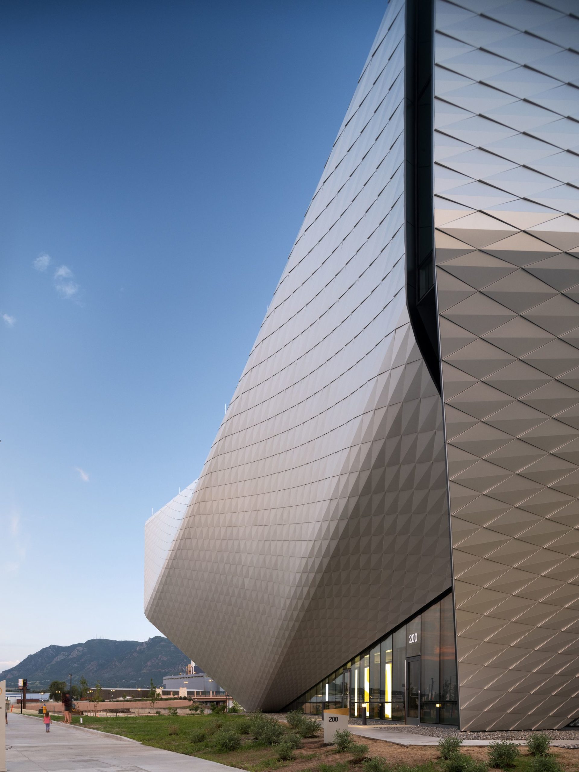 Façade: The façade consists of over 9,000 folded anodized diamond-shaped aluminum panels, each unique in shape and size. The taut skin wraps four overlapping petal-like volumes that spiral around the internal structure. Each metallic panel is animated by the extraordinary light quality in Colorado Springs, producing gradients of color and shade that give the building another sense of motion and dynamism.