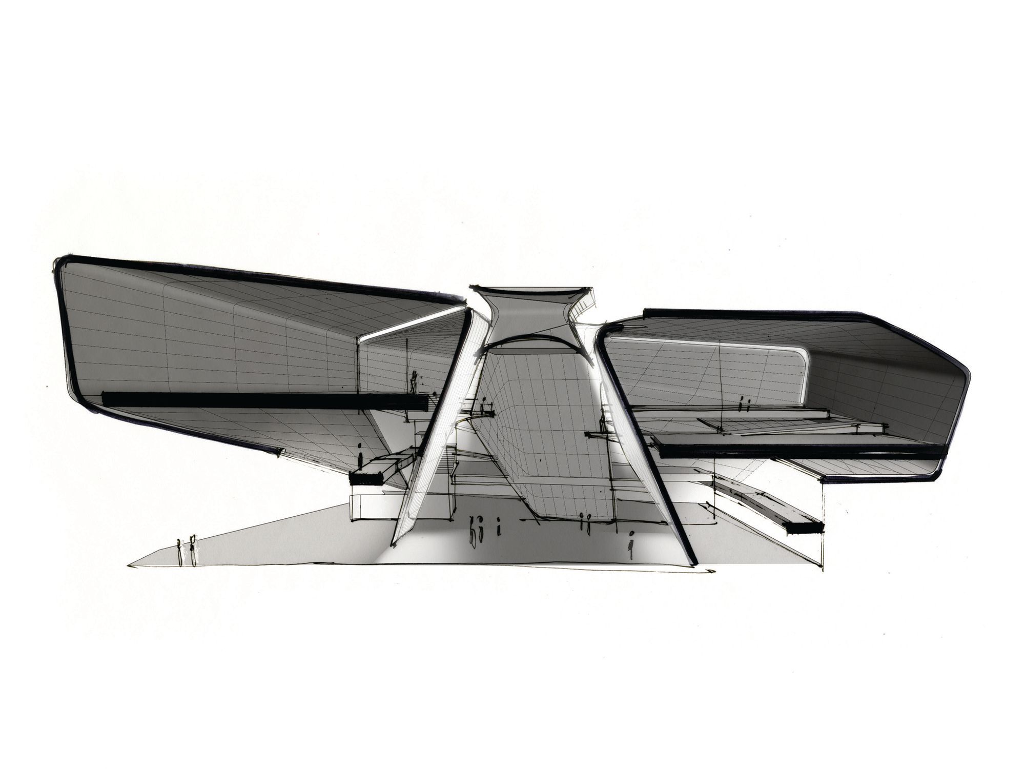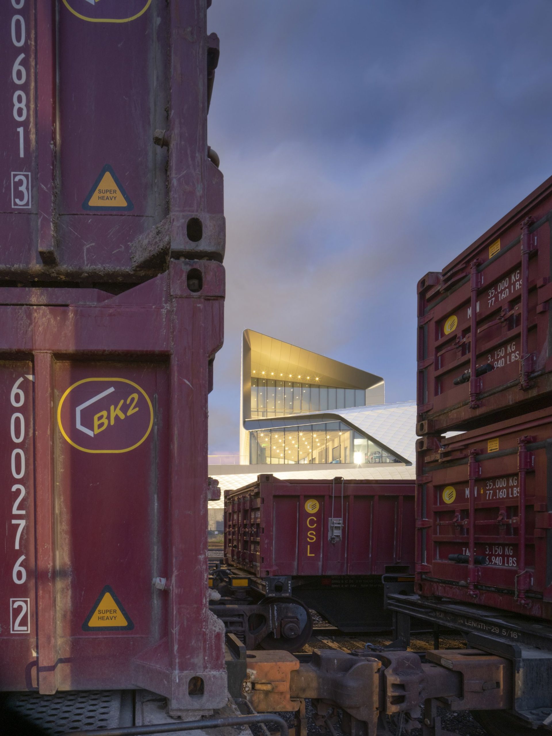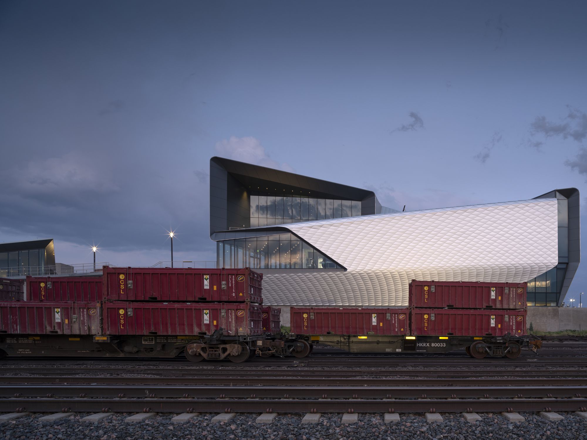 Façade: The façade consists of over 9,000 folded anodized diamond-shaped aluminum panels, each unique in shape and size. The taut skin wraps four overlapping petal-like volumes that spiral around the internal structure. Each metallic panel is animated by the extraordinary light quality in Colorado Springs, producing gradients of color and shade that give the building another sense of motion and dynamism.