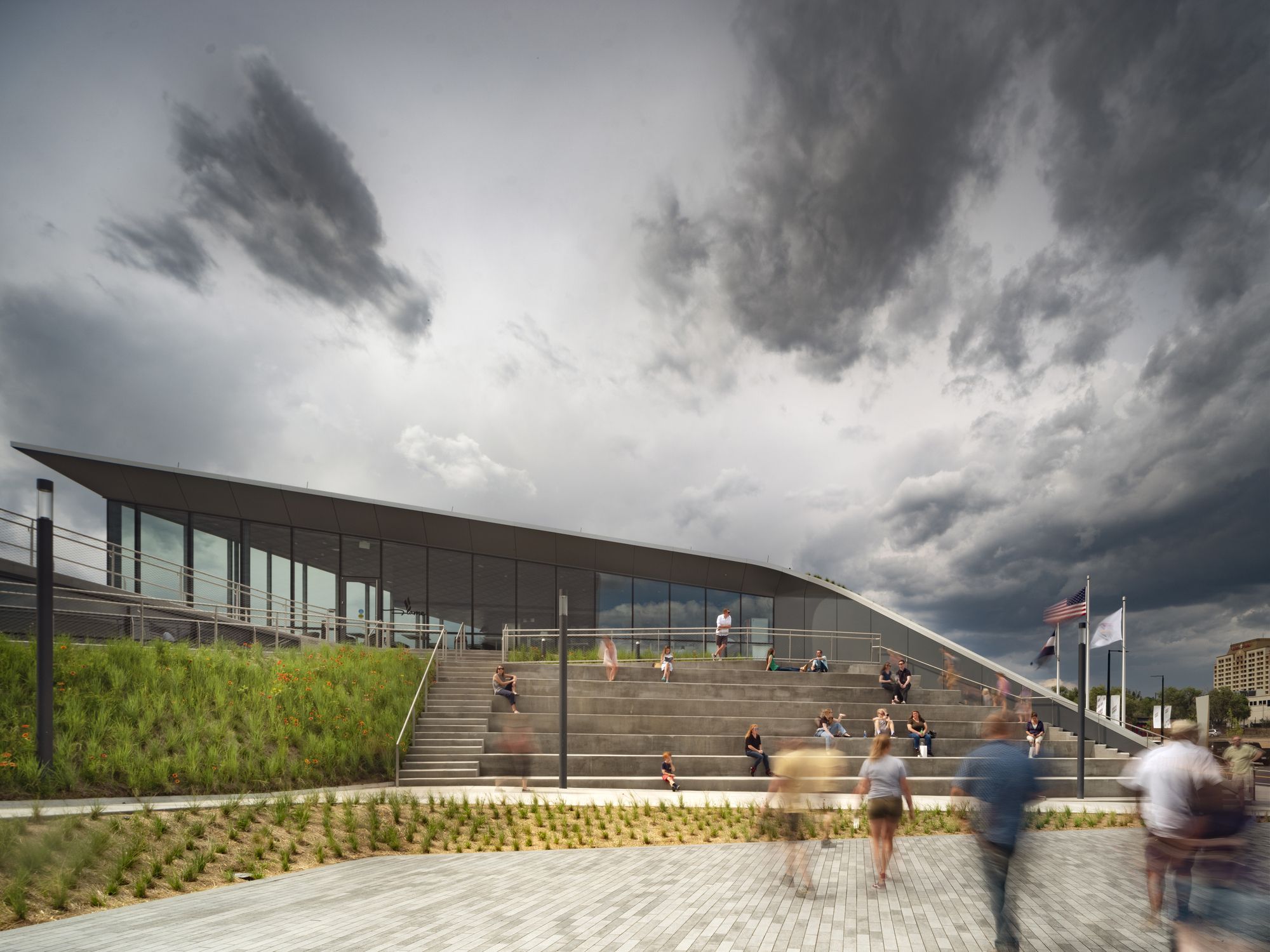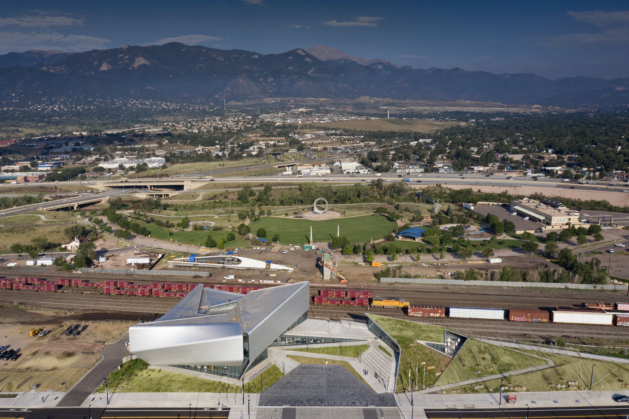 Plaza A terraced hardscape plaza is at the heart of the museum complex, cradled by the museum building to the south and the cafe to the north. The plaza frames a postcard view of Pikes Peak and the Rocky Mountains beyond. With integrated amphitheater seating for 230 people, the plaza is able to host outdoor events throughout the seasons, from the winter games through the summer games.