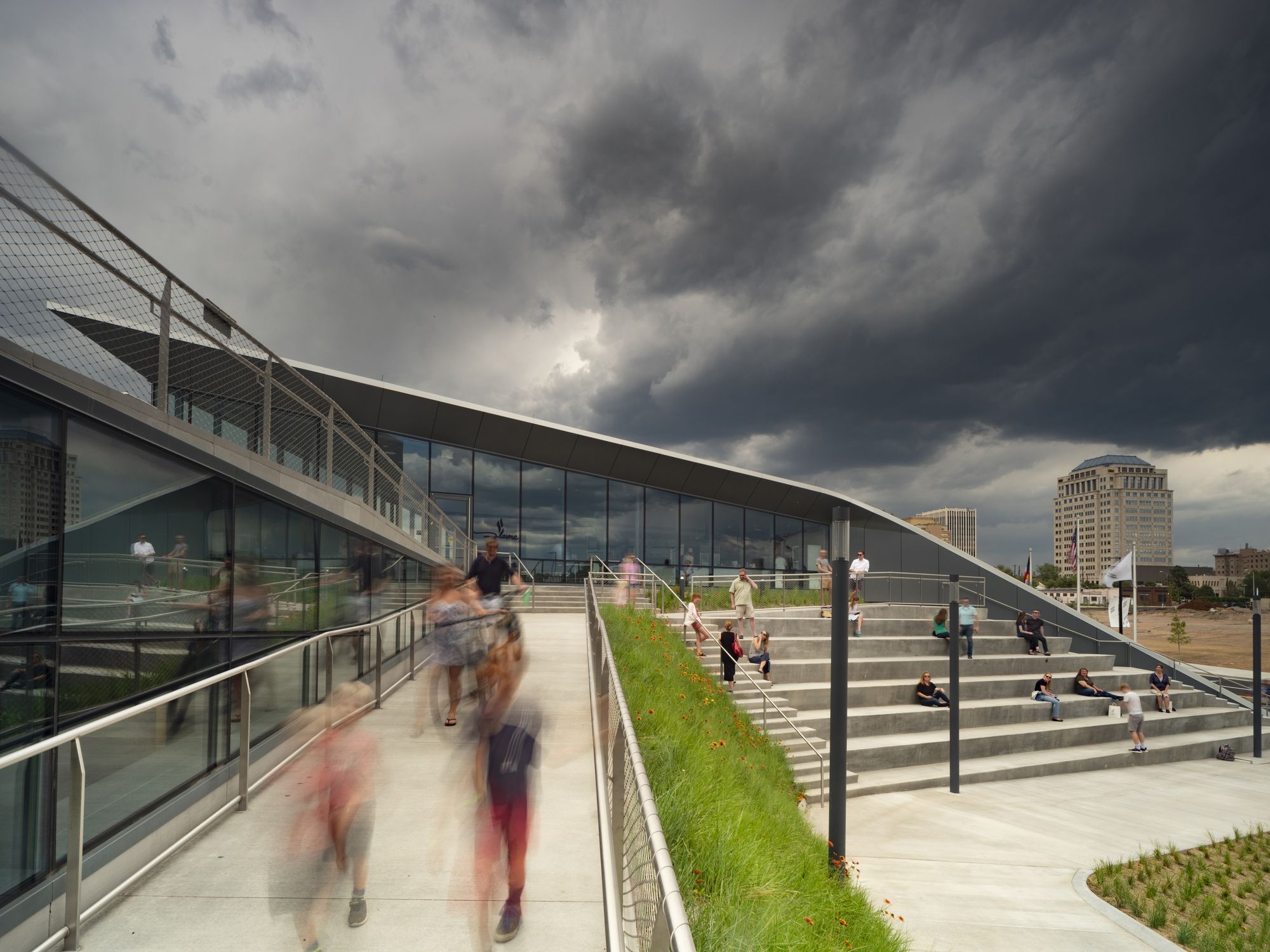 Level 2 Event Space: The 1,300 sf event space features a panoramic view spanning from downtown Colorado Springs to the Rocky Mountains. Space can also open up to an adjoining 500 sf outdoor terrace. Café and Education Room: A 2,800 sf cafe with an additional 400 sf outdoor dining area is equipped to host a full-service restaurant as well as educational programs, providing a flexible meeting space across the plaza from the primary museum building. The cafe’s landscaped roof samples native plantings that express the change in seasons.