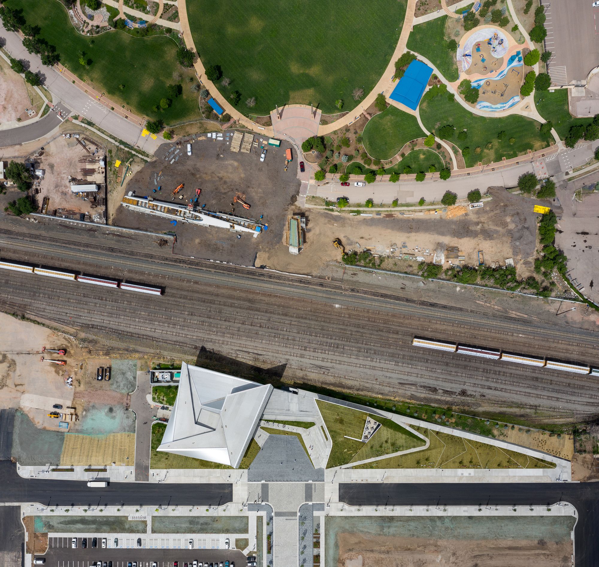 Level 3 Board Room: The 800 sf multi-functional board room features an adjacent 470 sf outdoor terrace and a 26 ft. floor-to-ceiling window framing a view of the Rocky Mountains. Southwest Downtown Pedestrian Bridge: The DS+R design team also designed a new pedestrian bridge spanning 250 ft. over an active railyard to connect the museum complex to America the Beautiful Park. The bridge extends an existing bike network, connecting downtown to the Midland Trail.