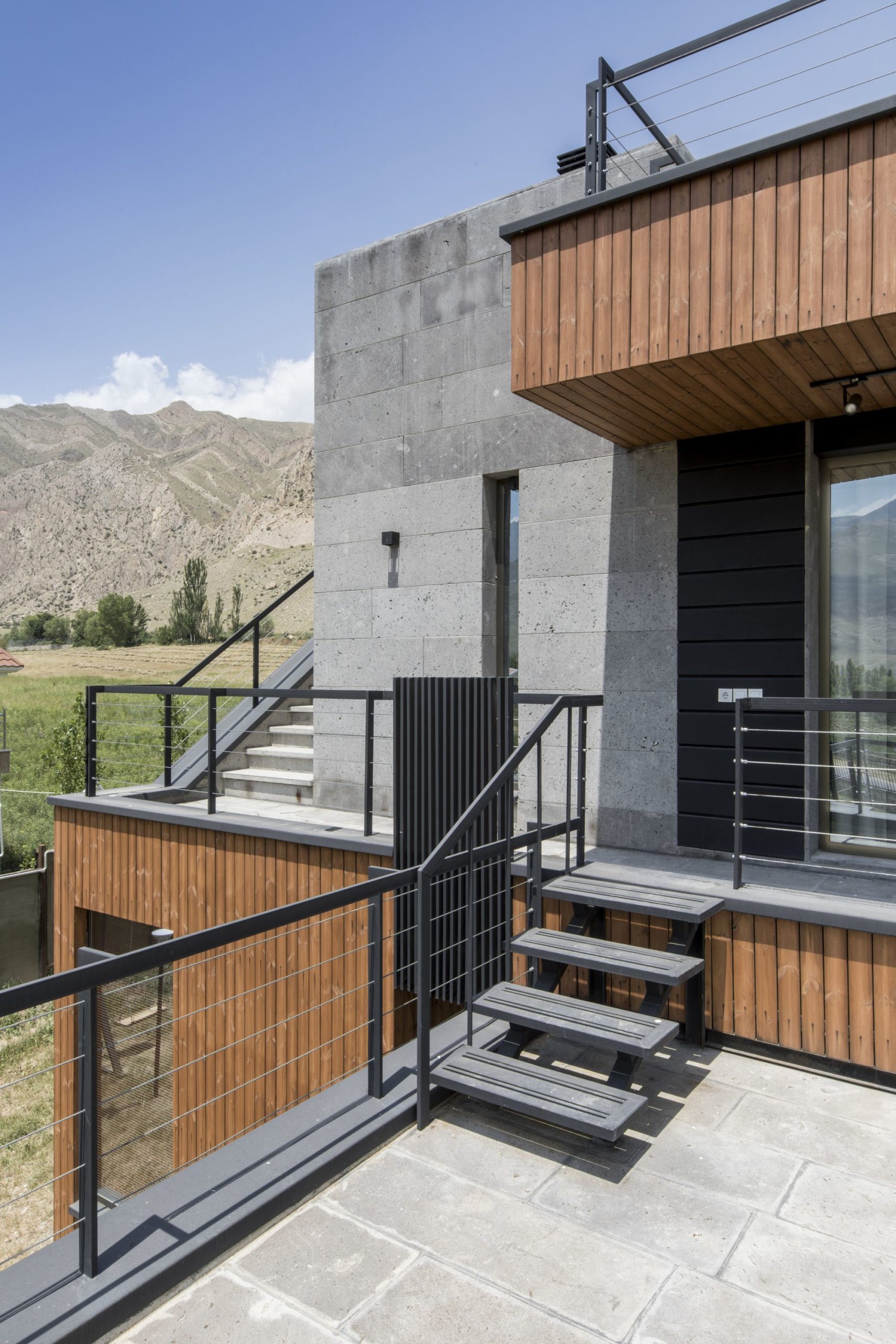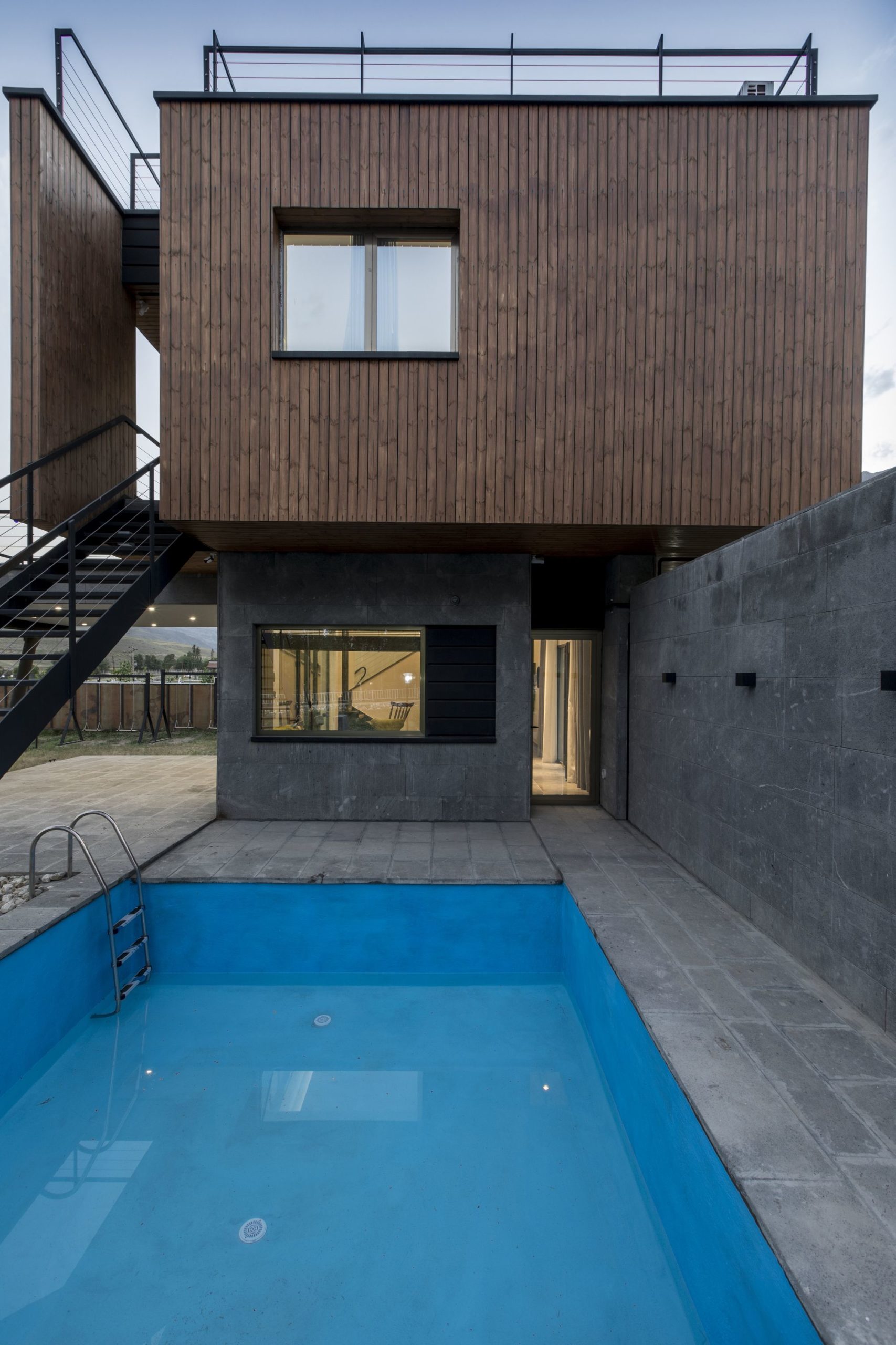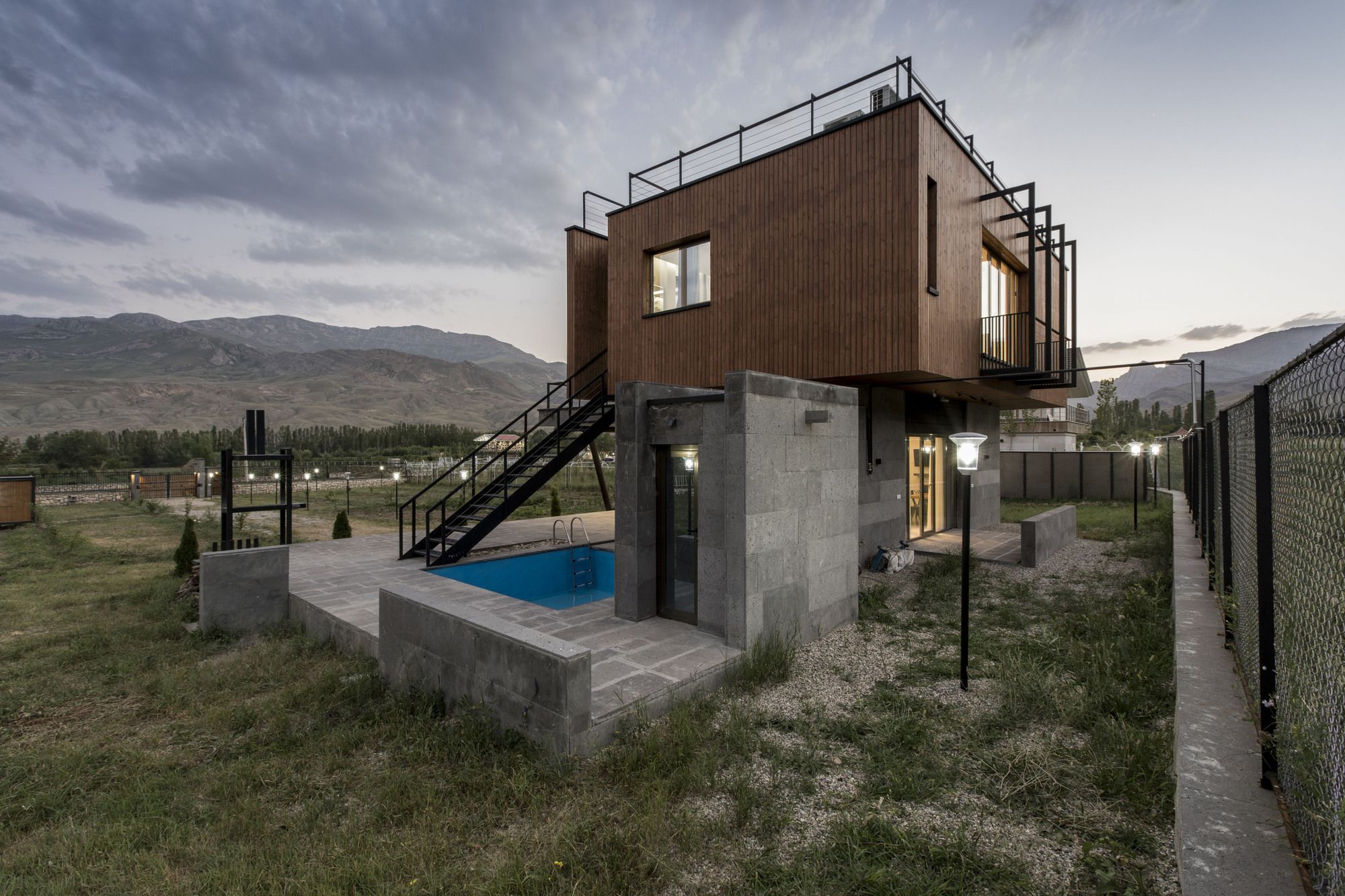Another challenge was the 45-square-meter gross area; Ground floor connected to the earth by a platform is dedicated to the living room and kitchen and the first floor includes 2 bedrooms and a bathroom. The two levels are connected by a stairway which is cantilevered to solve the gross area challenge and to meet spatial requirements as well as playing a fundamental role in shaping the form of the building. The upper stairway leads to the roof which is functioning as an observation space over natural sceneries. A pool is added to the eastern part of the platform to improve natural ventilation in the living room.
