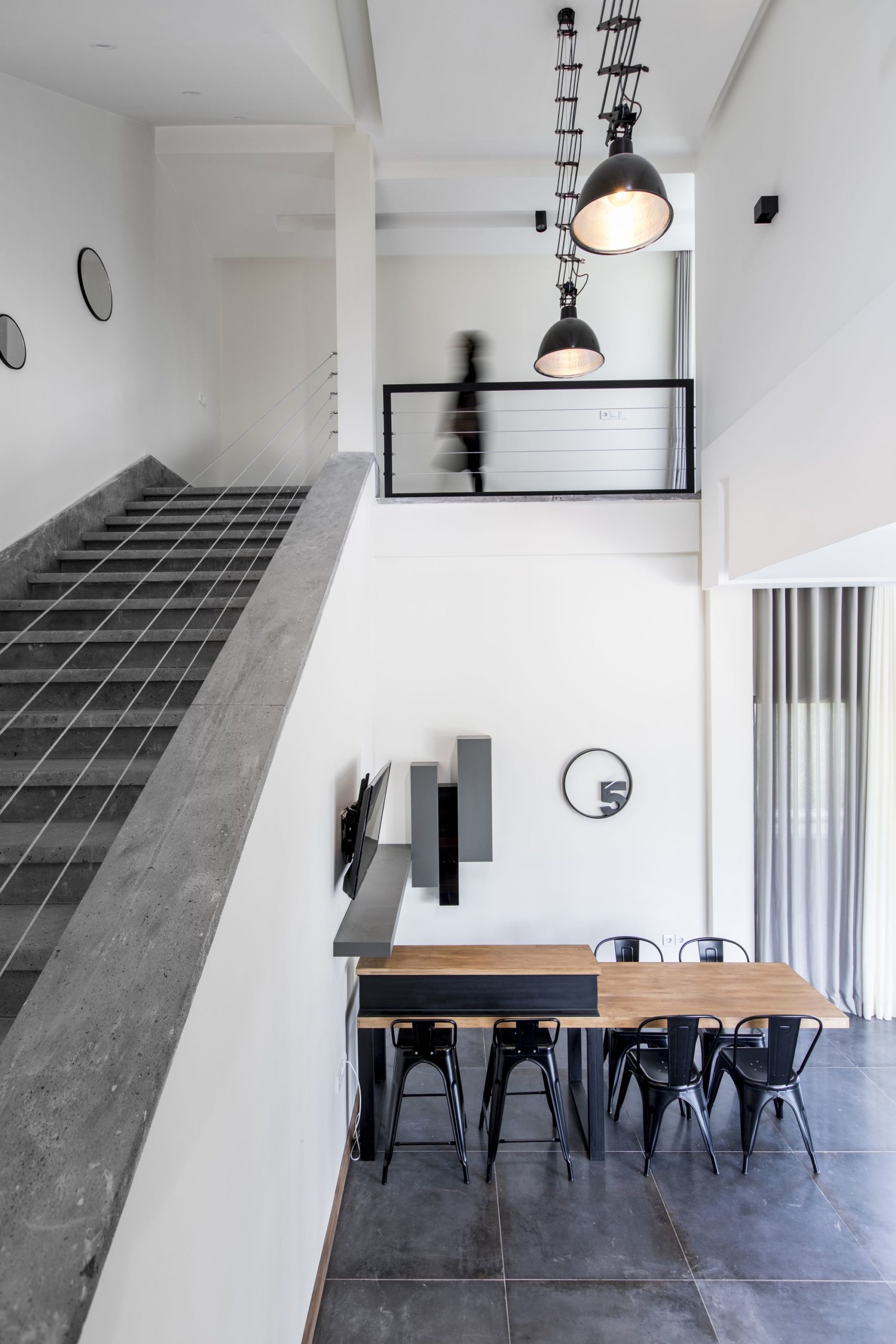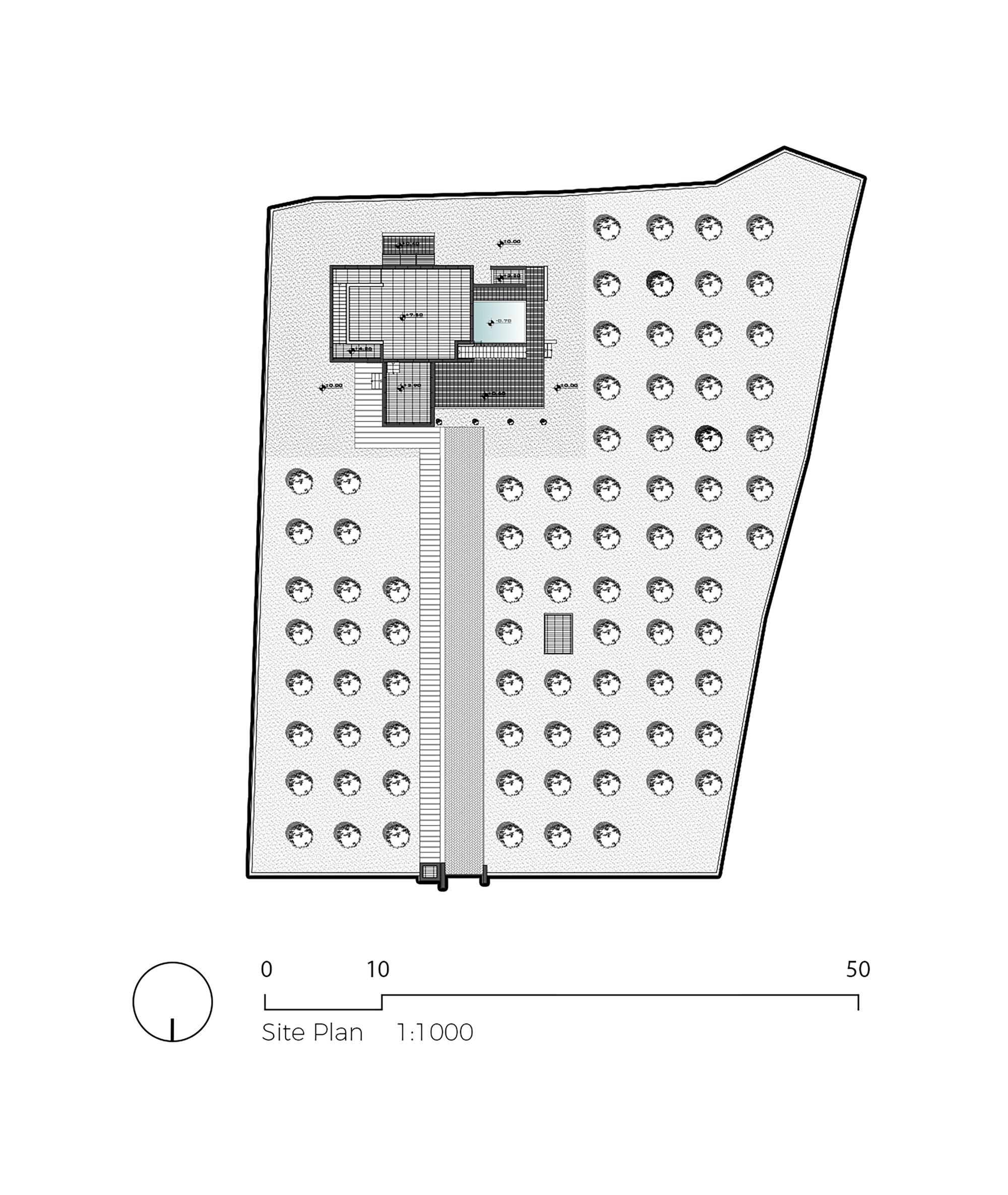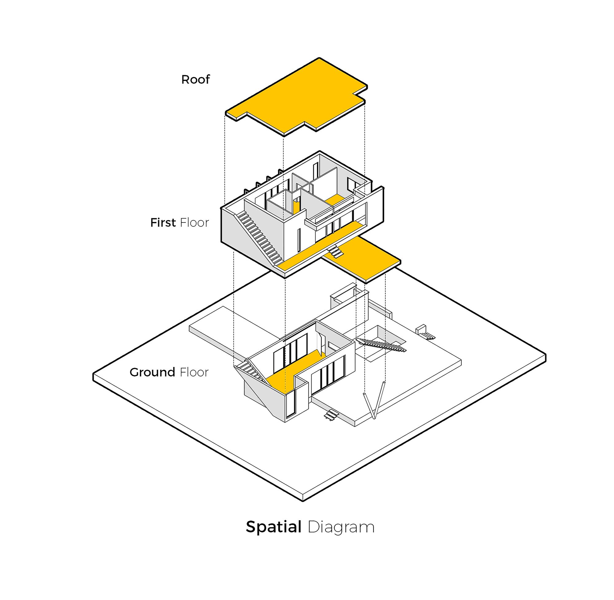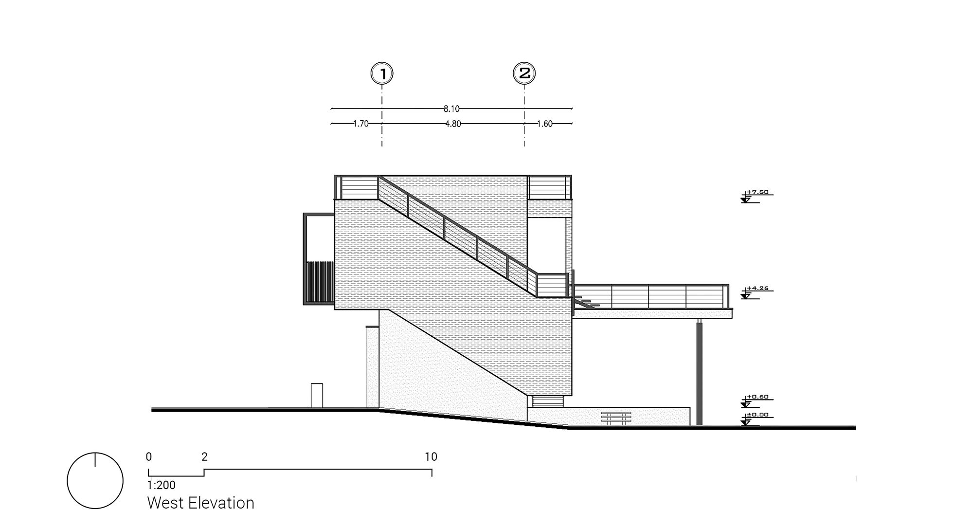 Another challenge was the 45-square-meter gross area; Ground floor connected to the earth by a platform is dedicated to the living room and kitchen and the first floor includes 2 bedrooms and a bathroom. The two levels are connected by a stairway which is cantilevered to solve the gross area challenge and to meet spatial requirements as well as playing a fundamental role in shaping the form of the building. The upper stairway leads to the roof which is functioning as an observation space over natural sceneries. A pool is added to the eastern part of the platform to improve natural ventilation in the living room.