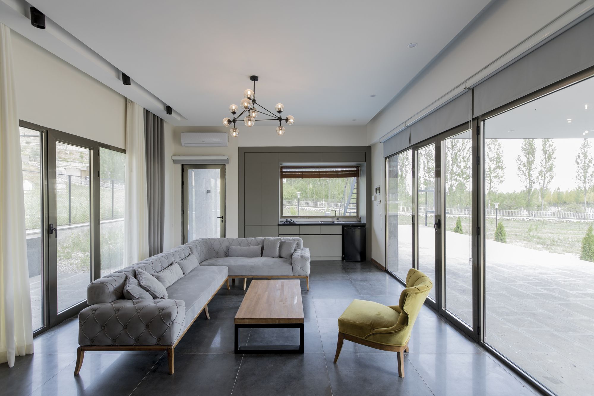 The building is located in a district with virgin nature and domination of nature is obvious at the first glance. The volumes are independent as well as combined and the simplicity of forms improves humility about mysterious nature. Stretched terrace, held by V columns is completed by the linear railing to maximize transparency and to dominate over green plains around.