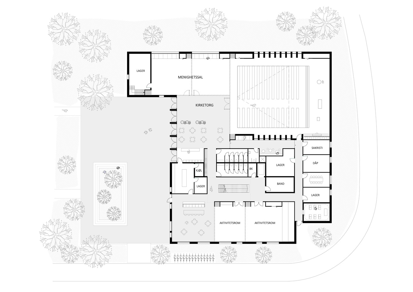 The church also pays homage to its heritage by incorporating logs from the original Vennesla church into the foundation wall of the Quiet Room and beneath the altar table in the church hall, beautifully executed by artist Tor Lindrupsen. With its strategic position along the west-to-east axis, the new Vennesla Church beckons the people of Vennesla with open arms, poised to stand out as a distinctive backdrop for this cherished community.