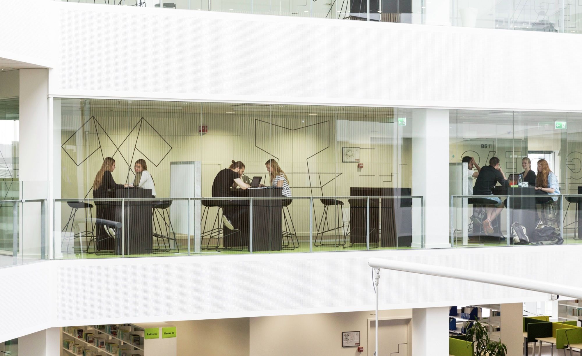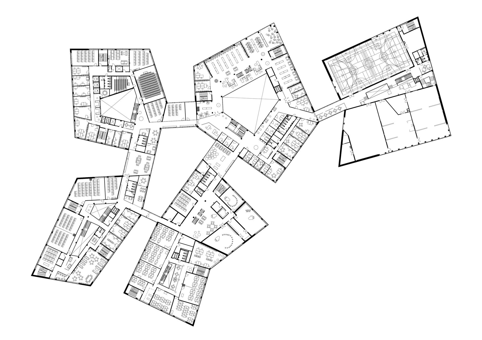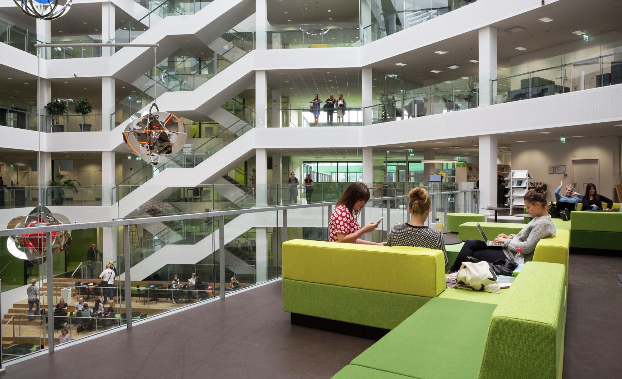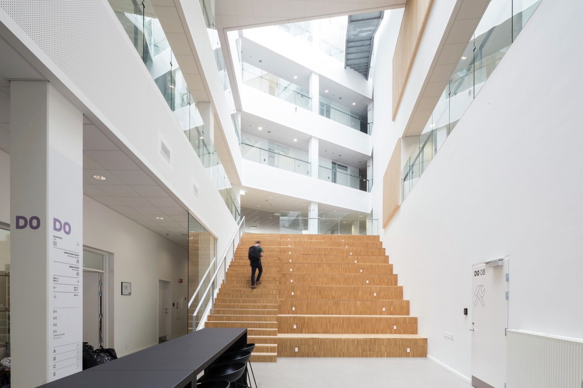 The Campus Area’s many functions are integrated into the overall building based on a matrix organization. This way of organization seeks to bring together professionalism in the vertical clusters and simultaneously unify the different educations horizontally – this happens in the floors, with cross couplings between the clusters.