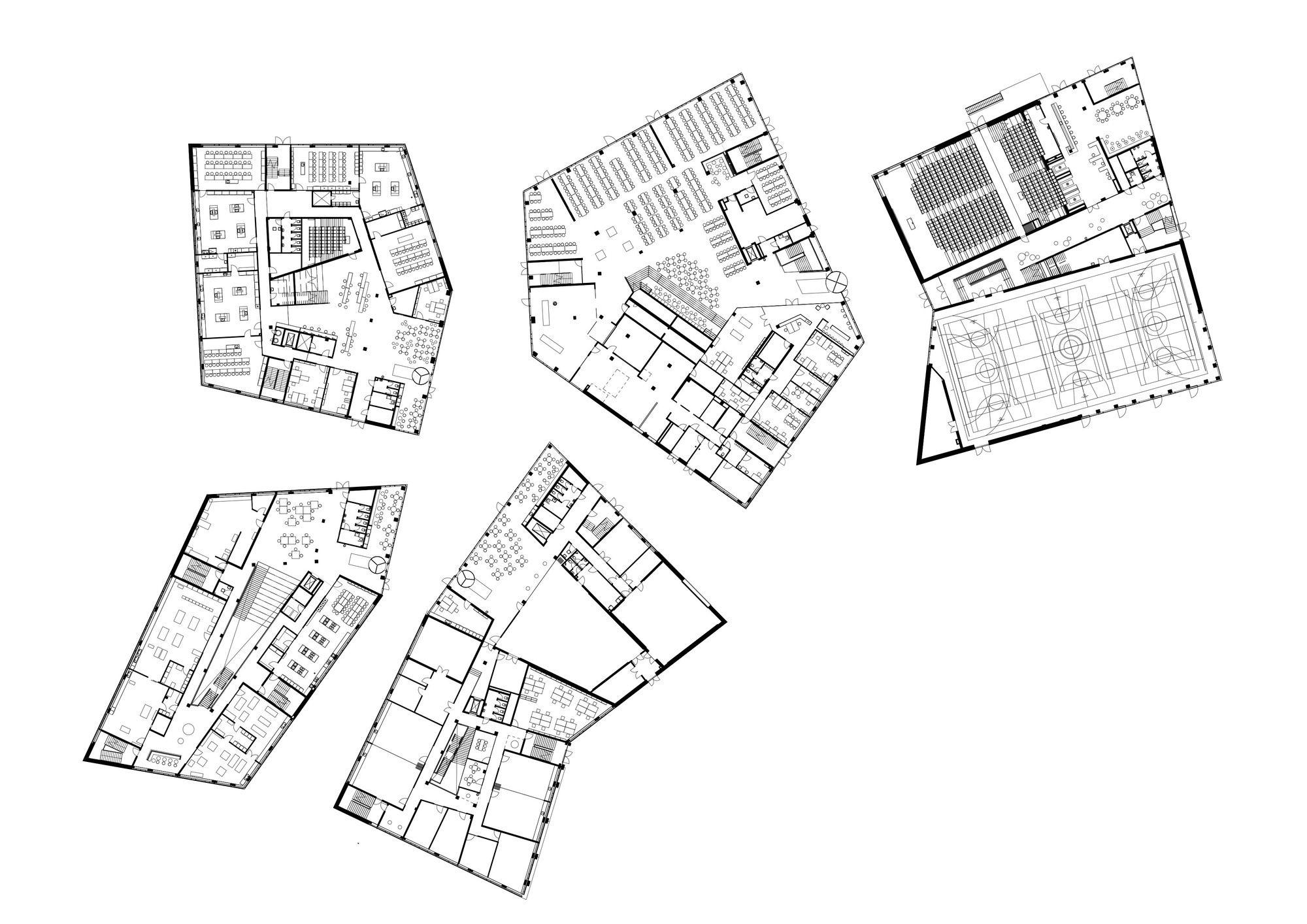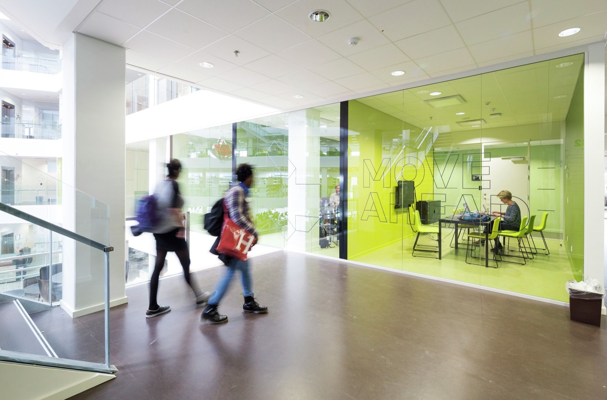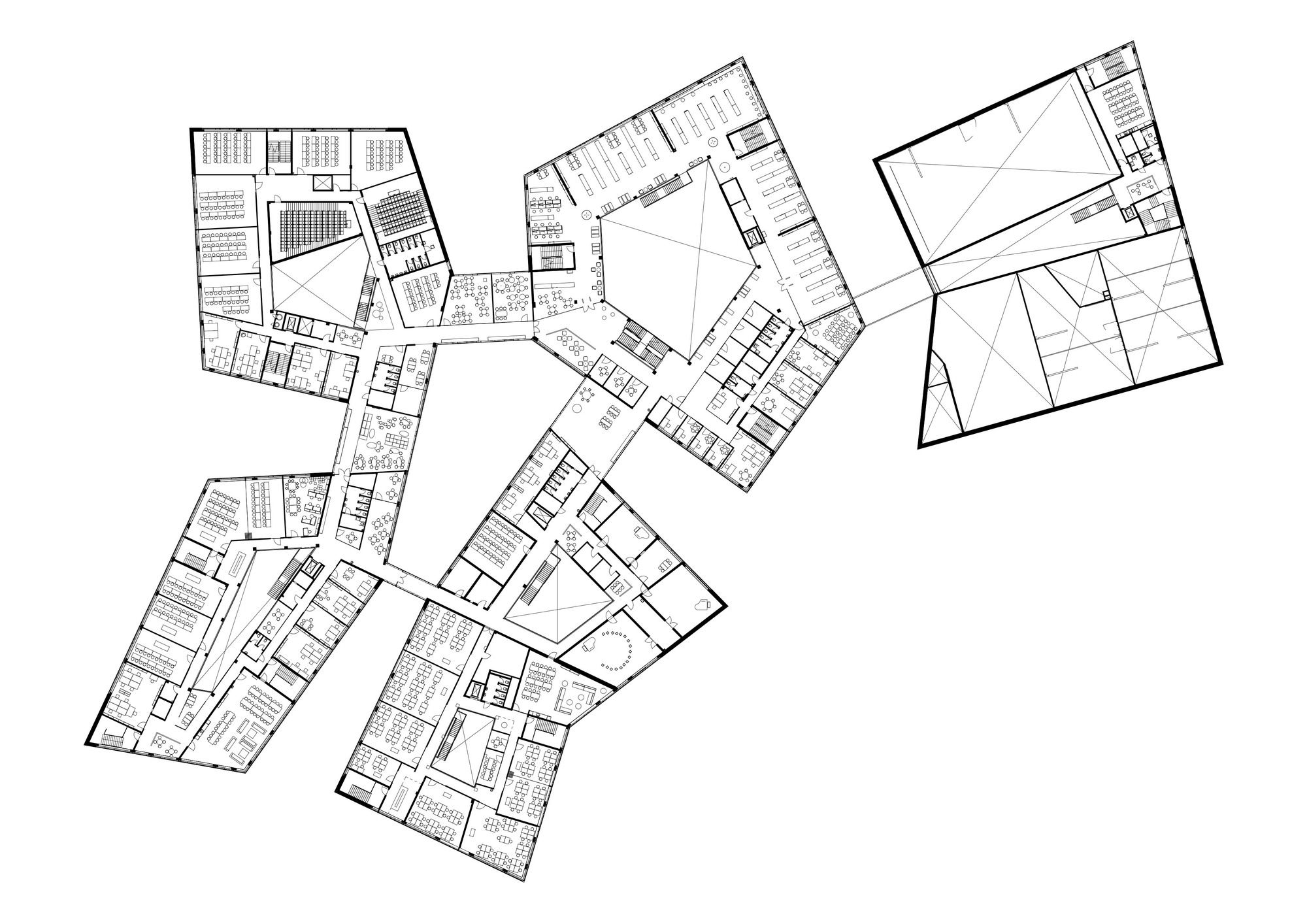 The Campus Area’s many functions are integrated into the overall building based on a matrix organization. This way of organization seeks to bring together professionalism in the vertical clusters and simultaneously unify the different educations horizontally – this happens in the floors, with cross couplings between the clusters.