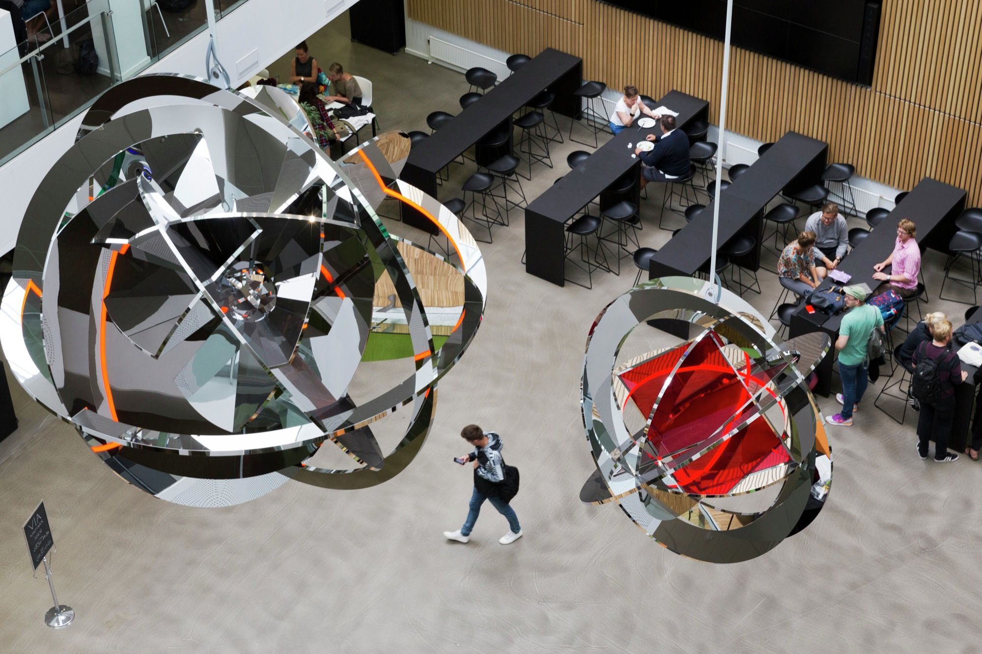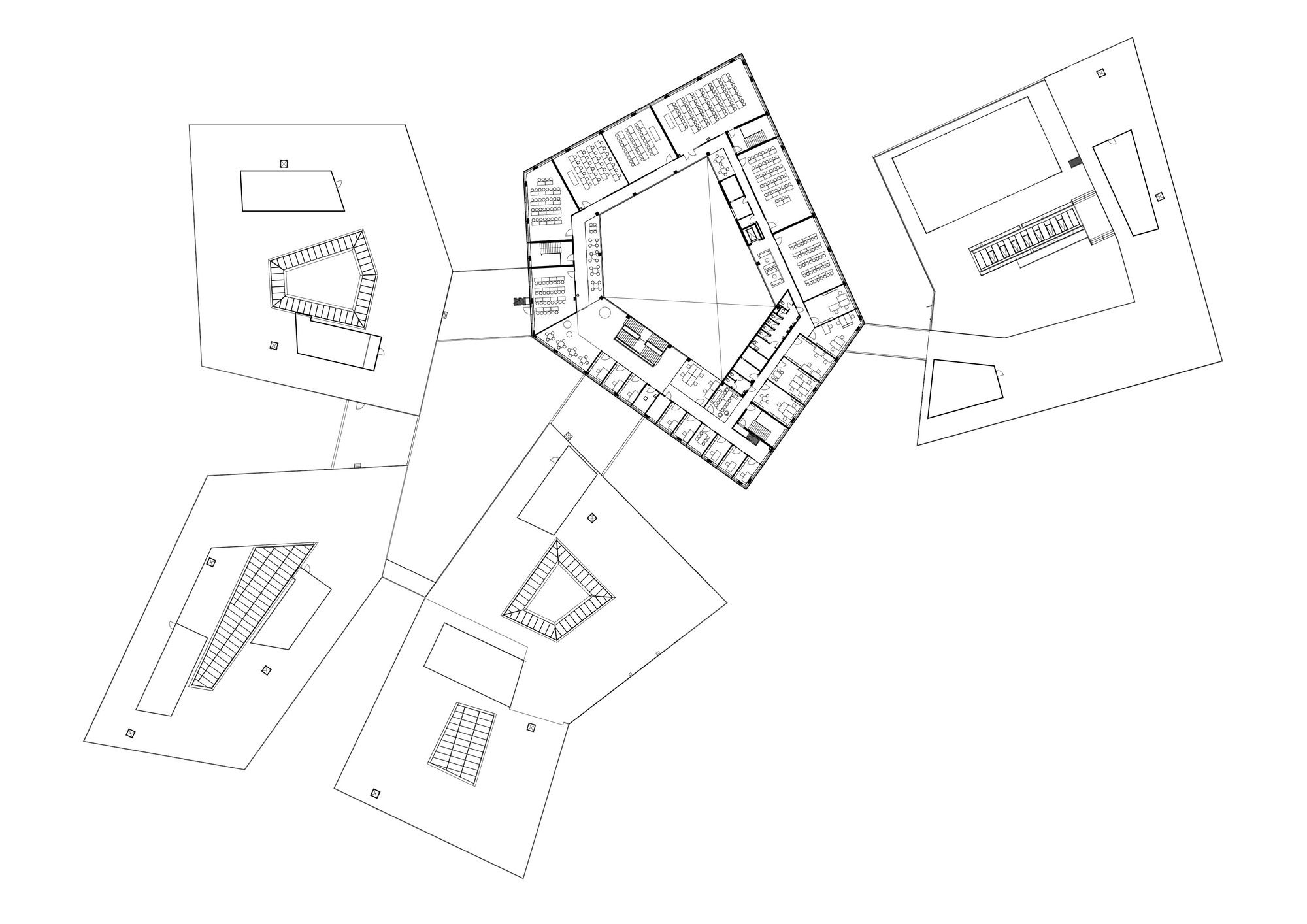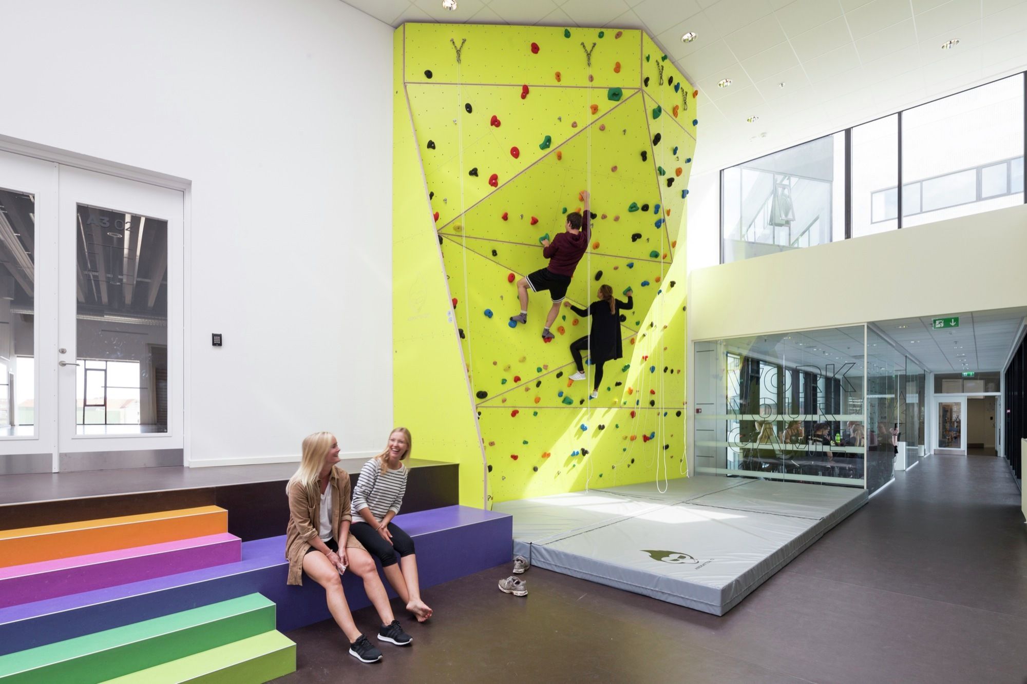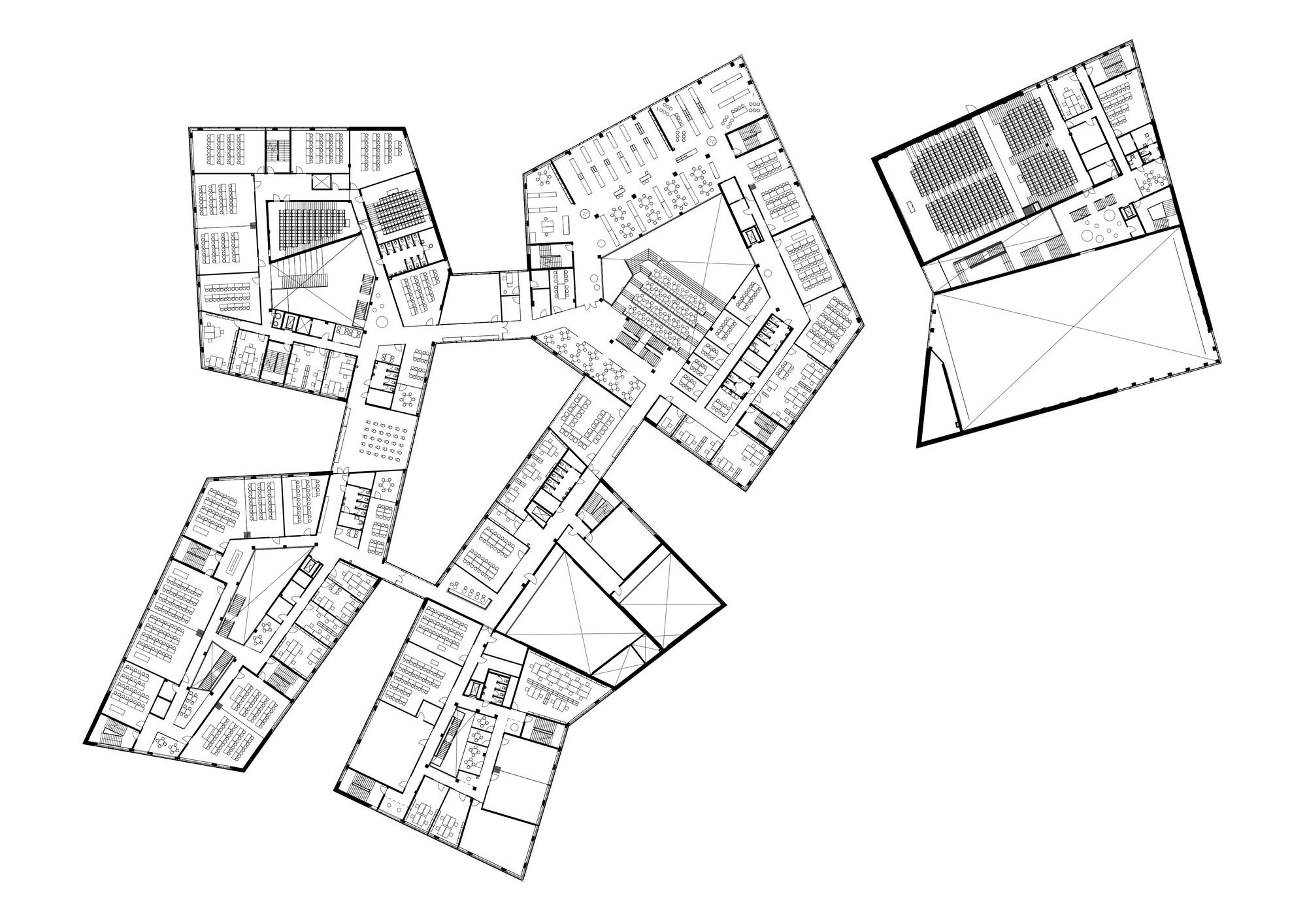 The Campus Area’s many functions are integrated into the overall building based on a matrix organization. This way of organization seeks to bring together professionalism in the vertical clusters and simultaneously unify the different educations horizontally – this happens in the floors, with cross couplings between the clusters.