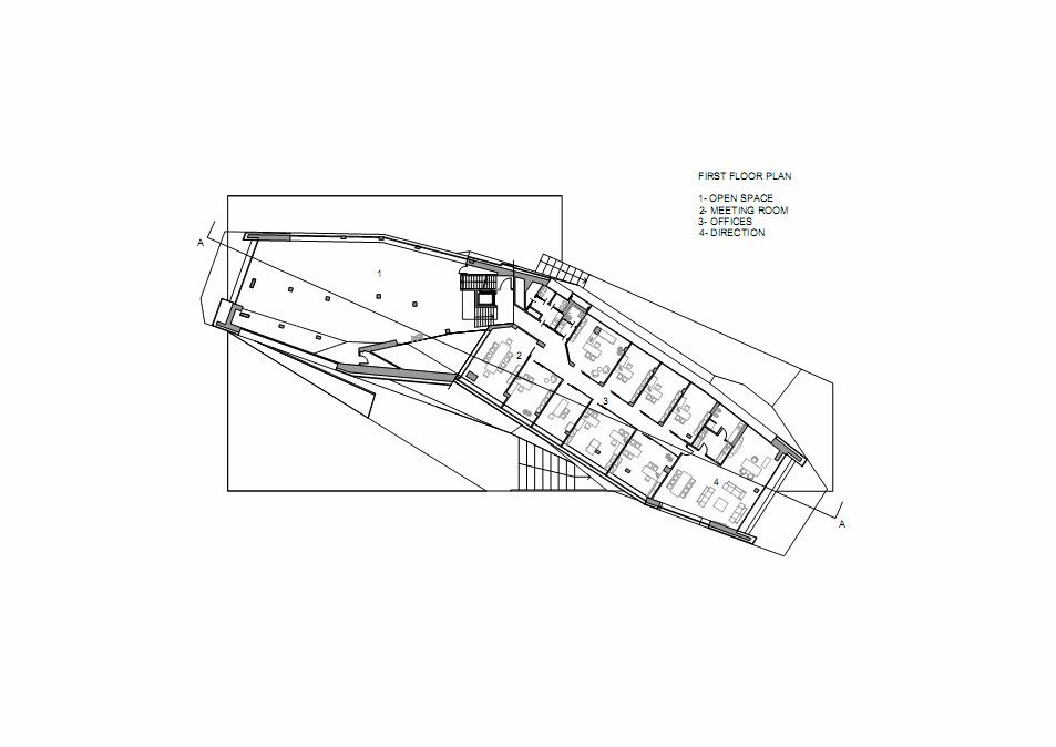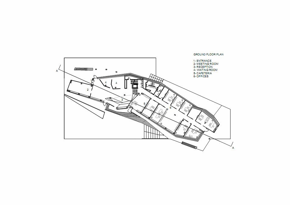 For what it’s worth, it would be interesting to see this building with the façade treated differently. I don’t mind the glass panels, which creates an interesting effect, but the fact that they are perfectly rectangular, except for the cuts made to fit the angles of the building, they do little to promote those gestures. By keeping the windows and entrances perpendicular to the ground, it emphasizes the rectangular nature of the building, hinting that the exterior is only a skin, most of which is only used for shading. No doubt Damilano Studio thought about this while designing the Oficina Vidre Negre, but it still leaves me to wonder how the building would have appeared if the panels were made in respect to the angles of the structure instead of adding a grid to a more abstract geometric prism.