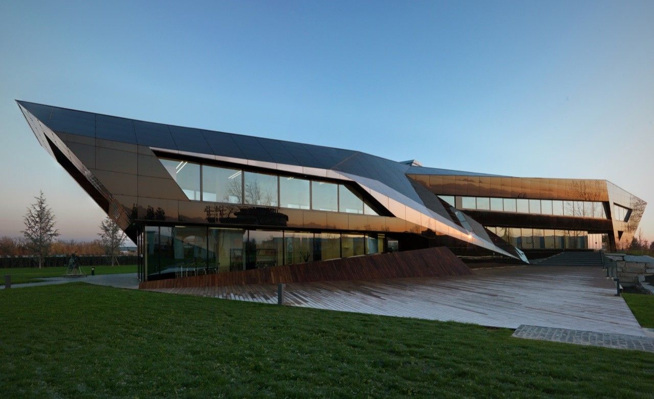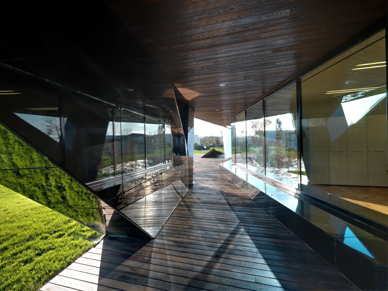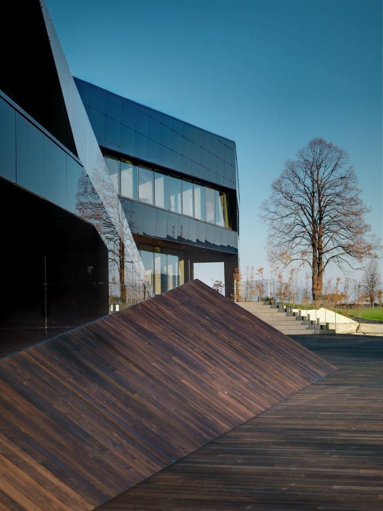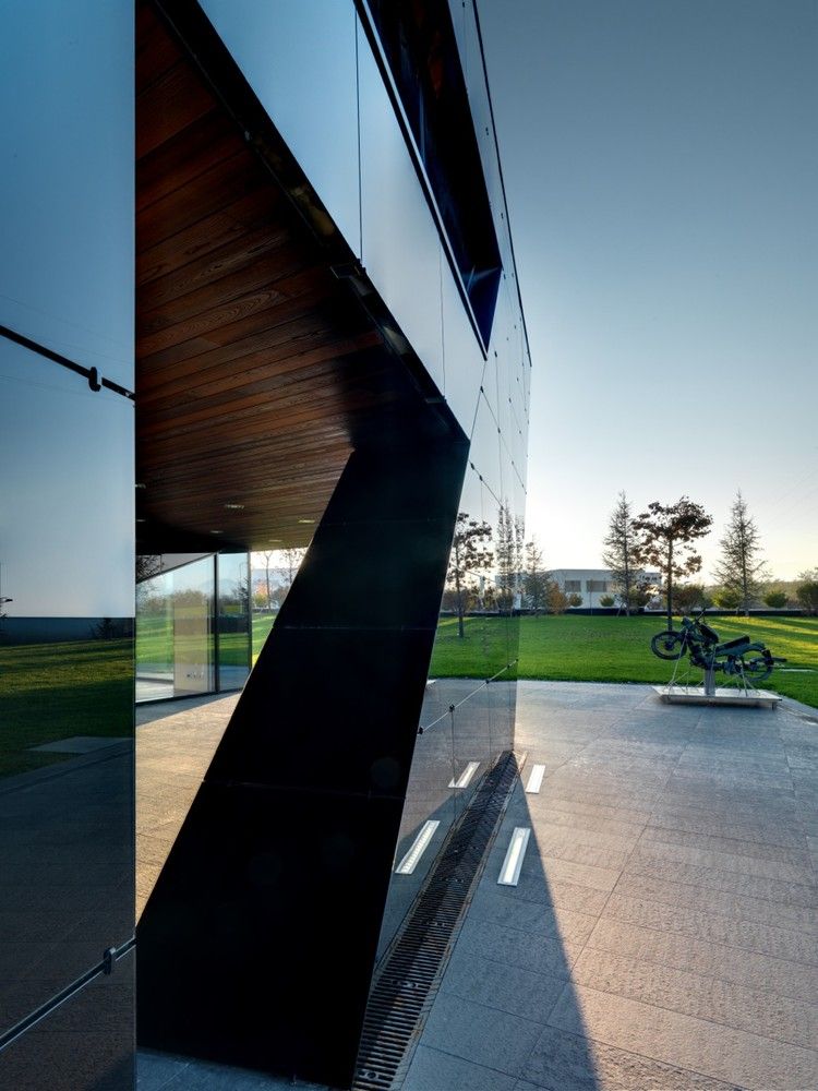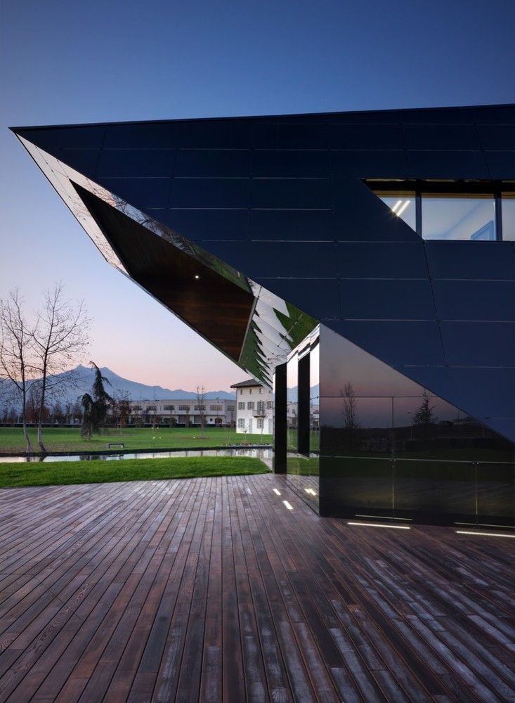 Designed by Damilano Studio Architects, Oficina Vidre Negre, for those not fluent in Catalan, means Black Glass Office, which very accurately describes the architecture of this building. The idea that is strongly observed within and around the structure is a reflection, making glass an easy choice of material for the façade. Reflection is one of those words that can be applied to a range of topics and interpretations. In this case, the smooth glass cladding of the prism hopes to reflect the surrounding park environment onto the building, which is also emphasized through its shape inspired by the landscape