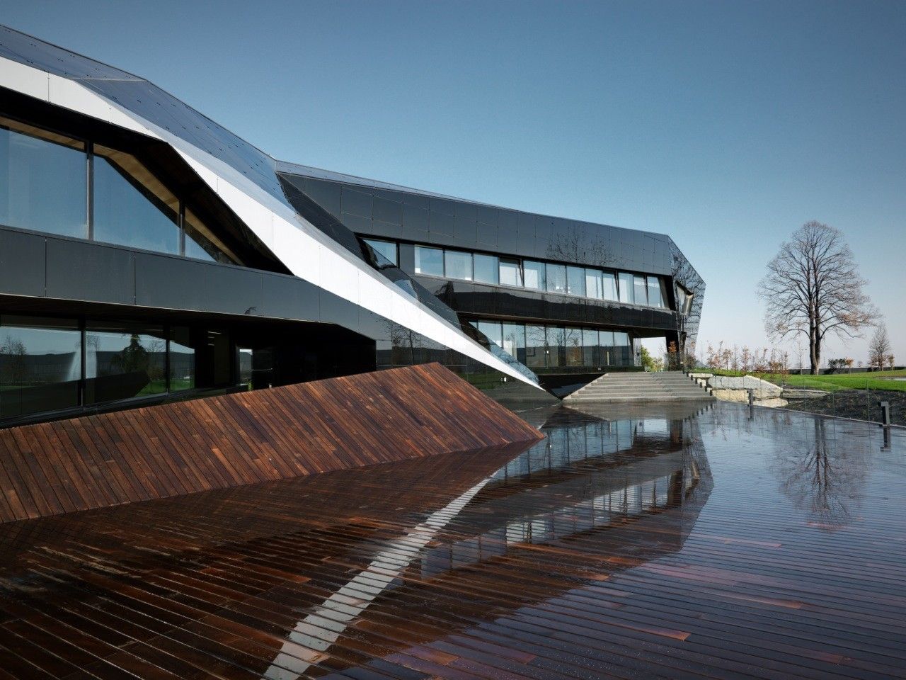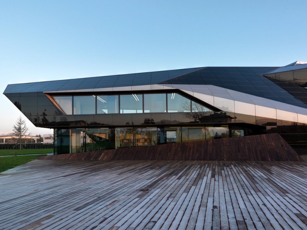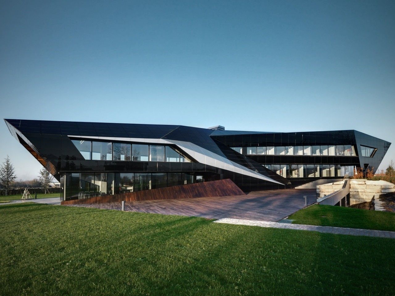 Designed by Damilano Studio Architects, Oficina Vidre Negre, for those not fluent in Catalan, means Black Glass Office, which very accurately describes the architecture of this building. The idea that is strongly observed within and around the structure is a reflection, making glass an easy choice of material for the façade. Reflection is one of those words that can be applied to a range of topics and interpretations. In this case, the smooth glass cladding of the prism hopes to reflect the surrounding park environment onto the building, which is also emphasized through its shape inspired by the landscape