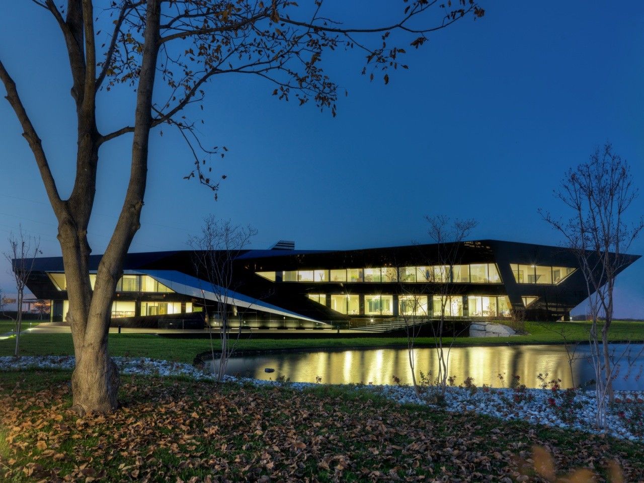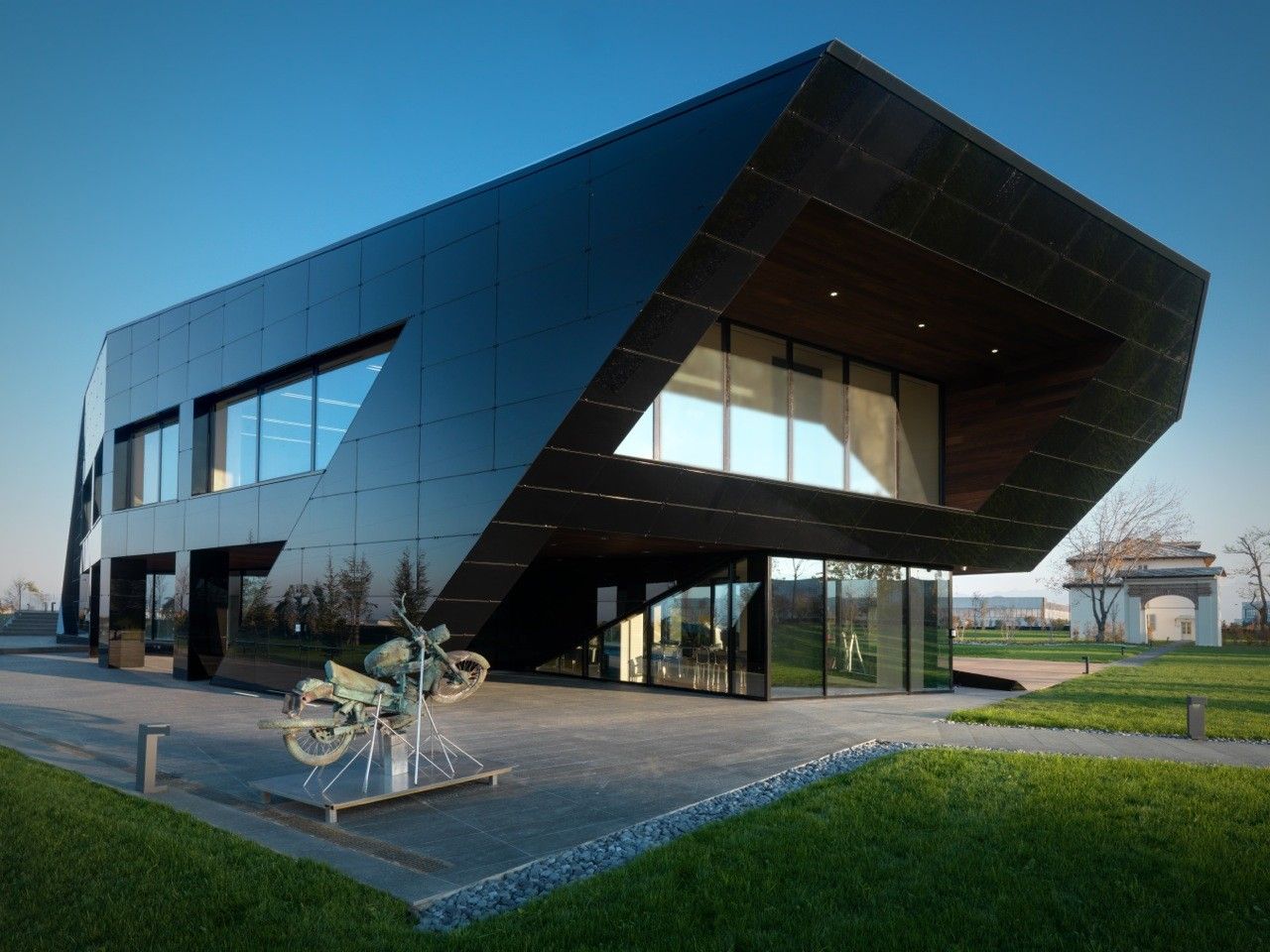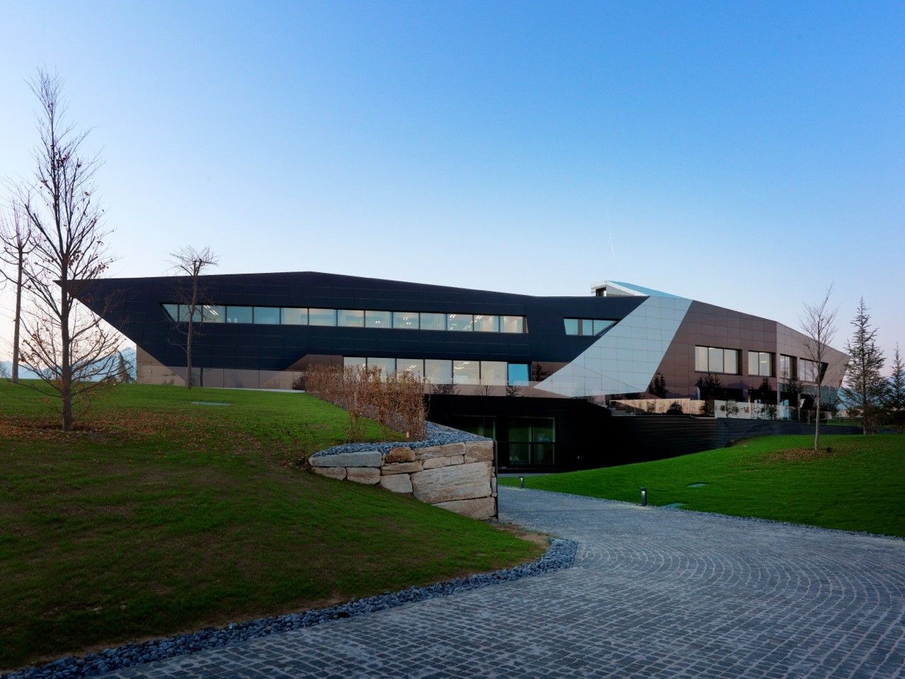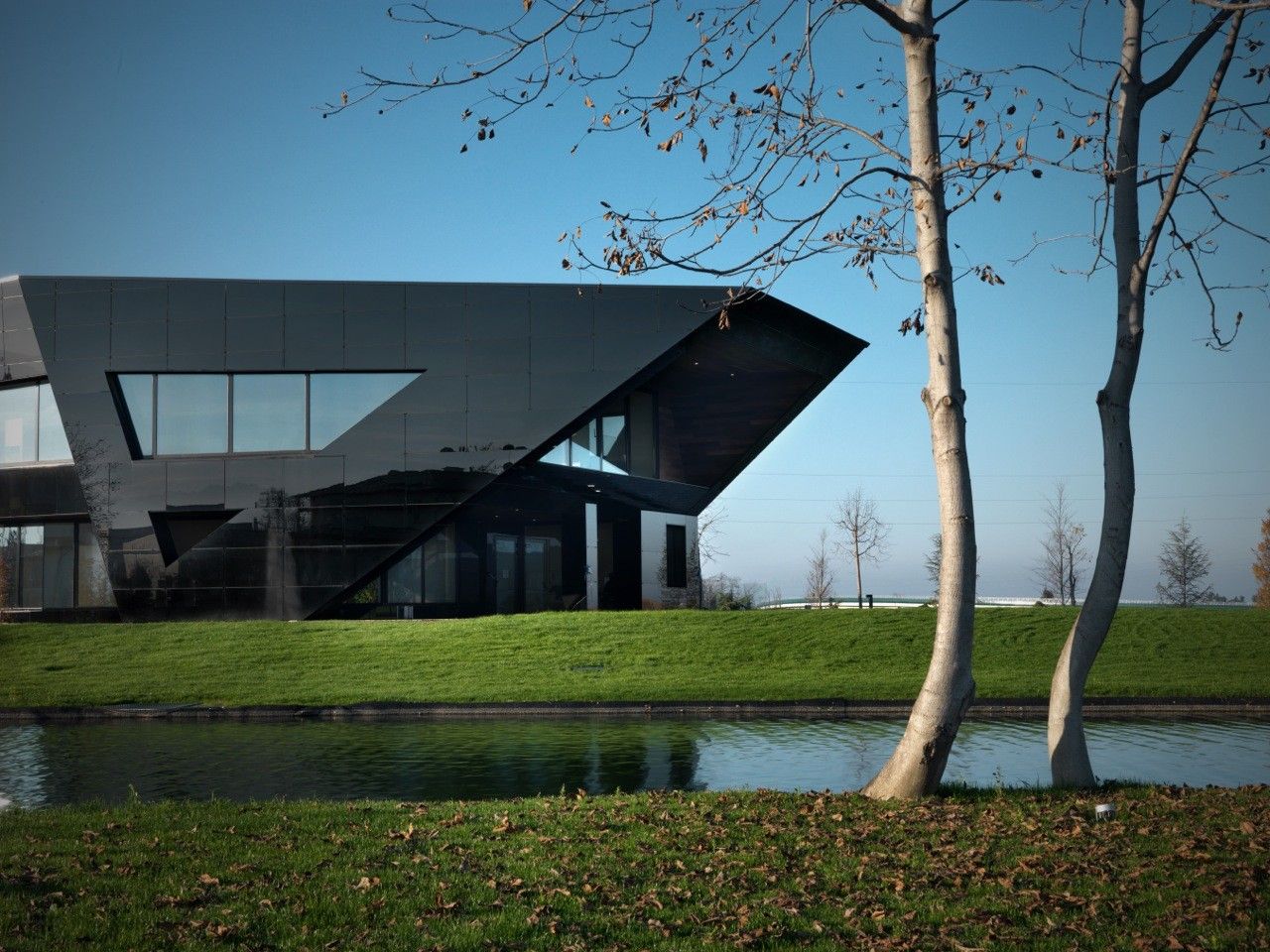 Designed by Damilano Studio Architects, Oficina Vidre Negre, for those not fluent in Catalan, means Black Glass Office, which very accurately describes the architecture of this building. The idea that is strongly observed within and around the structure is a reflection, making glass an easy choice of material for the façade. Reflection is one of those words that can be applied to a range of topics and interpretations. In this case, the smooth glass cladding of the prism hopes to reflect the surrounding park environment onto the building, which is also emphasized through its shape inspired by the landscape