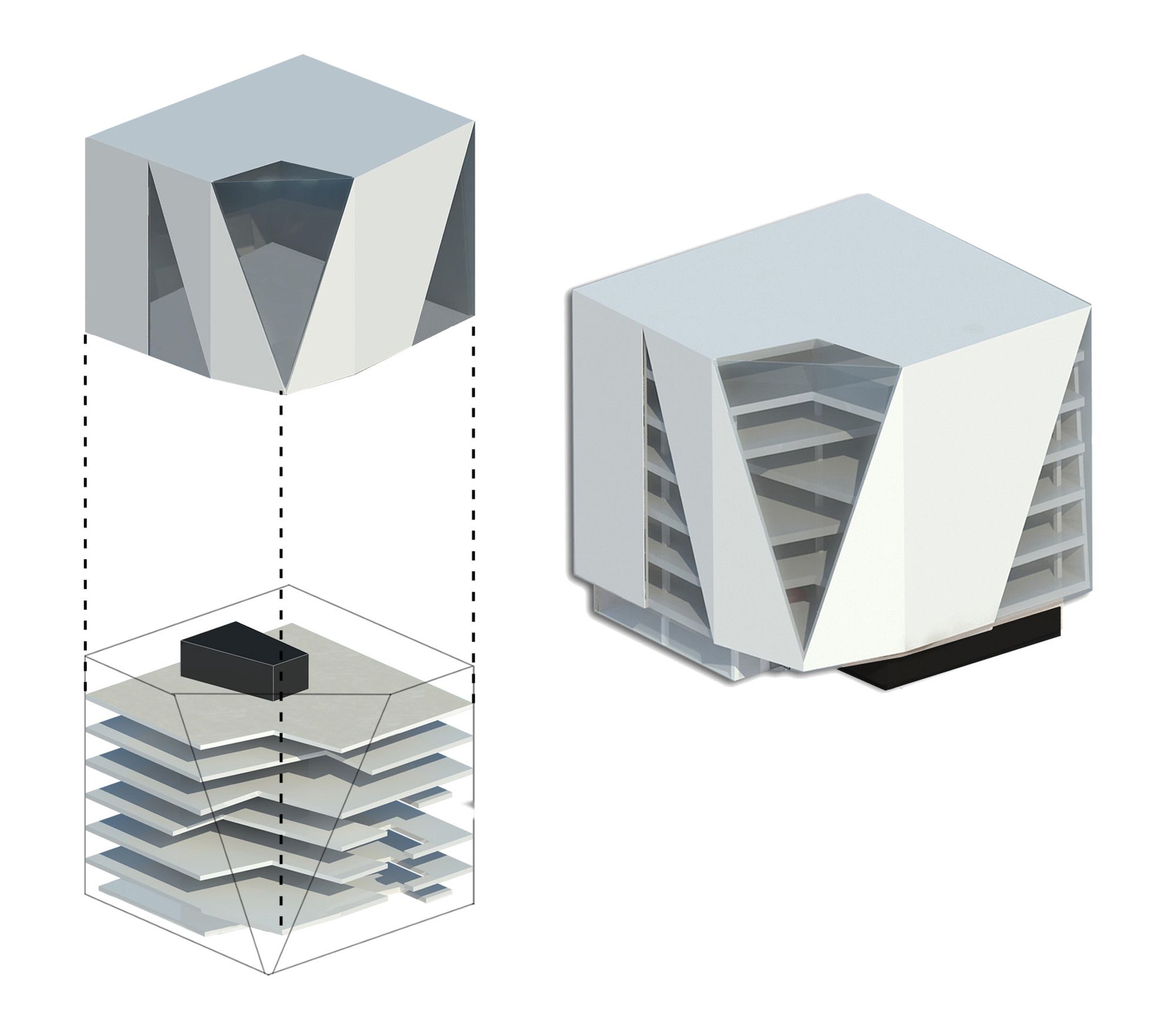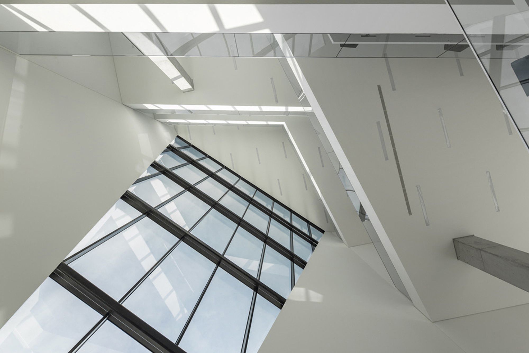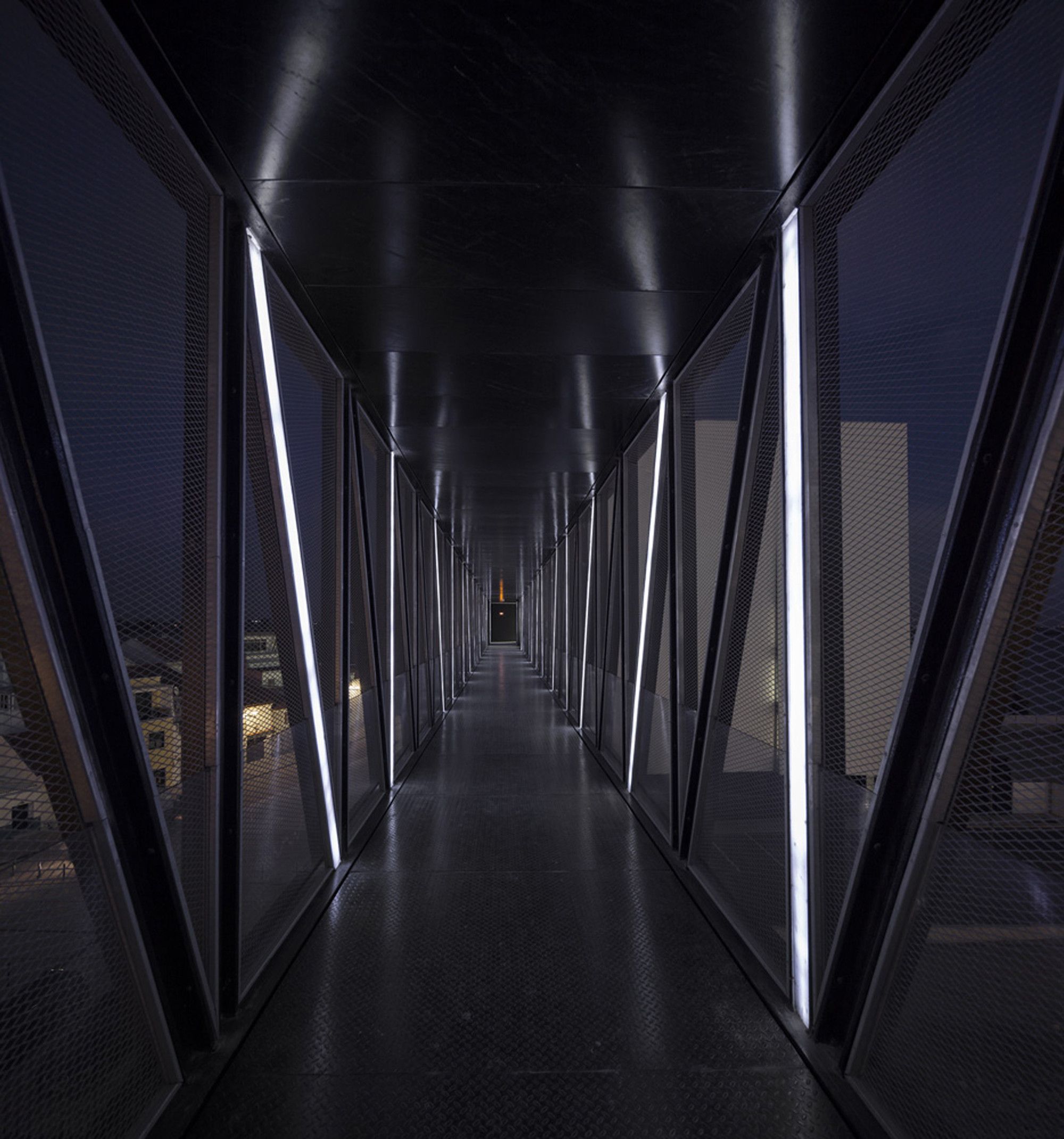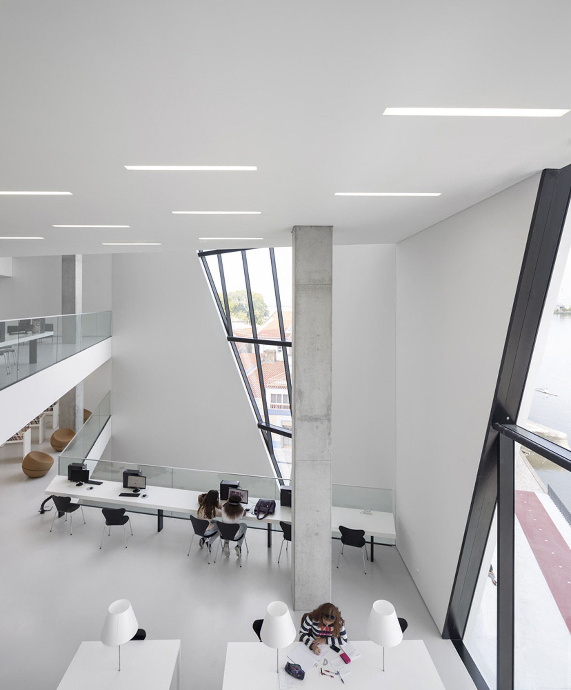 This overlap draws a markedly vertical void that becomes the reference element in the spatial concept of the library. This “vertical space” is reinforced by a large triangular window common to all floors, key to the communication with the outside. This spatial concept allows a greater relation between the users, allowing each to see and be seen, becoming both spectator and actor.