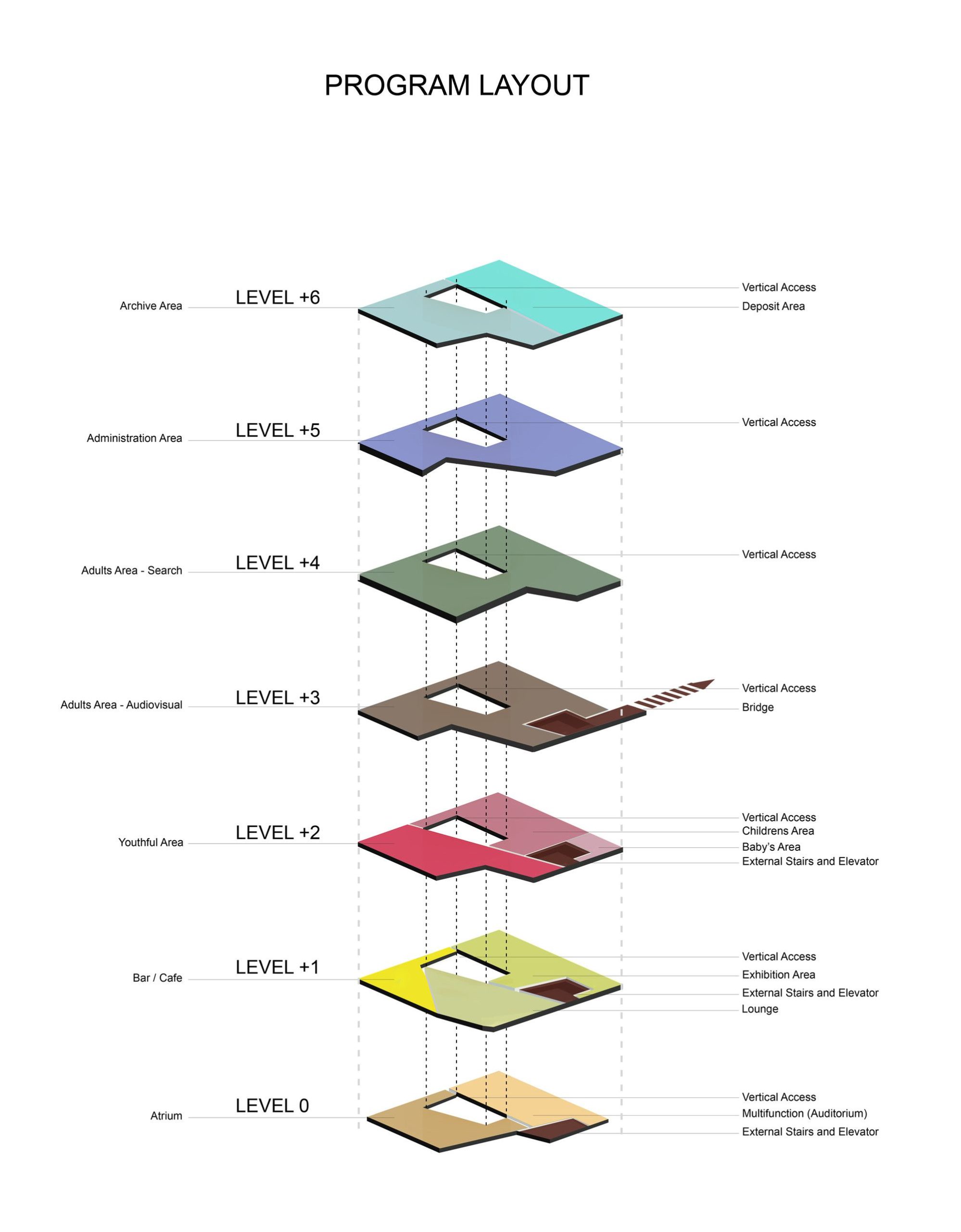 In this sense, we went beyond the traditional reading and media consultation areas of more formal or casual character (newspapers or magazines) outside the areas considered of significant size for children, cafeteria and exhibition hall. We also designed a multipurpose space on the ground floor that can be used as an auditorium. In order to be able to contribute to a greater and more effective relation of users with the space, the different floors are overlapped in an intentionally staggered manner in order to ensure a clear visual contact between them.