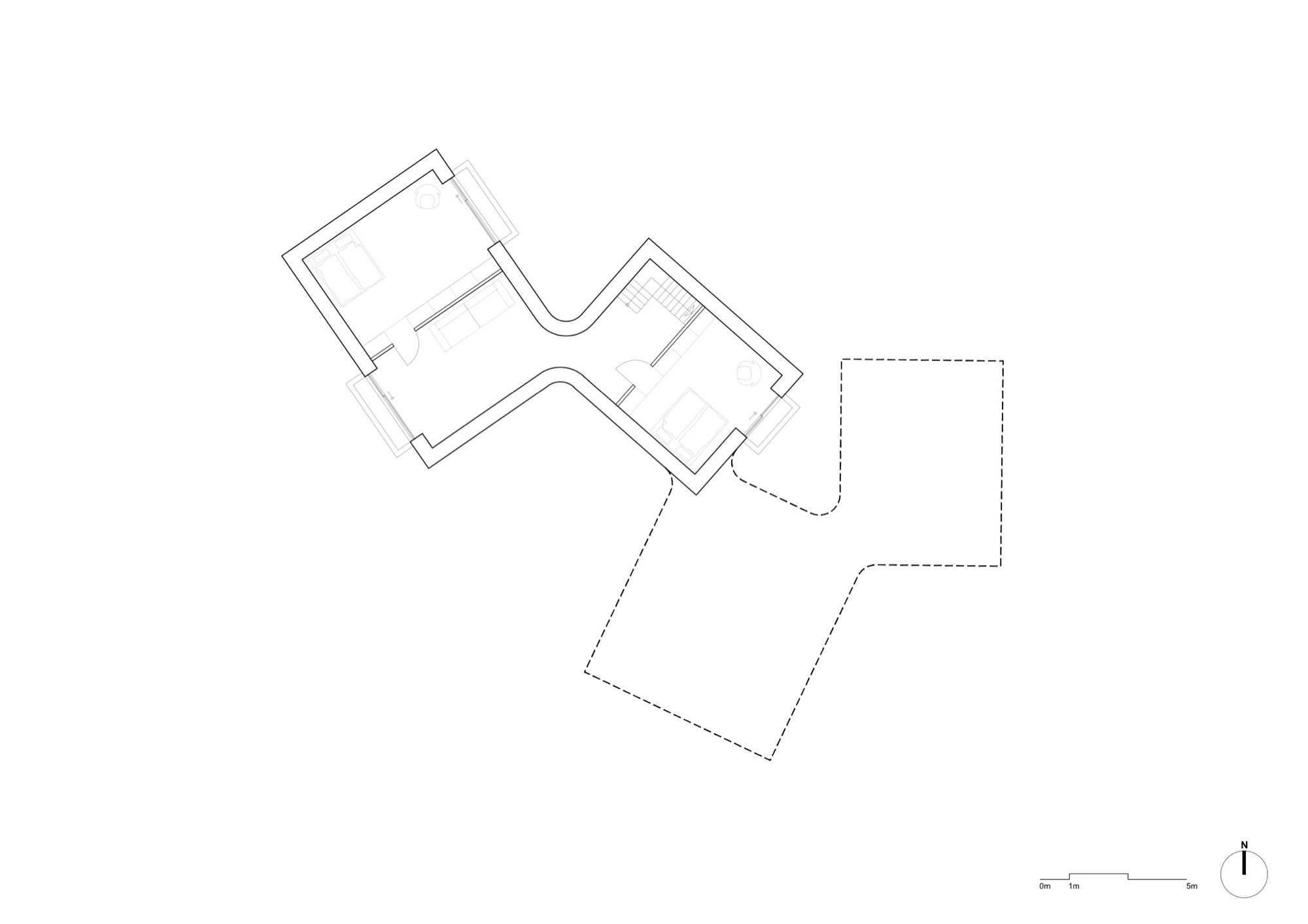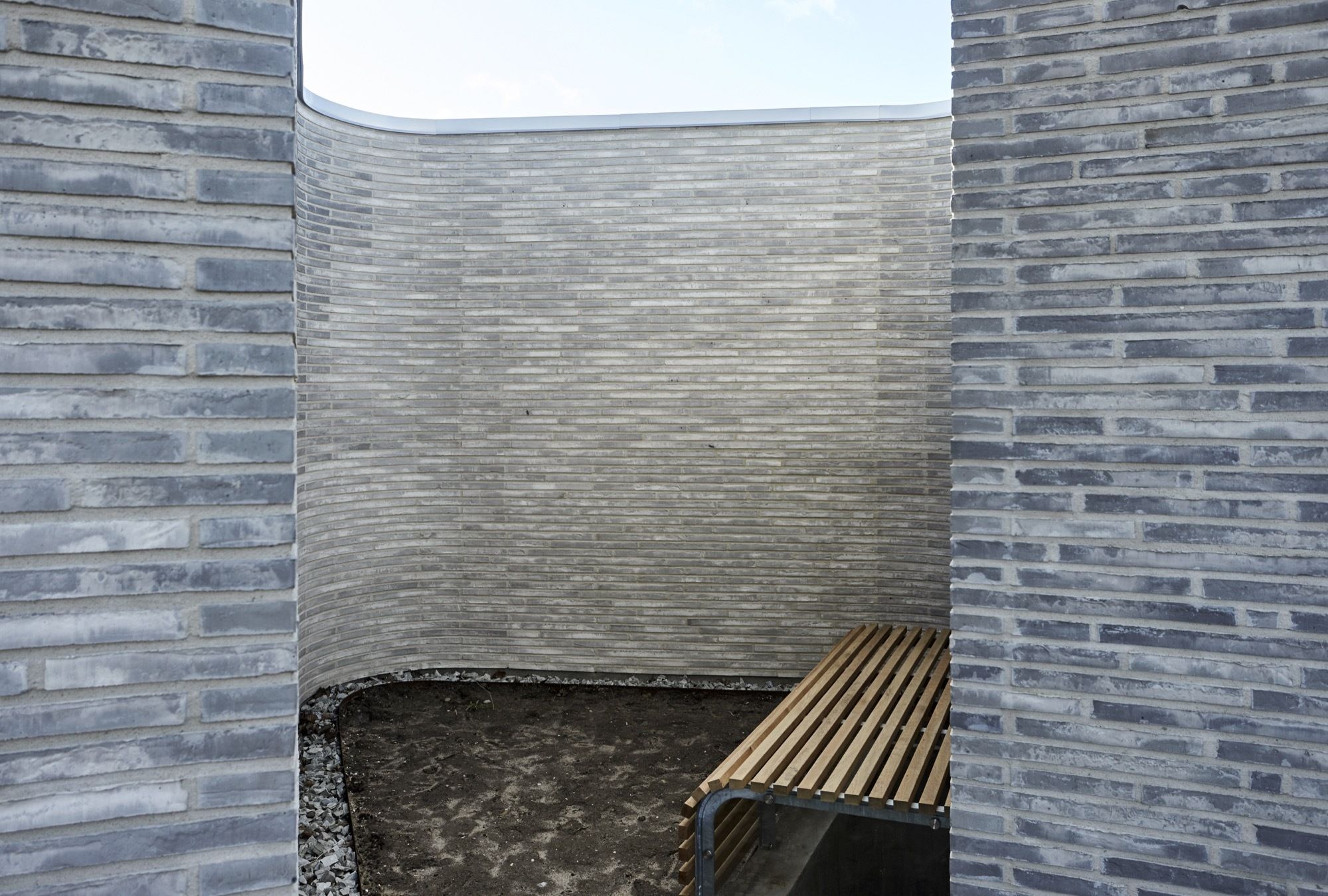 Curved white walls and broad plank floors melt the interior spaces together. All individual rooms have a contrasting end wall with handmade built-in furniture: a bookcase spanning an entire wall of the living room, a customized kitchen, a lamellae wall in the entrance room providing access to the basement and a wardrobe, and finally a full cabinet wall in the master bedroom with access to the bathroom. The basement provides three guest rooms as well as a TV-room, all lit by natural daylight from light wells. Oak benches along the facade cover the light wells. The garden surrounding the villa resembles a beach meadow as one find them in the natural habitat close by with shale, low trees, and wildflowers.