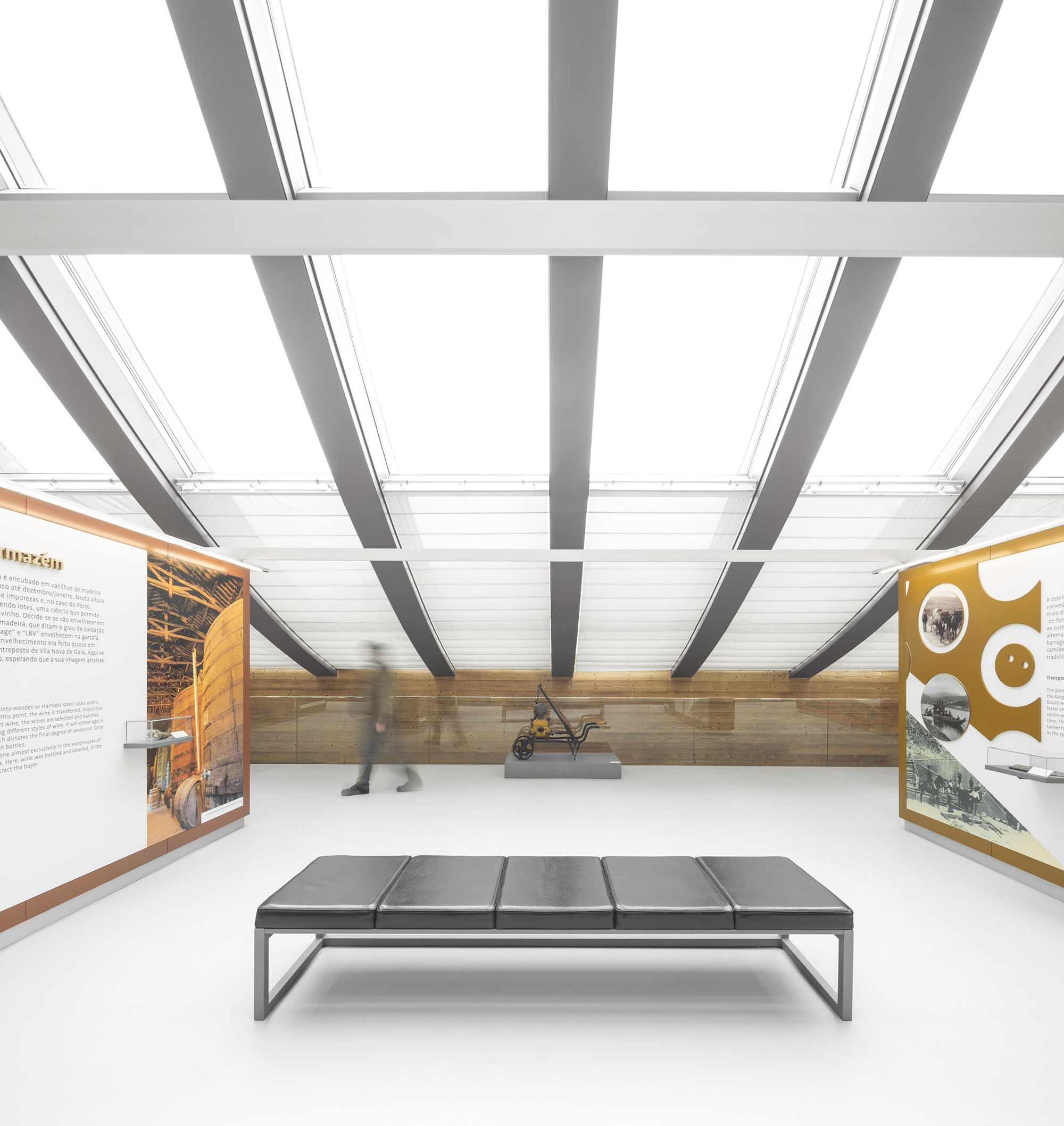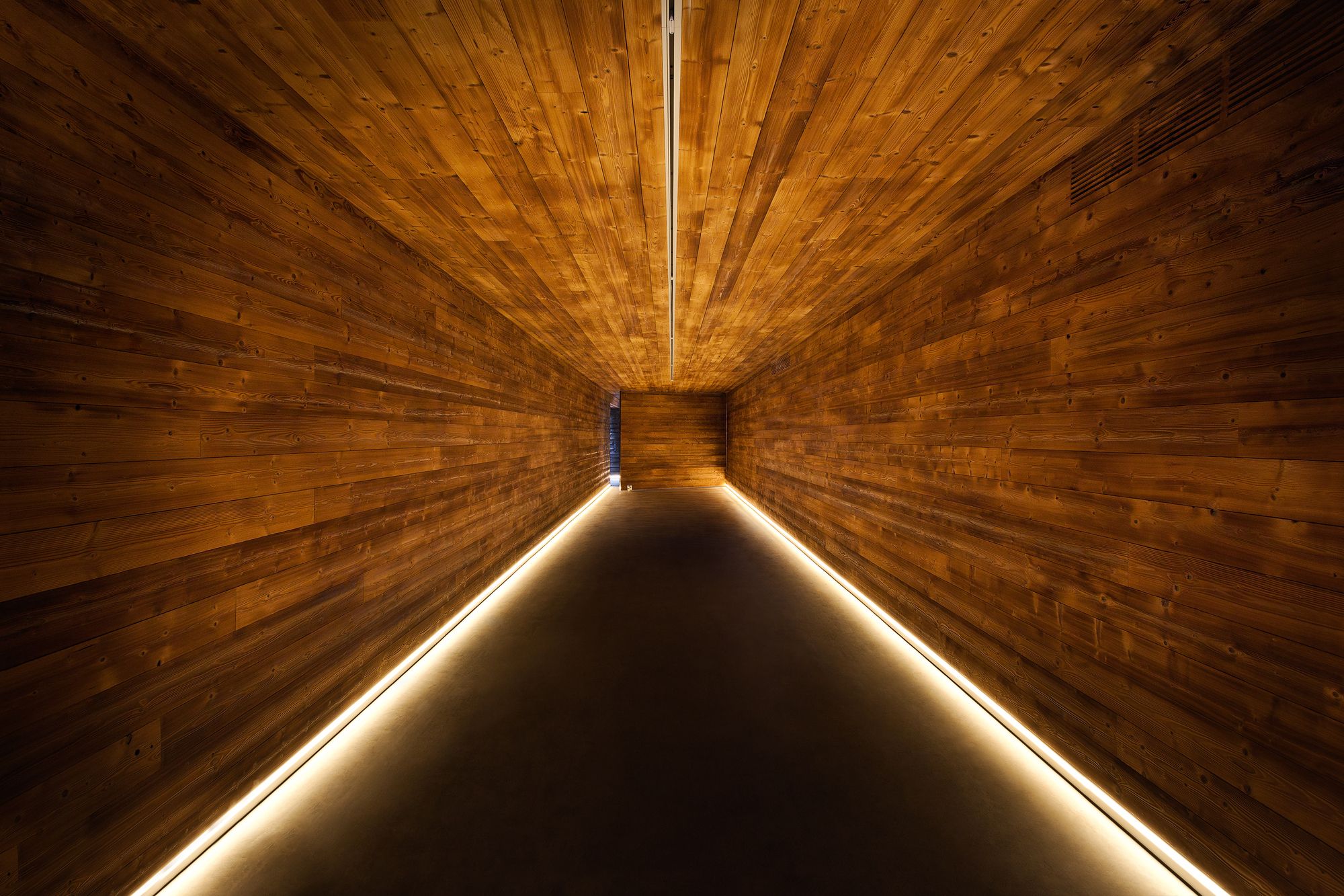 The entire space becomes unified by sunlight filtered by a concave glass steel structure covered in brown zinc, and by the contrast between textured wood and raw concrete walls. The building materials and construction methods are simple traditional wall building and woodworking, which reflects the austerity of the region.