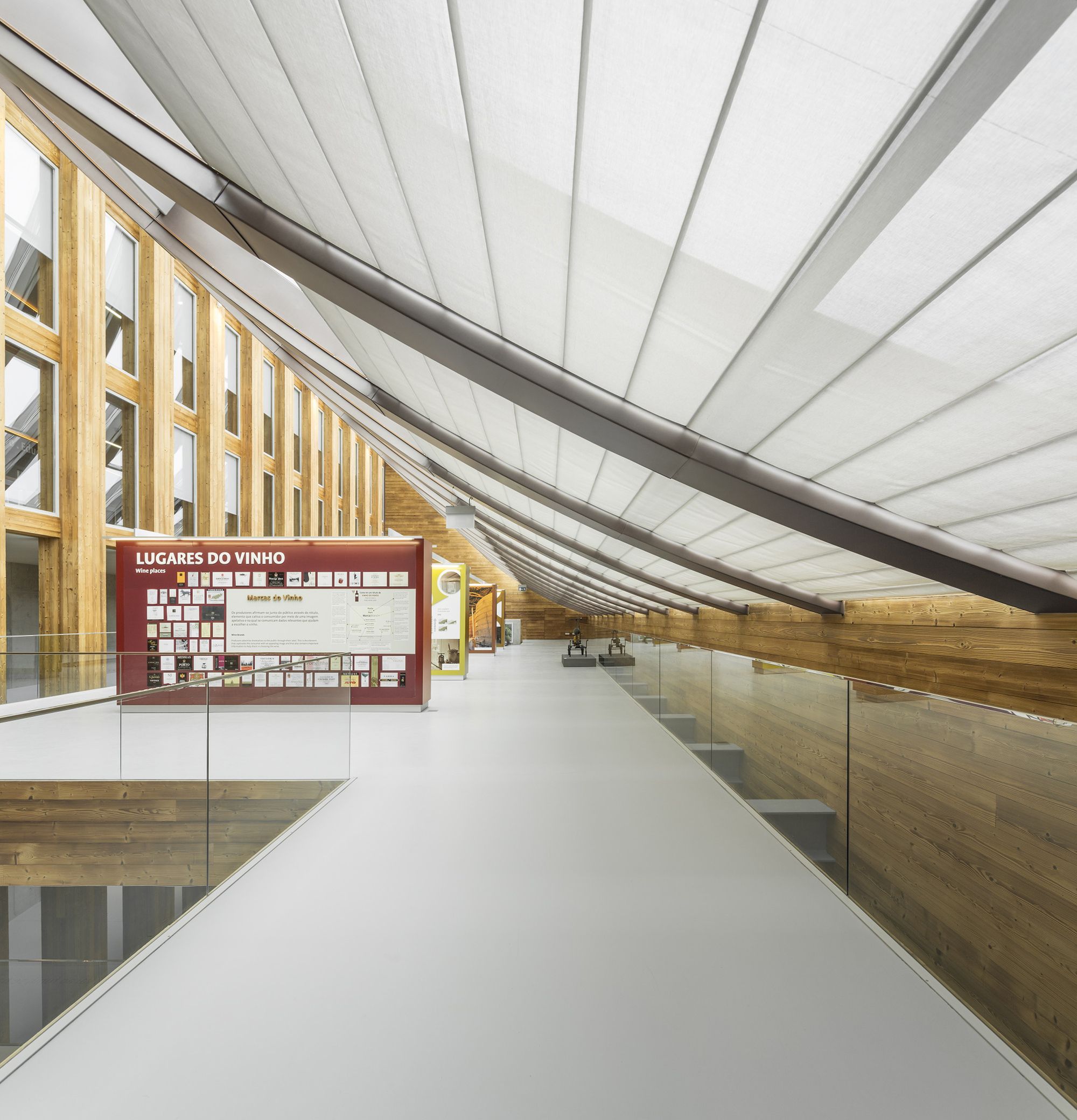 Located near the town center, the museum arises as a half-buried building, behind a nineteenth-century wine press building. Restored and included in the museum main exhibition, the winepress is an independent construction capable to produce wine in an archaic way. Has also a temporary exhibition gallery. The main building is distributed through a vertical arrangement of six floors. The exhibition spaces are developed between tunnels and galleries where the contrast between light and shadow is explored in different visual relationships provided by gaps between floors.