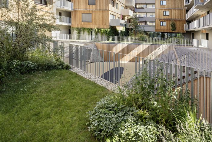Landscape and Space. What is known as the canyon, an area with several changes of level and seating steps at the heart of the complex, offers all the residents an opportunity to meet there and experience community. It serves as an encounter space and a playing area for young people. At places, the wooden cladding lining the walls of the ramp grows out of the wall and forms sloping surfaces to lean against or clamber up. Large horizontal surfaces are connected with the wall and form areas to lie on or to use in different ways.