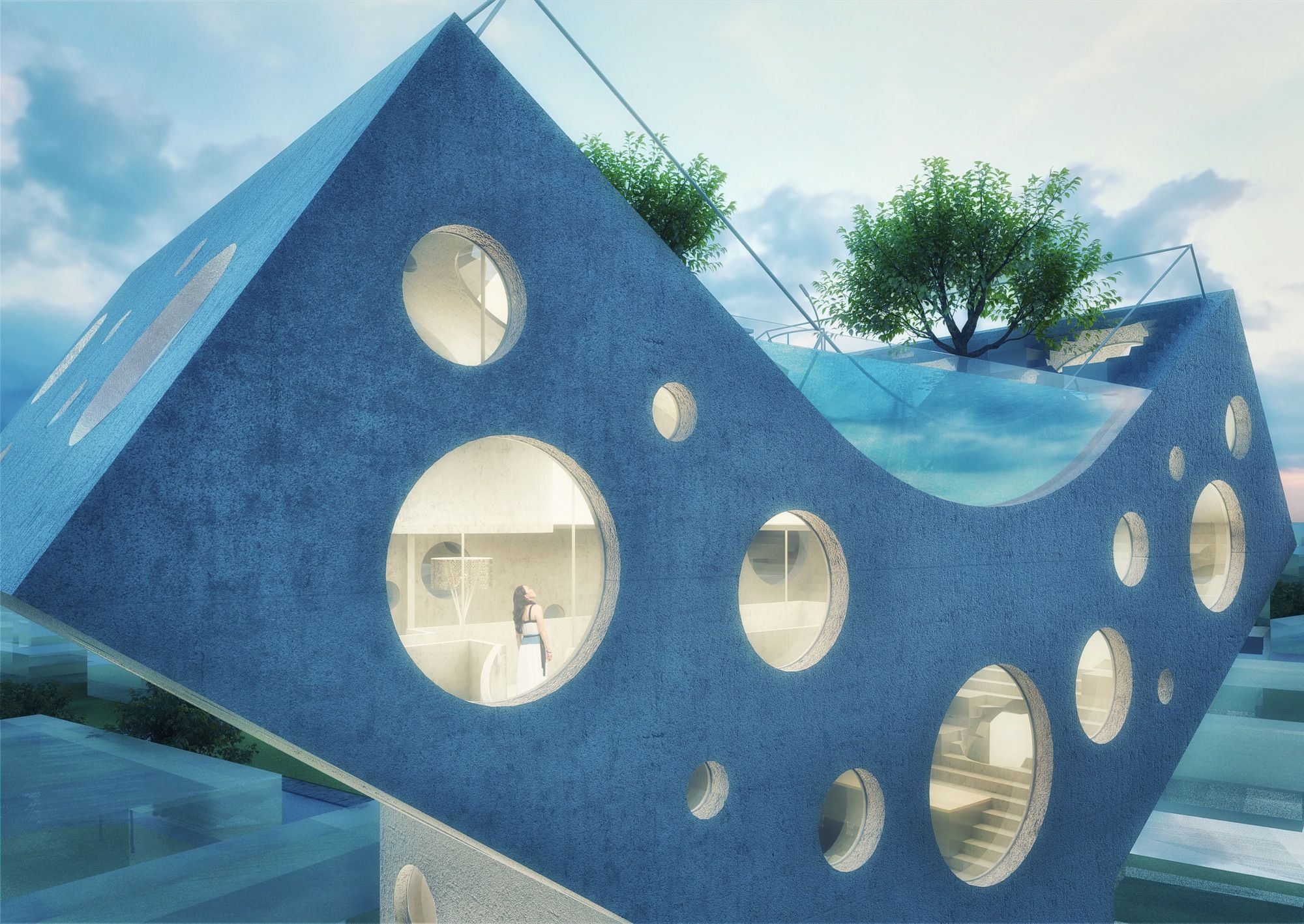 This 330m2 villa looks out onto its surroundings with living spaces raised up on a four-floor stem. On the rooftop is a private swimming pool that takes the building’s prime location, cradled in the dip of the Y-shaped structure. The villa sits within a tranquil pool with small gardens and stepping-stone pathways, the positioning and orientation of which is all arranged according to the practice of Feng Shui. Large, circular windows puncture the concrete shell of the building giving light and airy interiors without interrupting the Y shape of the villa.