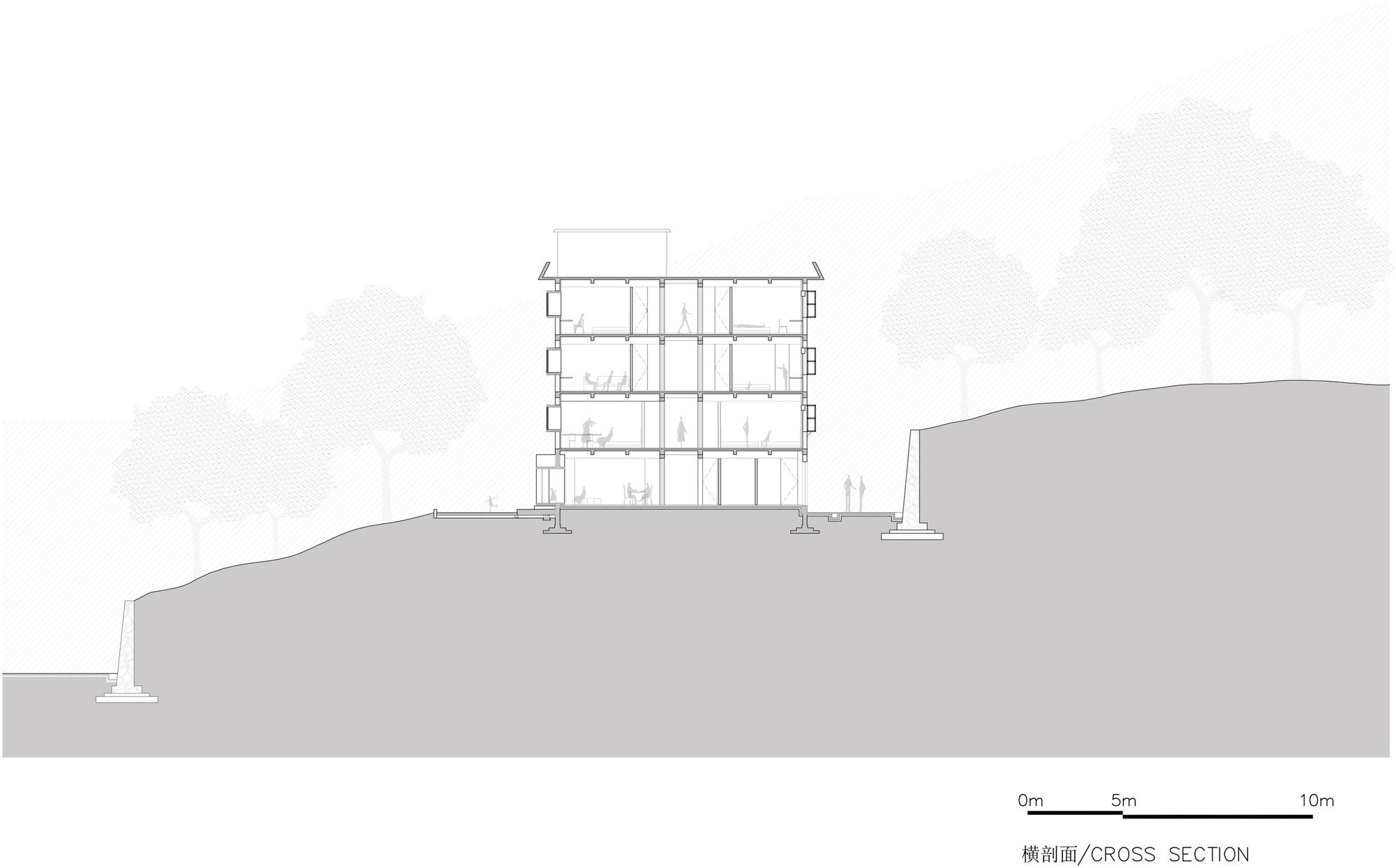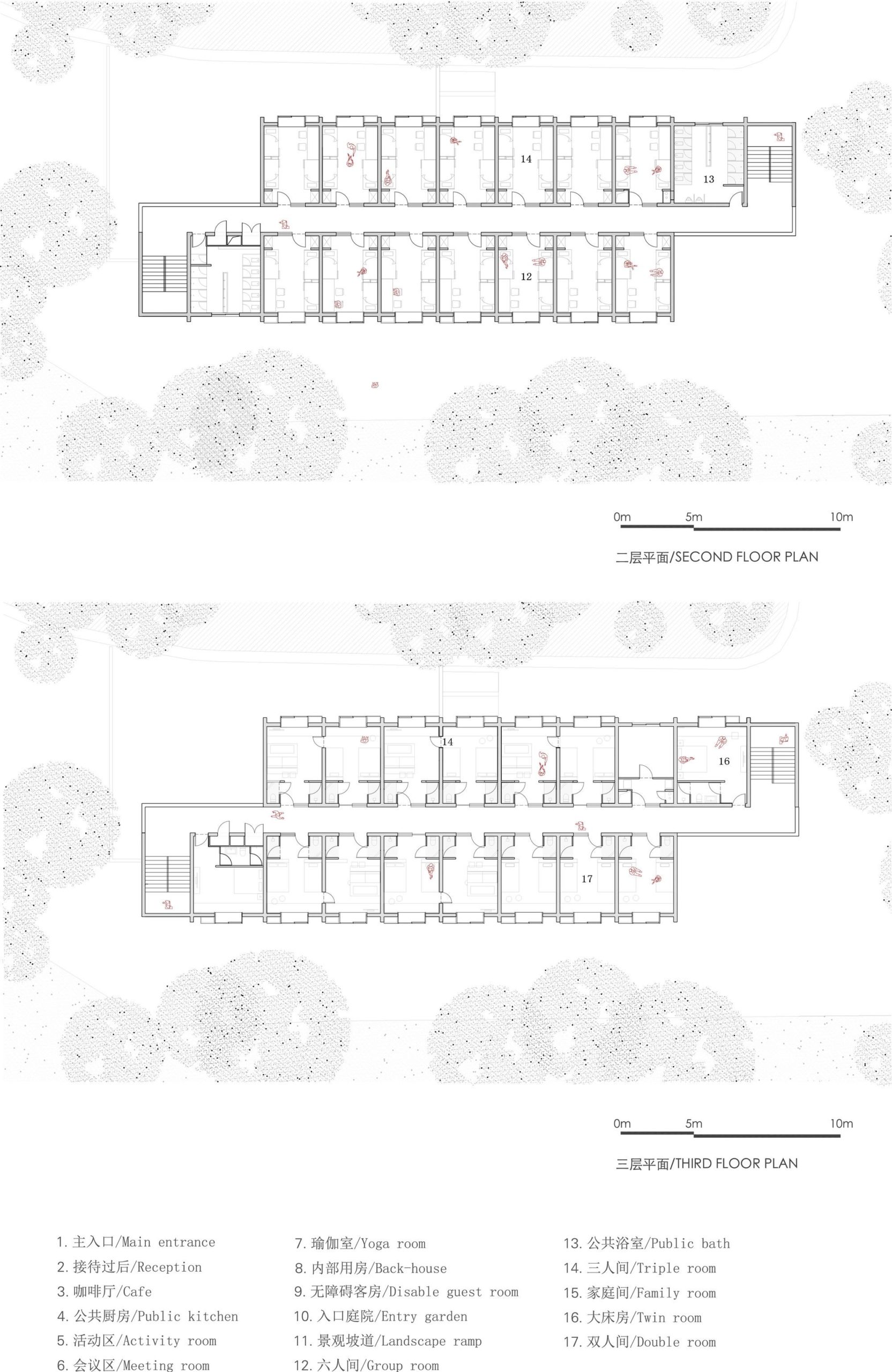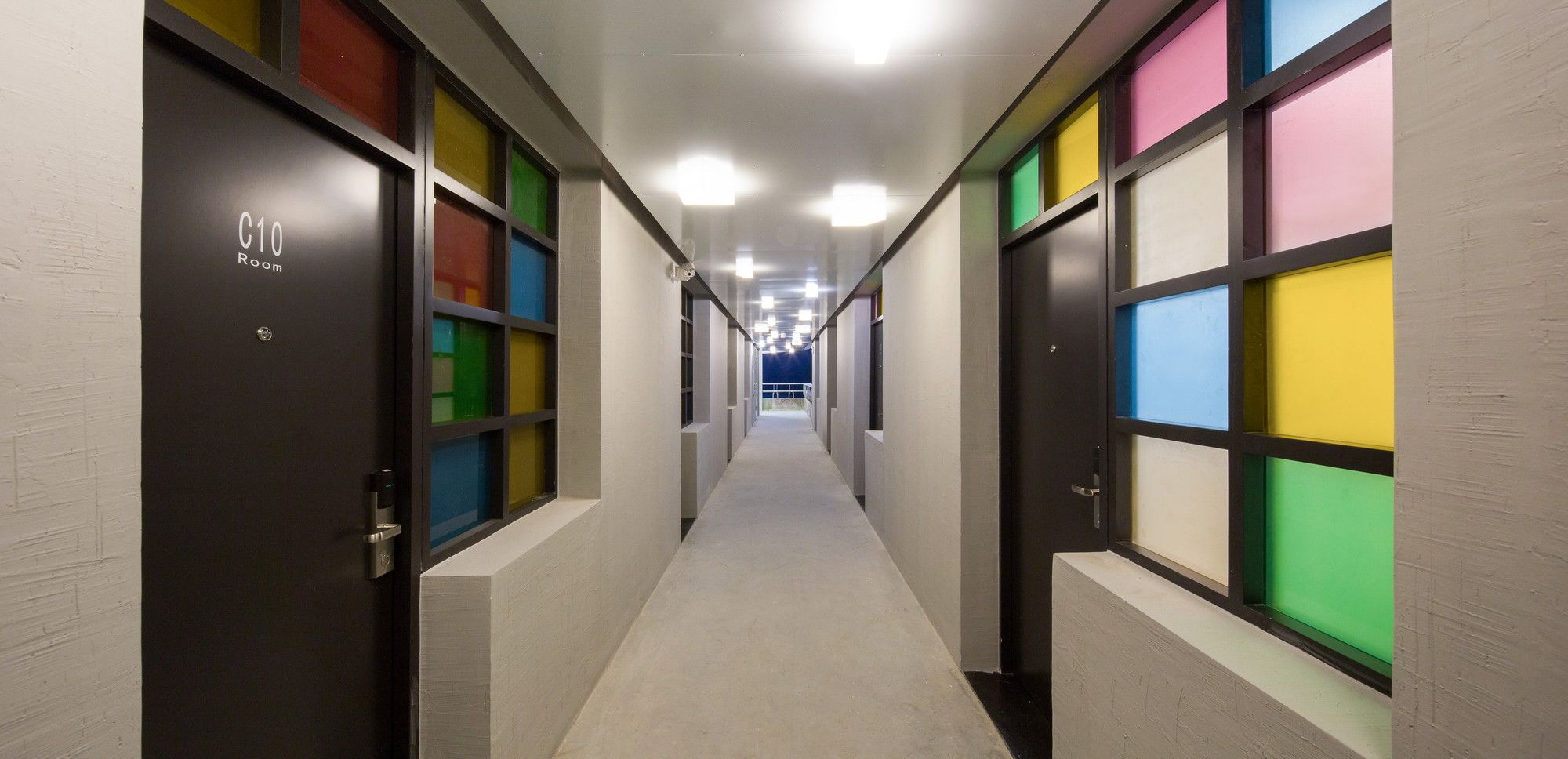 The renovation process mainly consists of two spatial actions: firstly equipping the central corridor with new hotel infrastructure to facilitate the new living units, and secondly installing a sequence of prefab steel opening box on the existing facade to create a more dynamic interaction between the building and the surrounding nature. The ground floor functions as a multi-purpose social space with a variety of facilities containing reception, cafe, open kitchen, and common space. By a subtle alteration of the original structure, this handful of functions dynamically relate to one and other.