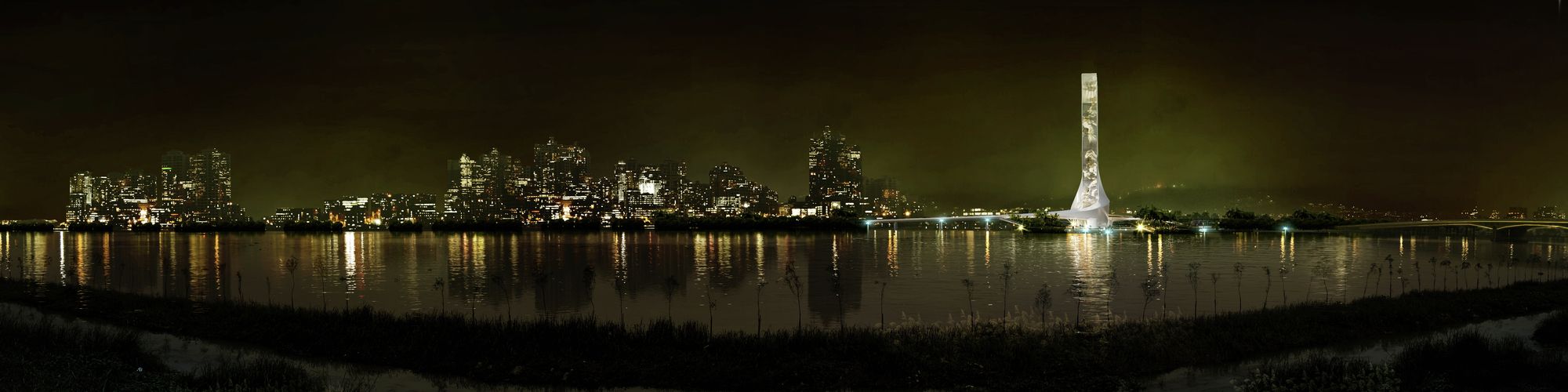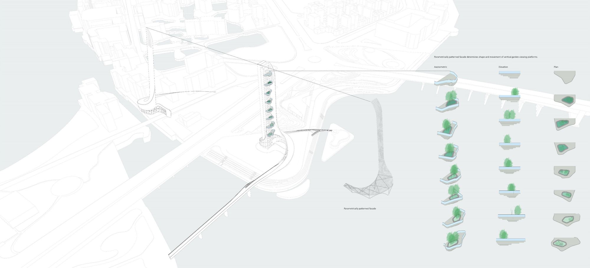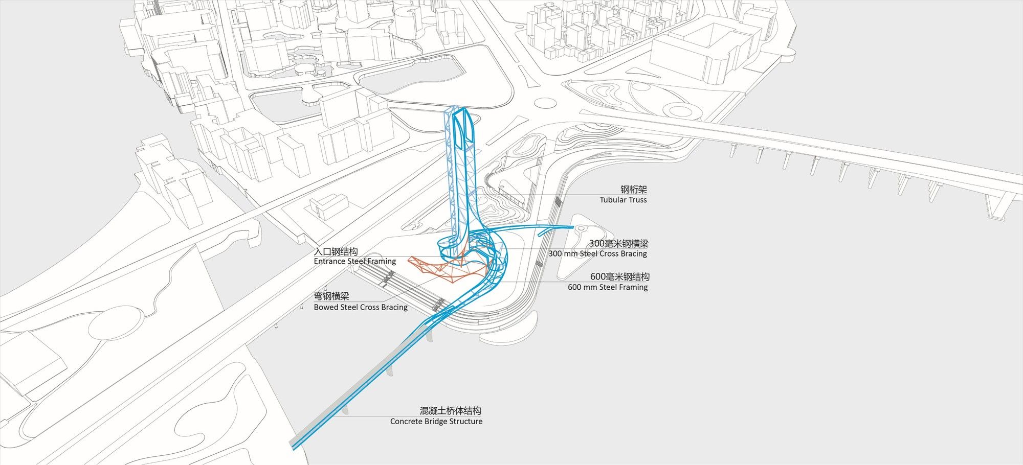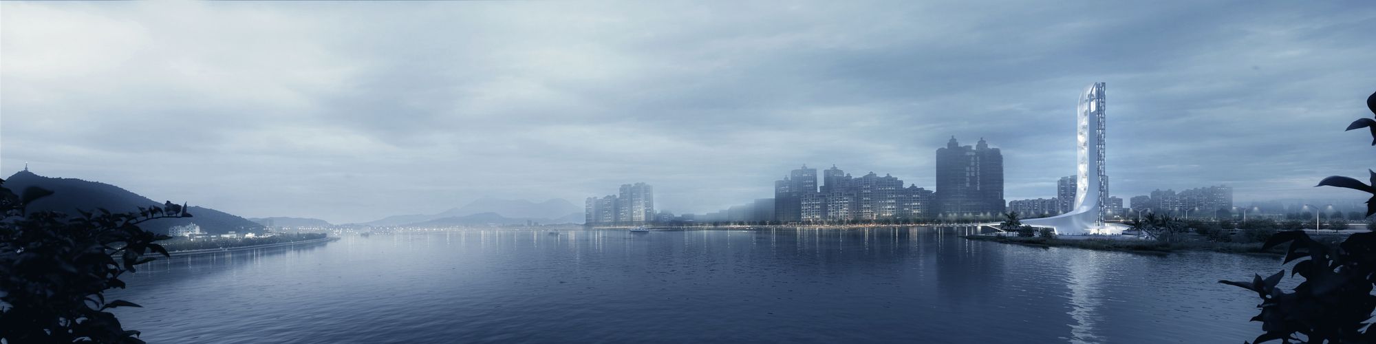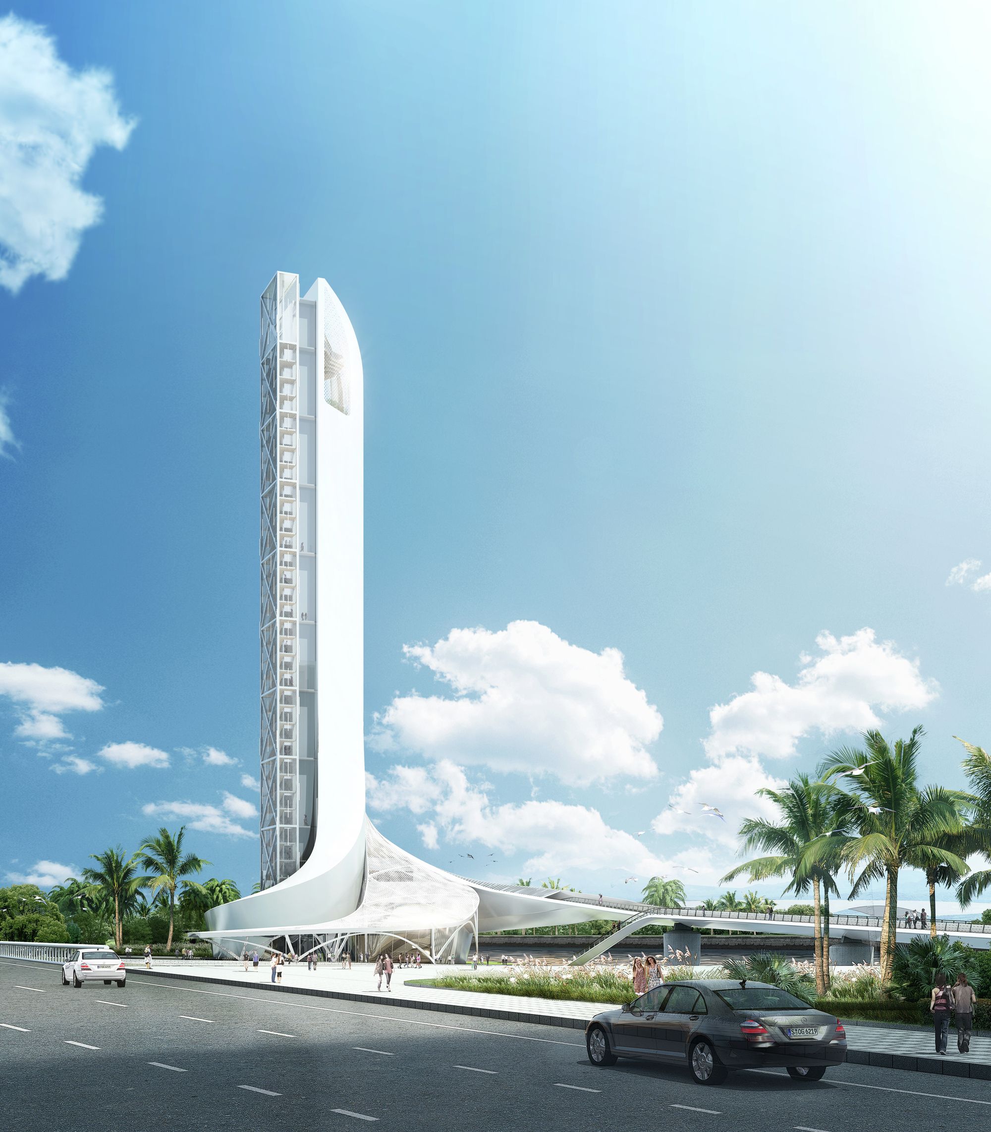Zhuhai Observation Tower is located at the junction of two rivers, hence, forming an intersection of neighborhoods. The tower mirrors, in its form, the beauty of Jianfeng Mountain across the river. The basic existence of the form is the architectural manifestation of the three roads or the three rivers that greet the mountain. The central, vertical element of the tower, is the culmination of the unity of three elements at the ground level, two of which would be bridges connecting a nearby island and neighborhood. The Tower can rightfully be claimed as a contemporary take on the Chinese Mountain and Water Painting, with a series of potted platforms and a patterned metal facade employed for the purpose of imitating natural habitat.