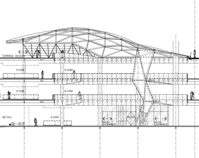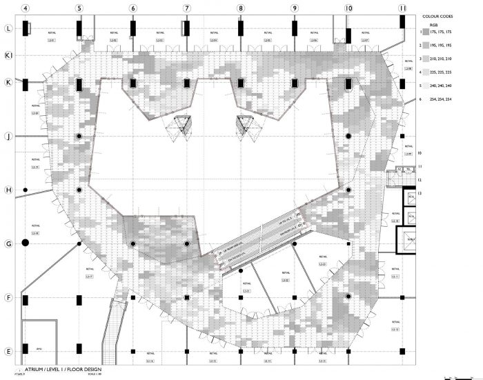 Part of the strategy of increasing the atrium void was to compensate the wider space with elements of interests within it. The design of large-sized balconies within the atrium is intended to either provide a support seating area to smaller F+B units or to accommodate small retail units. These balconies are supported by the main concrete structural frame and by the roof structural columns.