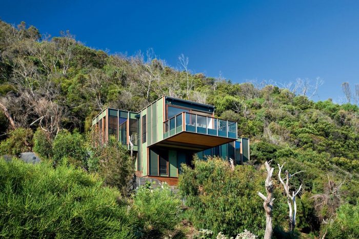 The Treehouse is an innovative two-story residence on a steep hillside at Separation Creek in Victoria, Australia. Space measures 2,368 square foot with the architects having sought the sculptural effect of a tree with branches. And indeed, the rooms cantilever in all directions of a central structural torso to really create this effect and offer entertaining and functional living. The color scheme is adjusted to the general concept of a habitat dissolving in the surrounding nature. The steepness of the site is what creates the engineering problem here, which is actually solved by a footprint’s minimization.