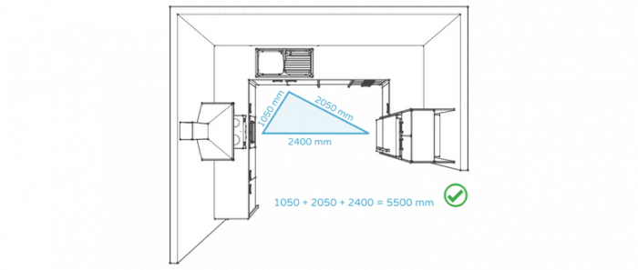 The overall length of the kitchen work triangle, which is the distance between the stove, refrigerator, and sink, shouldn’t be more than 7000 mm (23 inches). The perfect work triangle length is between 4000 mm (13′) and 6000 mm (19′). You might want to have 2 or 3 different zones if you have a big kitchen.