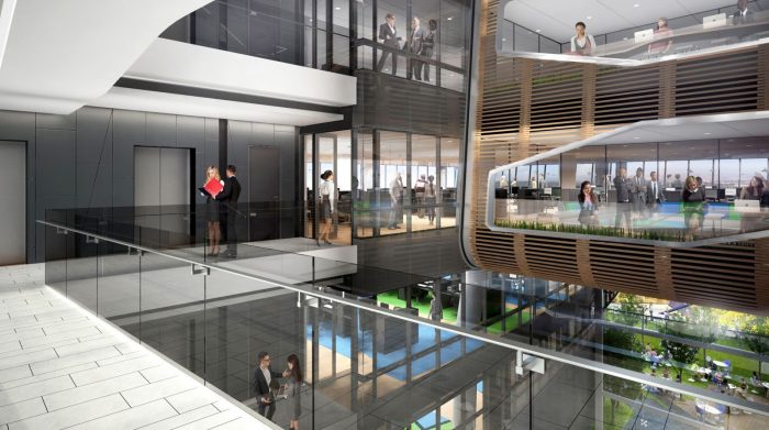 The two towers are joined by a clear glass roof which appears to wrap over the point of arrival, and seamlessly envelopes both the atrium and the pod-like structure which houses the five linked floor plates. The edge of this floating pod is open to the atrium, and this zone is activated with pause areas and collaborative workspaces.
