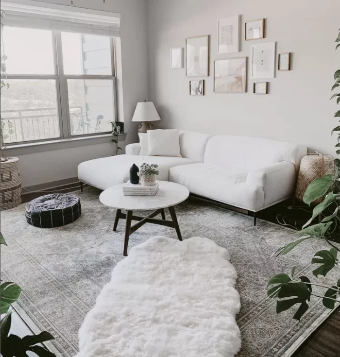 Here, nothing is fancy or trendy: white rug, white walls, and white furniture create a calm, cohesive foundation. A gallery wall and darker wood accents bring depth while the bright, fresh palette makes the room feel much larger than it is. Thoughtful lighting can boost that effect even more—layering different light sources at various heights is one of the best interior lighting tricks for transforming spaces.