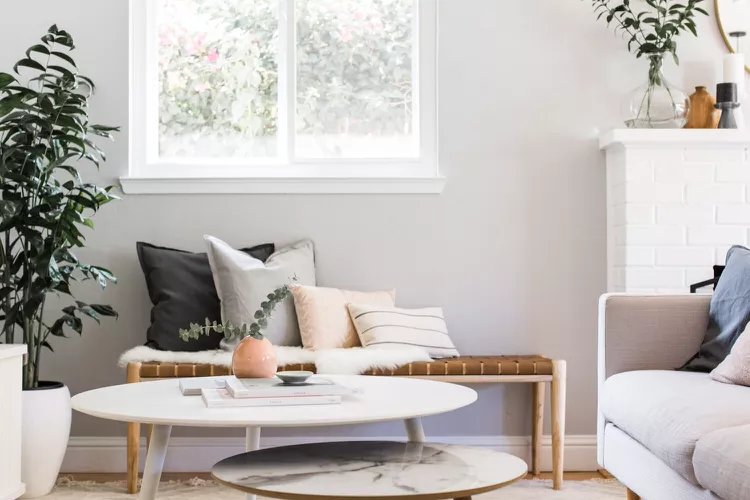 This Simple Scandinavian living room masters the theory that the devil is in the details. The living room design features marble round nesting tables, a woven bench with many pillows for comfort, and a colorful potted plant in the corner.
