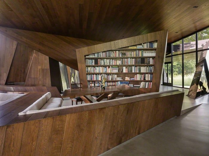 Created for a client that wanted a mixture of the avant-garde and the cozy, the tour-de-force is clad in mirror-finish, bronzed stainless steel. Studio Libeskind specified the cladding to accentuate luster and exaggerate the changes of light and season. The interior is solid stained white oak.