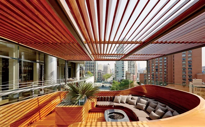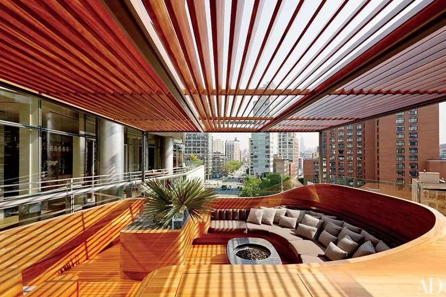 This Manhattan condo features an open living room made of actual wood and comes equipped with a fire pit specially crafted for the space.