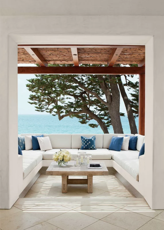 A low table of oak joins a couch on the private study terrace of a house in California designed by Atelier AM. The banquette features cushions made of outdoor fabric by Perennials and patterned pillows made of old textiles.