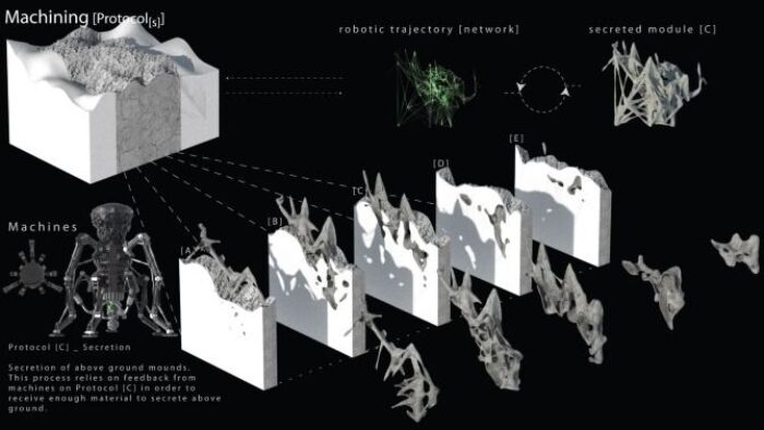 Teams of robots would be the first to arrive on the site: our moon’s Shackleton Crater. Here they begin burrowing and mound building. The process would be one very similar to that which ants and termites undergo in the formation of their nests. Material is removed, creating a network of underground ‘towers’ which would act as shelters from radiation, impacts and temperature swings. The removed material is then taken by another type of robot and excreted to form mounds which grow vertically as new ground as well as habitable space.