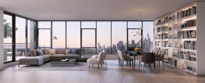 Units, in contrast, feature muted palettes—and are, per usual, elegantly appointed. Wide plank white oaks floors lay beneath soaring ceilings, circumscribed by floor-to- ceiling glass windows and doors. Powder rooms, secondary baths, and master baths are outfitted with Italian marble, imported porcelain, and white honed marble, respectively. And eleven light-filled penthouses boast panoramic vistas reaching from the Manhattan skyline to the Verrezano-Narrows Bridge.