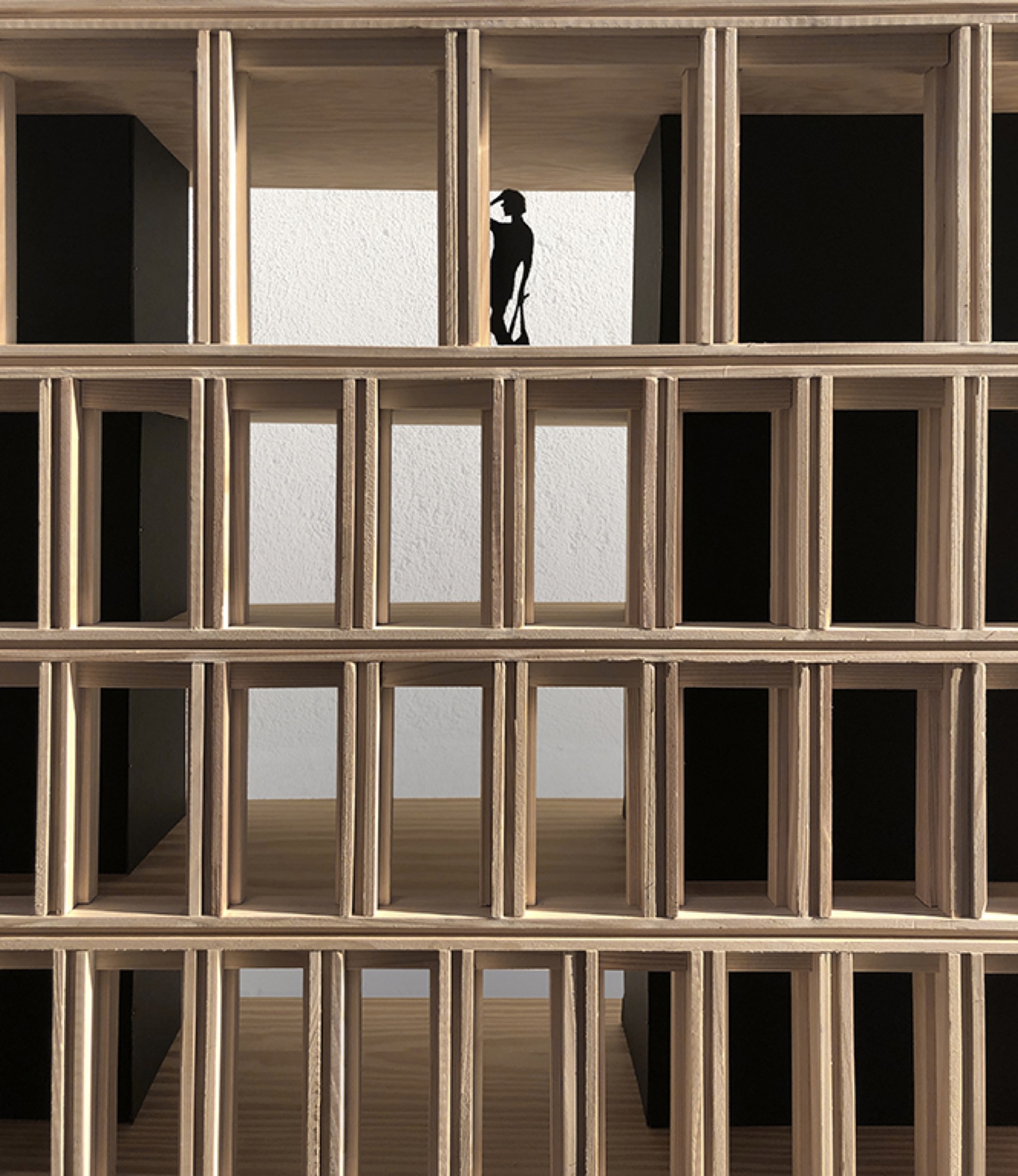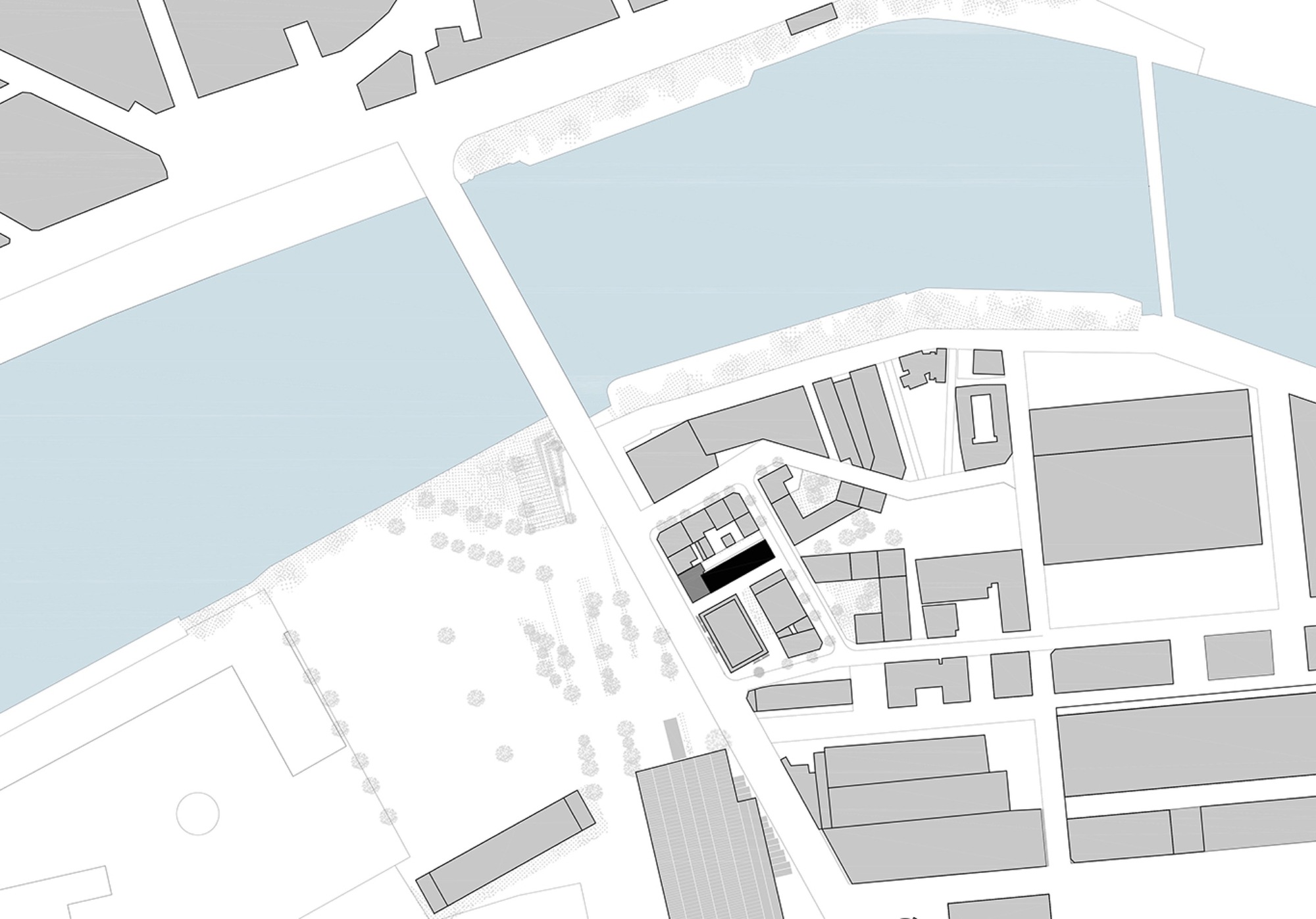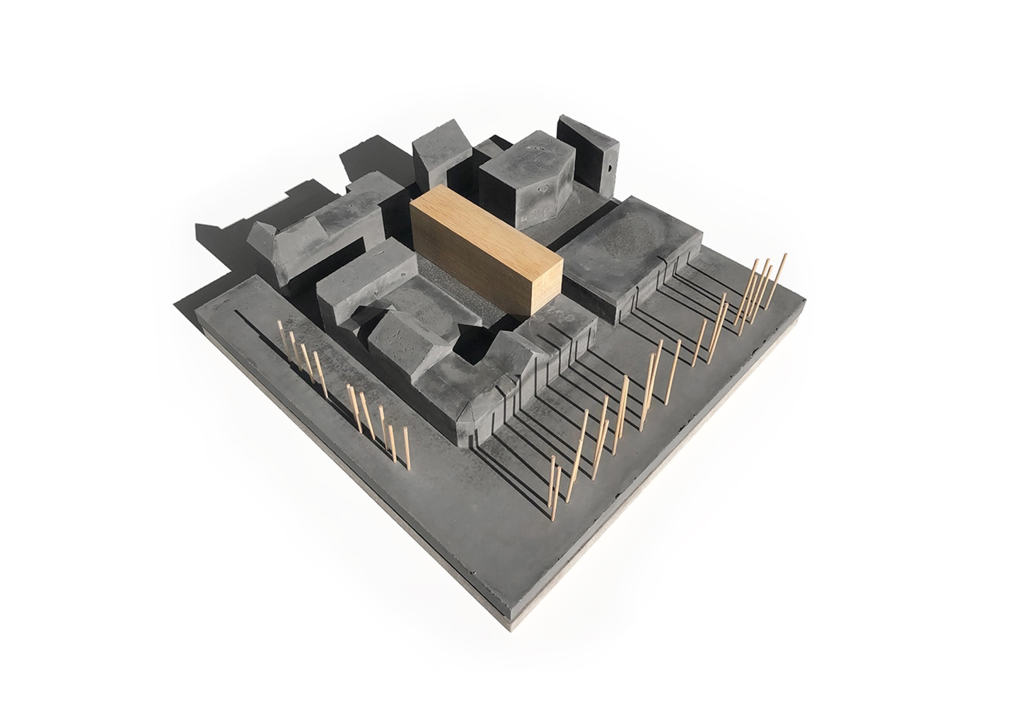 A soft insertion by taking the low volumetry of the townhouses and the Blockhaus on the boulevard. A soft insertion by using materials already present on the site such as dark concrete and wood. A soft insertion by working a massive and hollowed base where shops and halls will slip into.