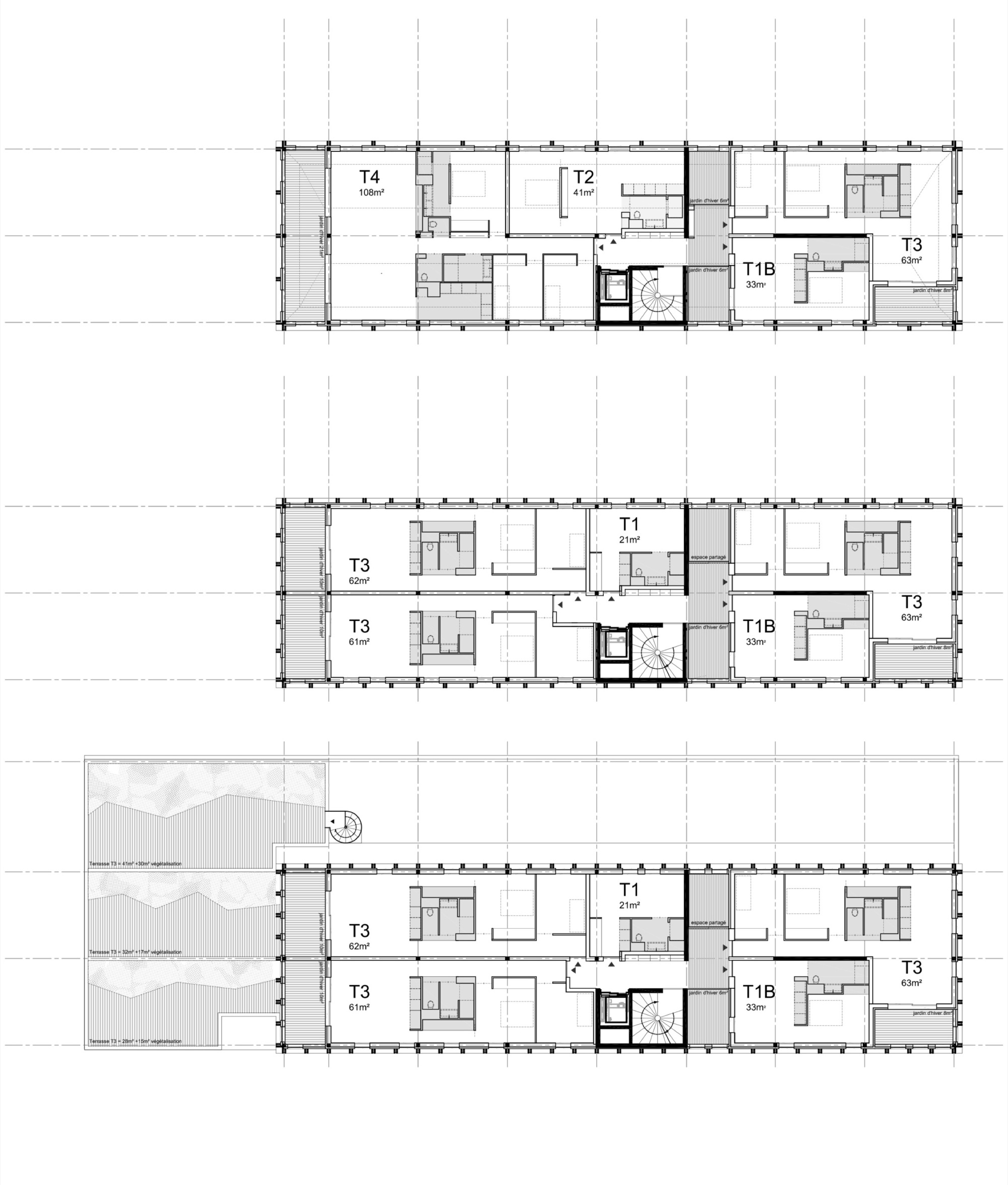 A strong architecture by adopting a principle of progressiveness in height and width of the windows to assert a building soaring towards the sky, thus increasing its verticality. A strong architecture by containing all the exterior spaces of the dwellings in the built volume by the creation of winter gardens. A strong architecture by offering housing with very open functioning and multiple uses around a wet core, offering everyone maximum appropriation. A strong and demanding architecture so that everyone can live the softest possible life.