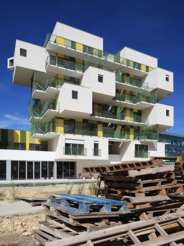 28 Social Housing In Paris designed by KOZ Architectes, The complex comprises 28 apartments, a shop, business premises and a basement for parking. Reinforced concrete structural system. Coloured high-density laminated panels. Rain-water collection, planted roof, heated flooring, external wood/ aluminum joinery, loggia and private walkways for all apartments.