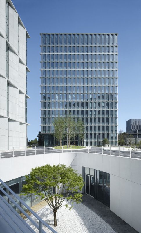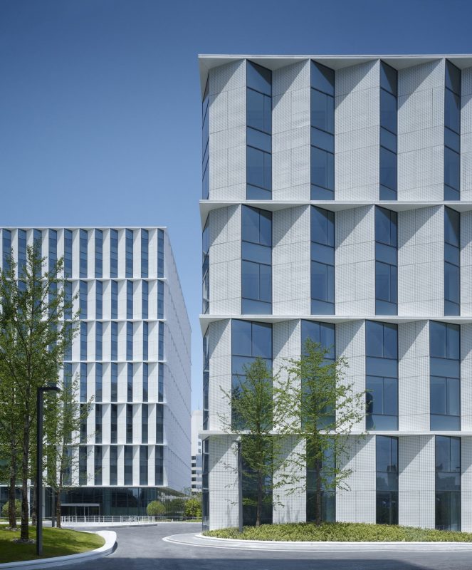 The 3 Cubes office building designed by gmp for the Caohejing Business Park in the western part of Shanghai have now been completed. The office building complex with service functions in the basement floors has a total gross floor area of 60,000m2 and consists of three cubic building volumes with different heights of between 35 m and 60 m.The gmp design places particular emphasis on the character and elegance of the ensemble. To this end, an important role is performed by the facade, which features a special design also in terms of technical detail.The white building volumes have an austere elegance and, with their vertically oriented facades, blend in with the surroundings while nevertheless – in their overall composition – contrasting with the very heterogeneous urban ambiance. The interaction between harmony and contrast is replicated in the design of the exterior surfaces.
