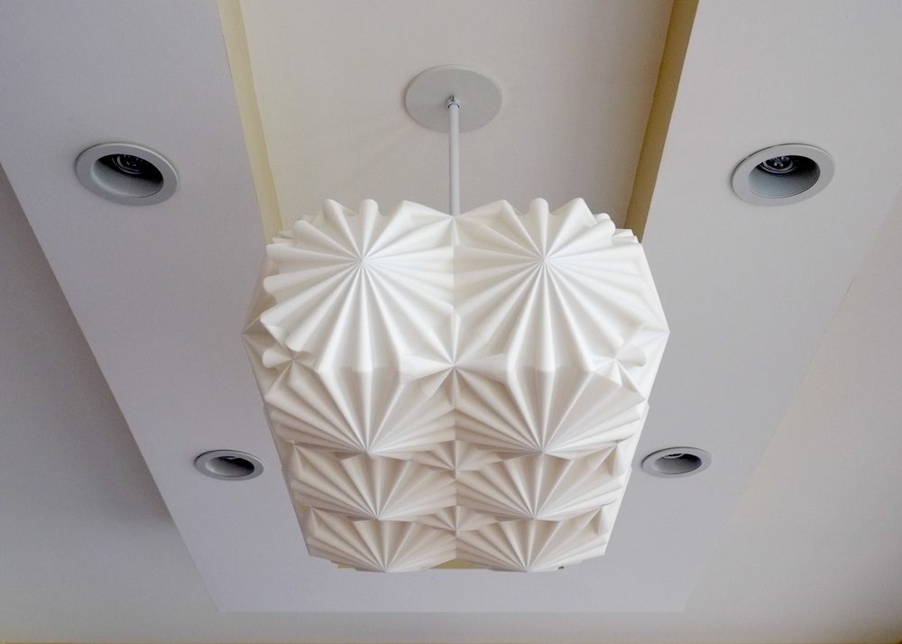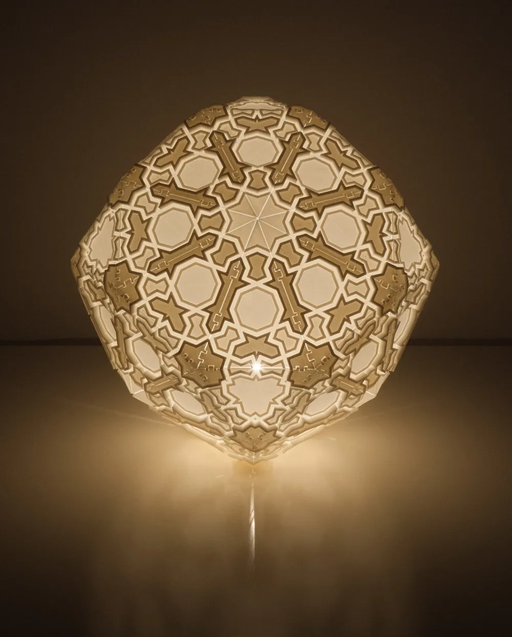 Through his artwork, Debbane has created designs which have a near sculptural quality to them. Sections of the lamp design are printed in ABS plastic and partly in Nylon, their thickness depending on the amount of light that needs to pass through the lamp to re-create the geometric patterns. In an unlit mode, the lamps are reminiscent of ancient relief sculptures, whereas in contrast, upon illumination, the intricate tessellations are dramatically revealed.